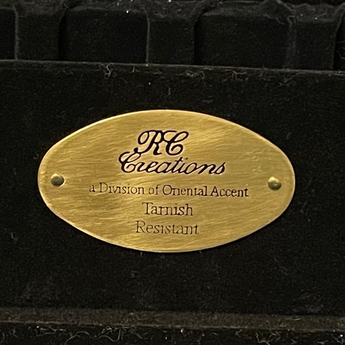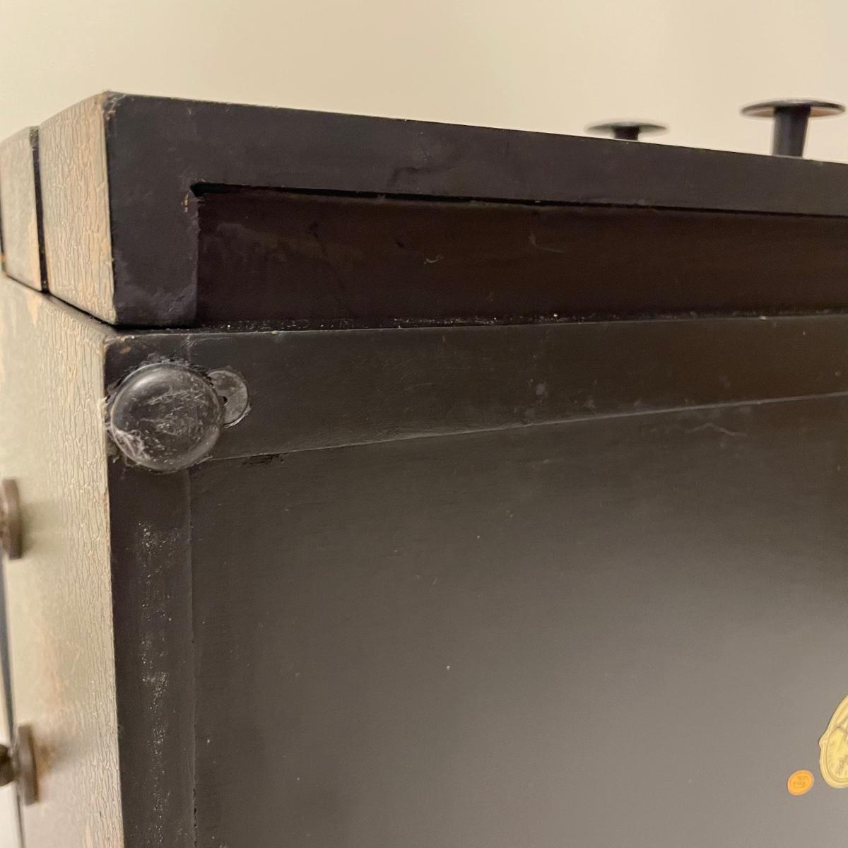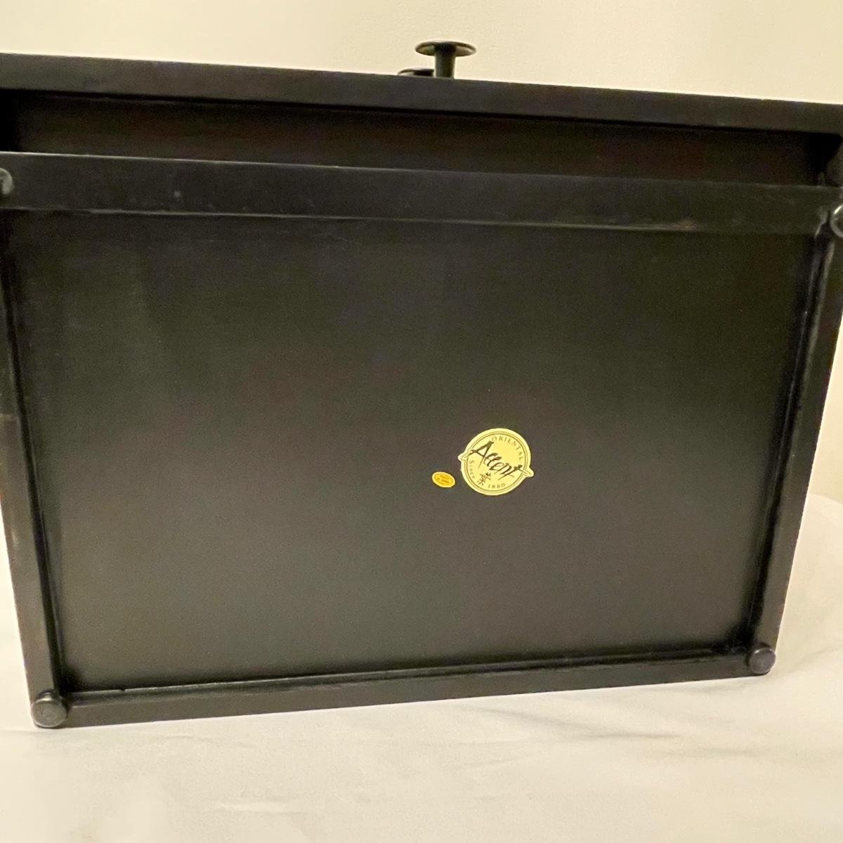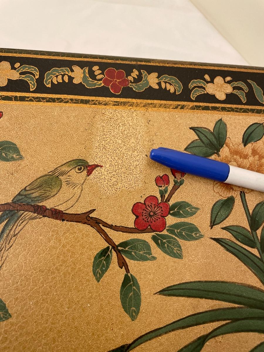 This beautiful silverware storage case has 2 tarnish resistant lined drawers that are each 1.75” high and approximately 10” deep; bottom one is flat for larger utensils and the top one has been compartmentalized as has the top lined section under the lid which has 9 slots to hold knives, forks and spoons. It has a crackle finish in its painted design and metal hardware. It comes with its original sales receipt and an extra knob. There are a few minor runs/marks and a small discolored area on the lid shown in images.