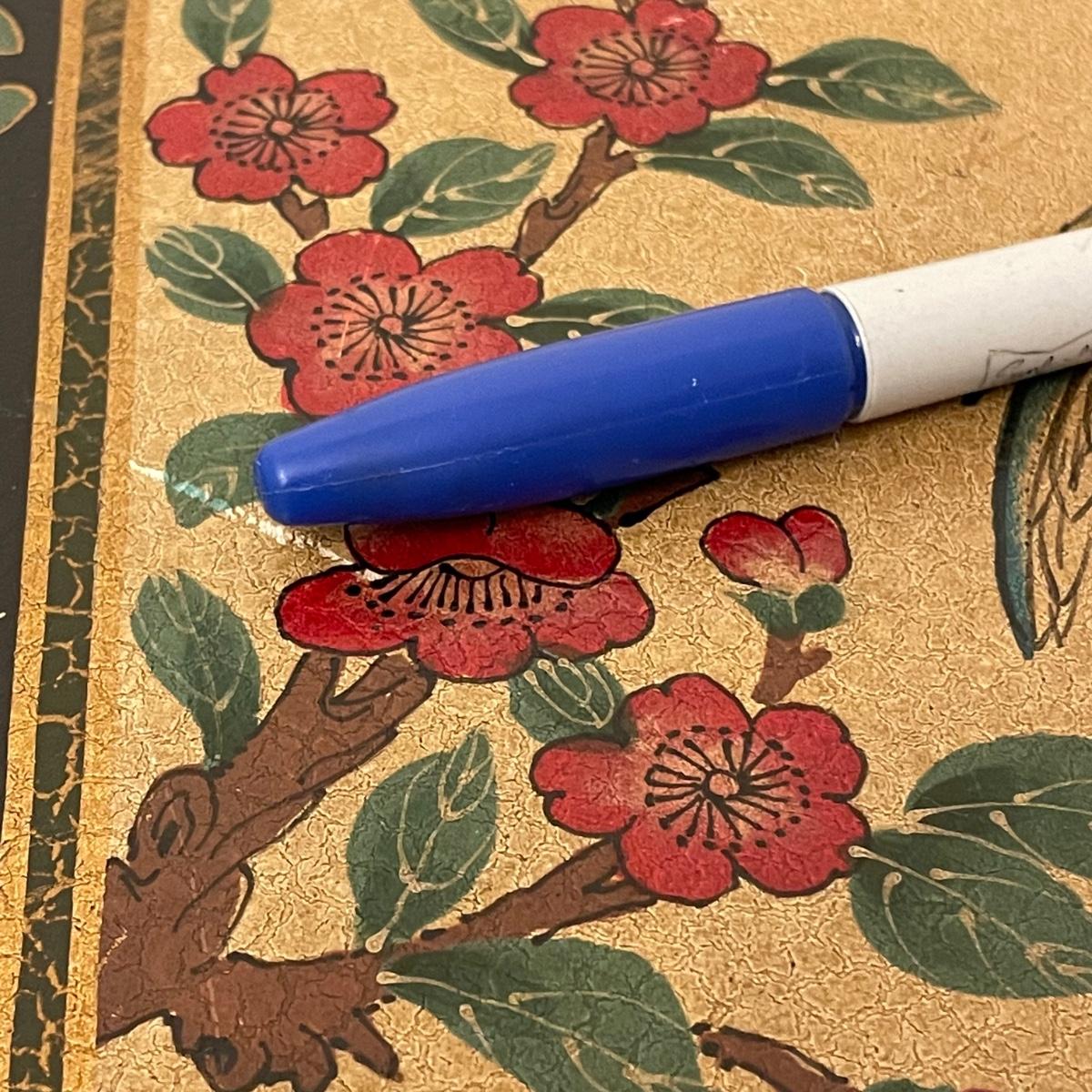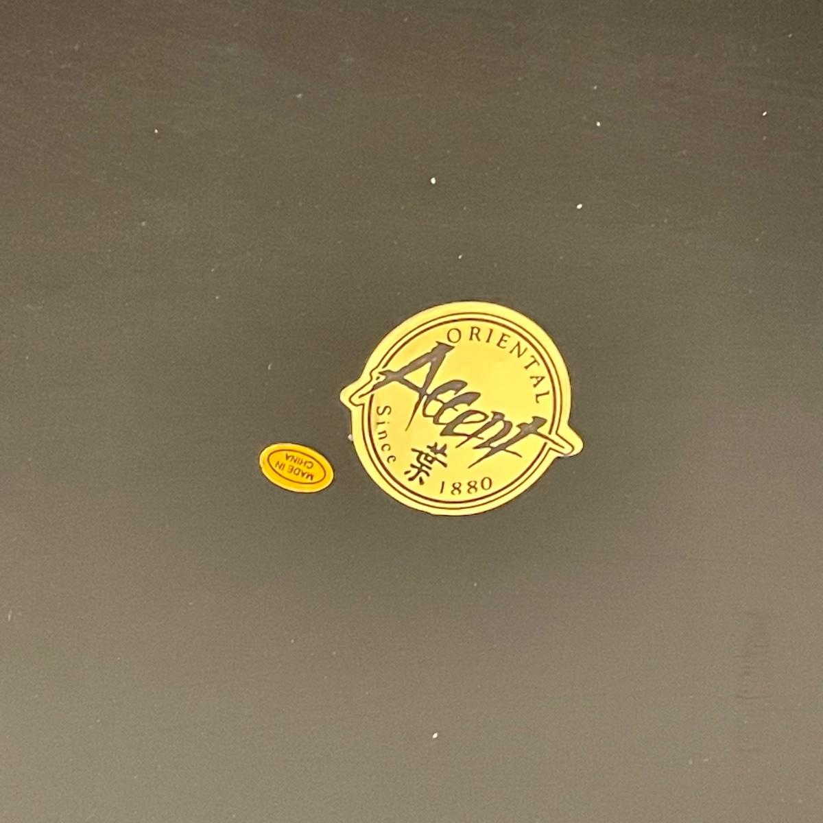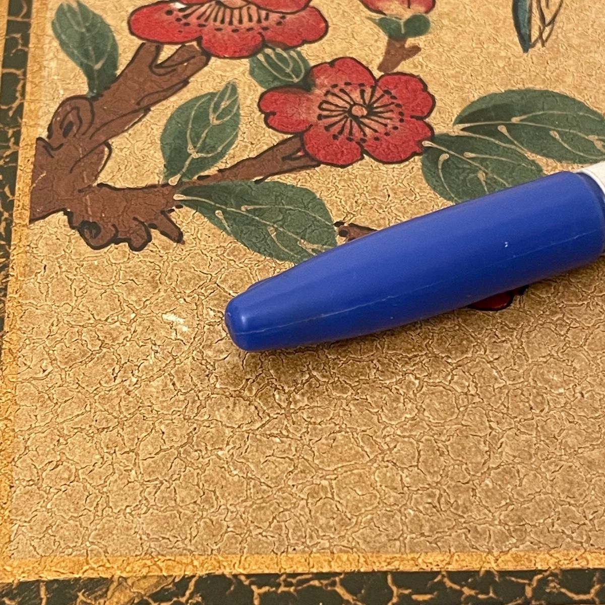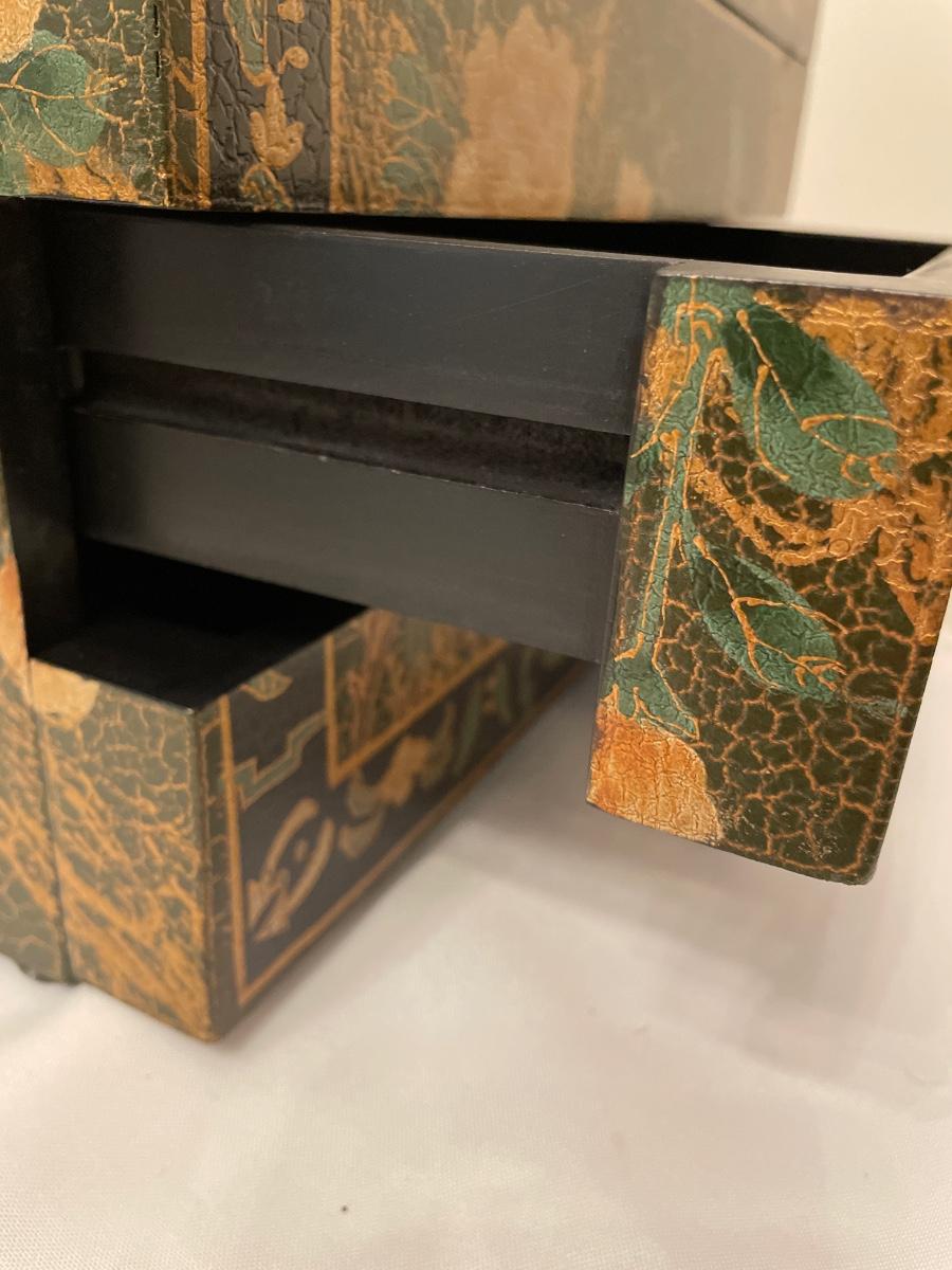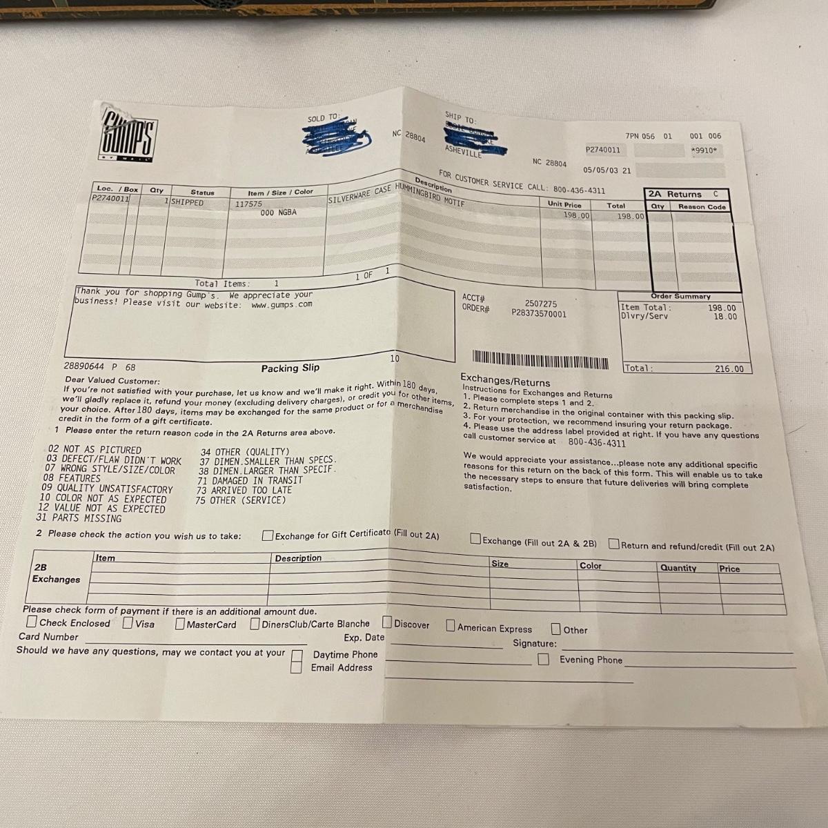 This beautiful silverware storage case has 2 tarnish resistant lined drawers that are each 1.75” high and approximately 10” deep; bottom one is flat for larger utensils and the top one has been compartmentalized as has the top lined section under the lid which has 9 slots to hold knives, forks and spoons. It has a crackle finish in its painted design and metal hardware. It comes with its original sales receipt and an extra knob. There are a few minor runs/marks and a small discolored area on the lid shown in images.
