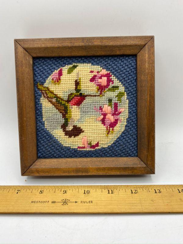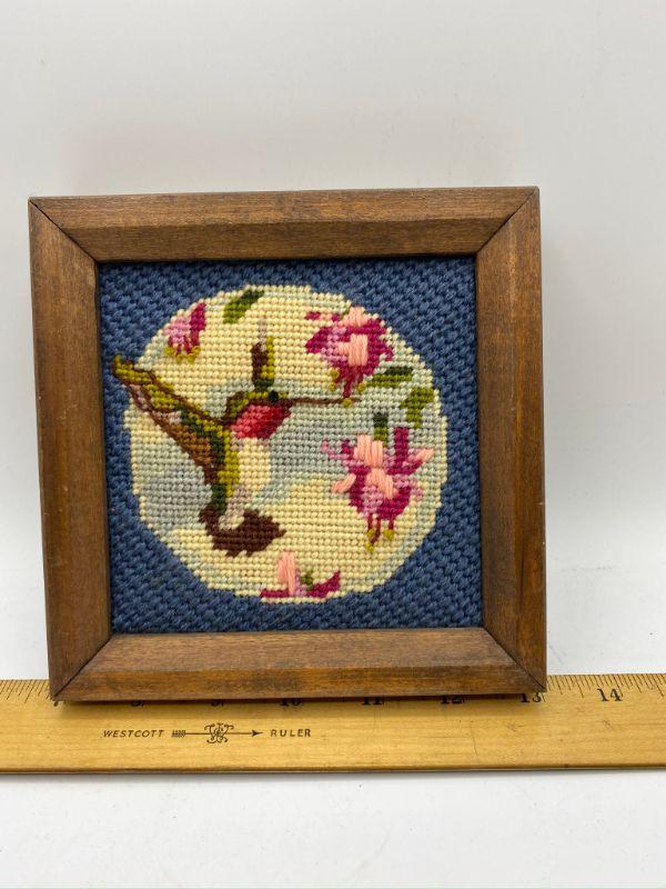 Small hummingbird needlepoint art. 6" square.