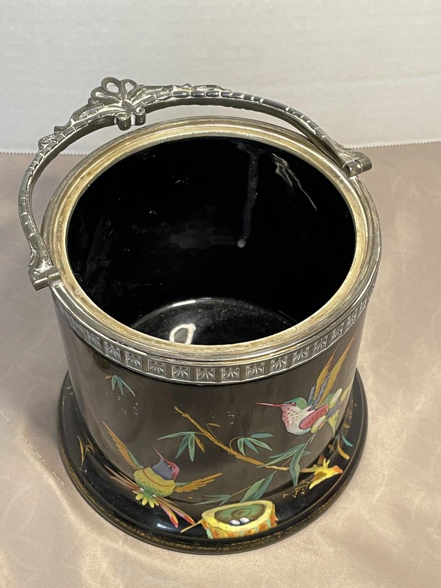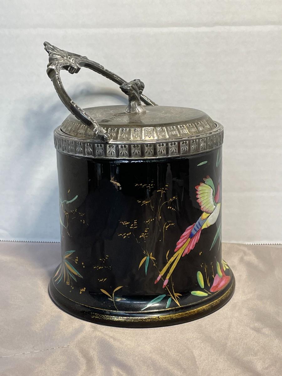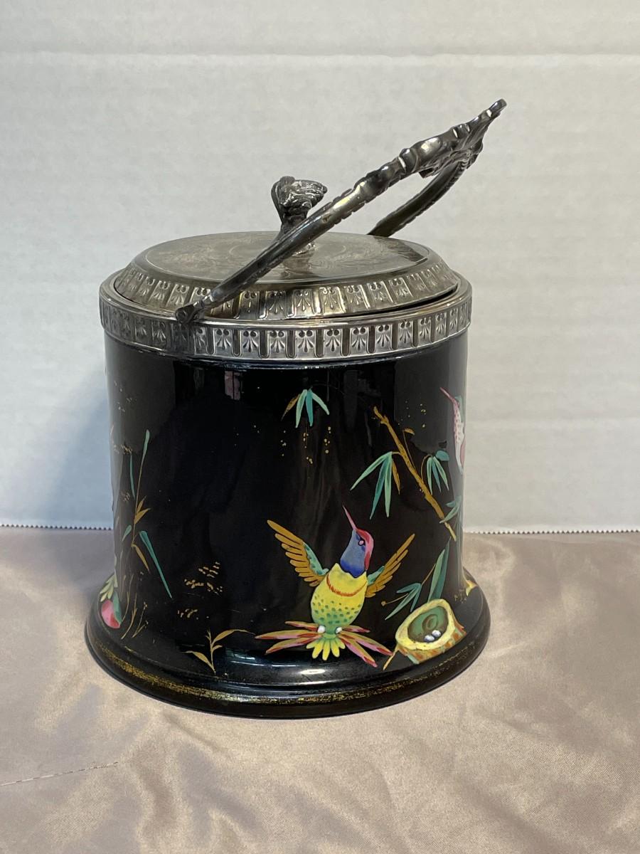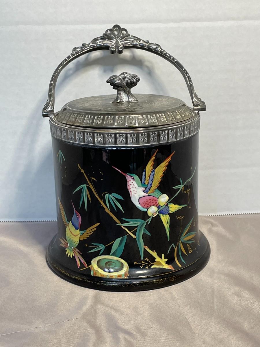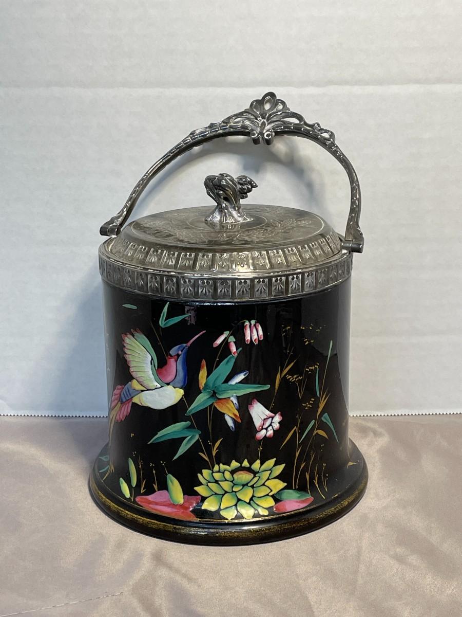 This is a beautiful ceramic biscuit barrel painted in black enamel paint and embellished with hummingbirds and flowers. It has a silverplated top and stands about 6.5 inches tall not including the handle. There is some glue drippage on the insiide from where the silverplated trim was re-attached but otherwise no issues. One of my favorite pieces!