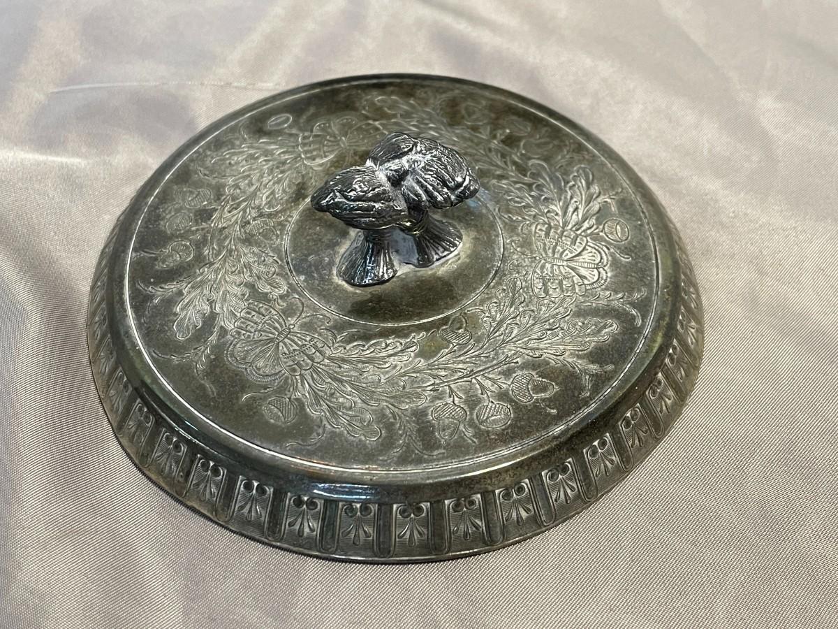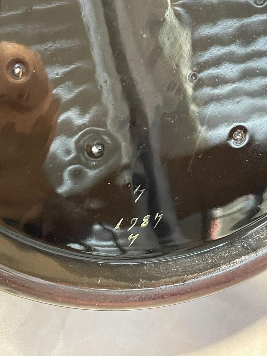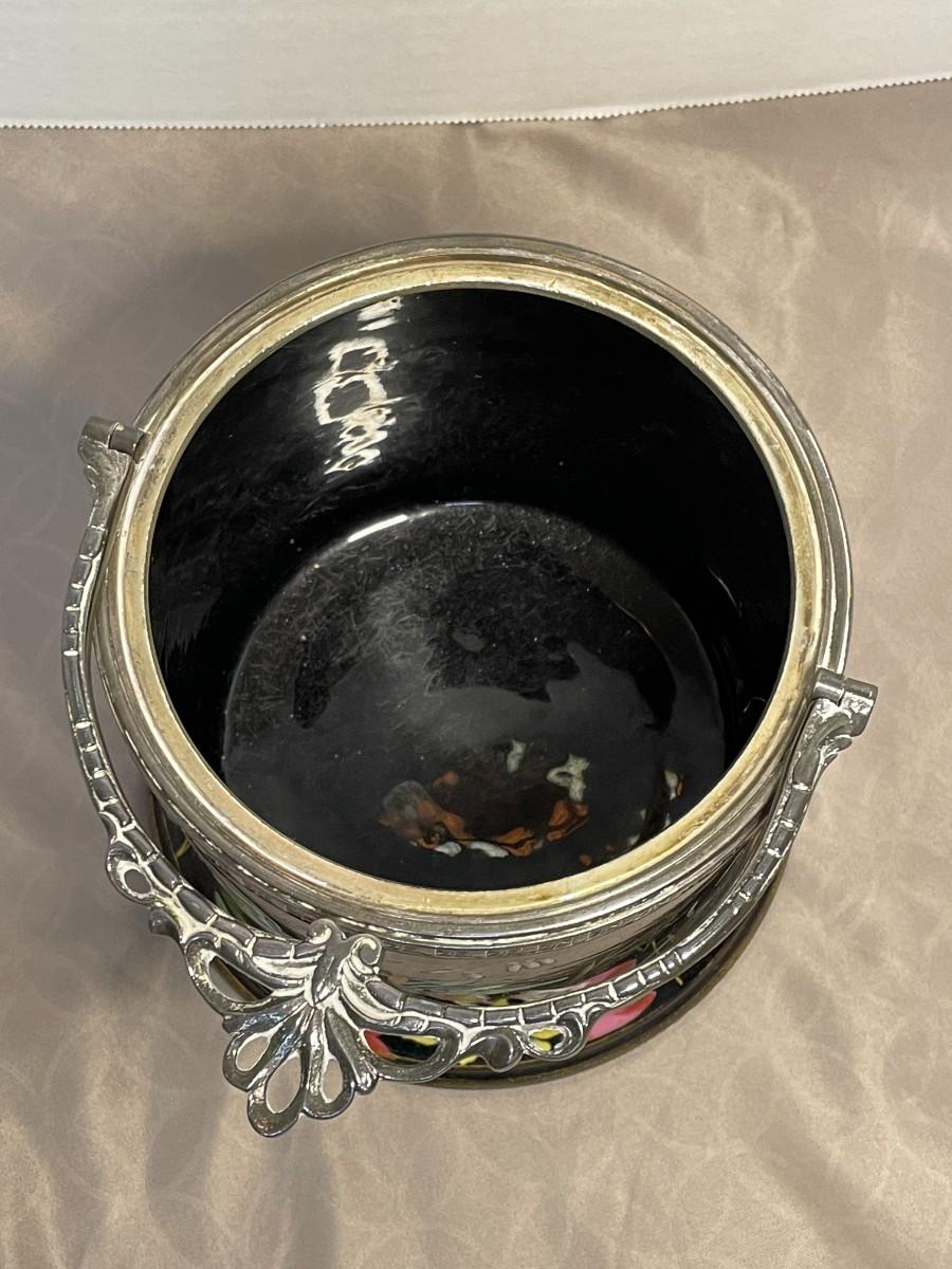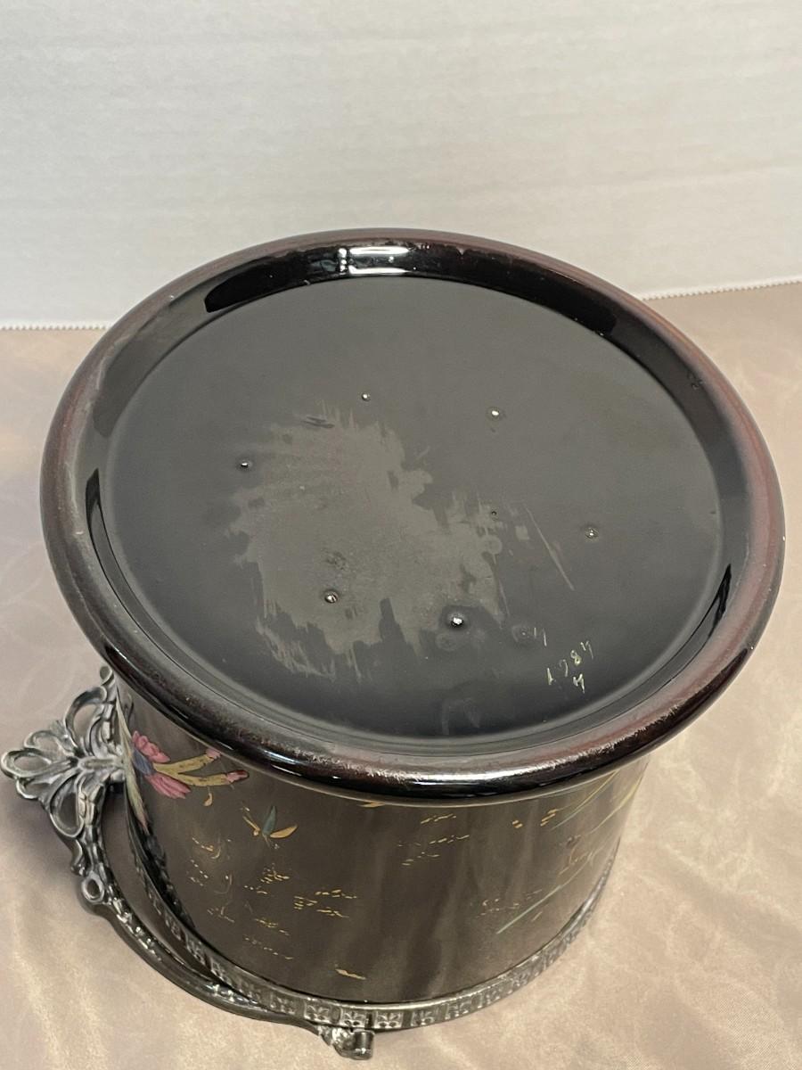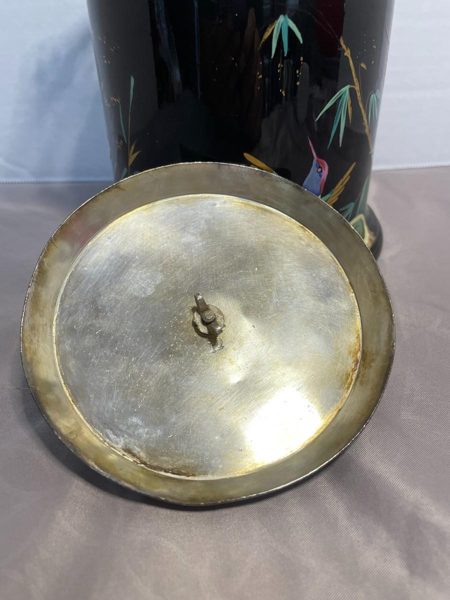 This is a beautiful ceramic biscuit barrel painted in black enamel paint and embellished with hummingbirds and flowers. It has a silverplated top and stands about 6.5 inches tall not including the handle. There is some glue drippage on the insiide from where the silverplated trim was re-attached but otherwise no issues. One of my favorite pieces!