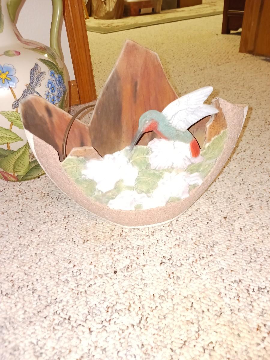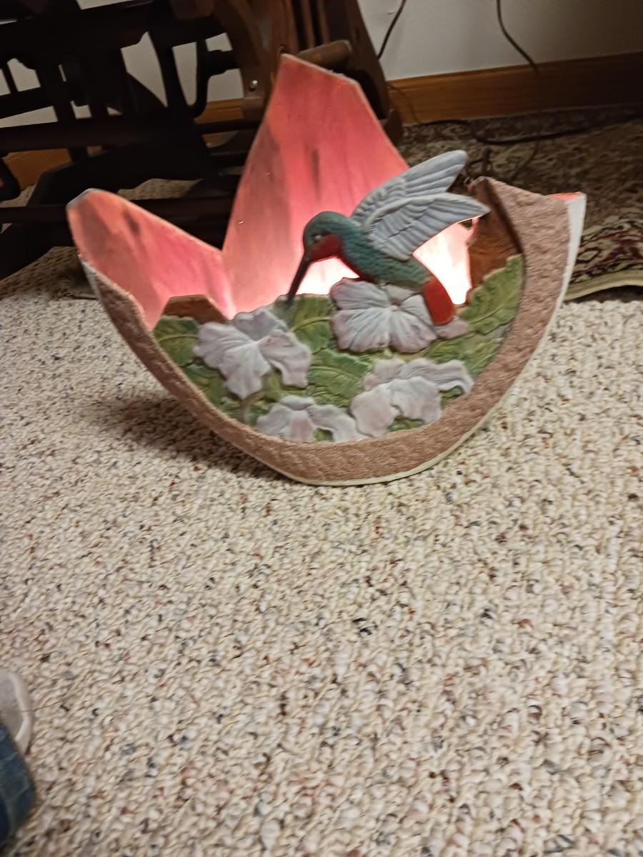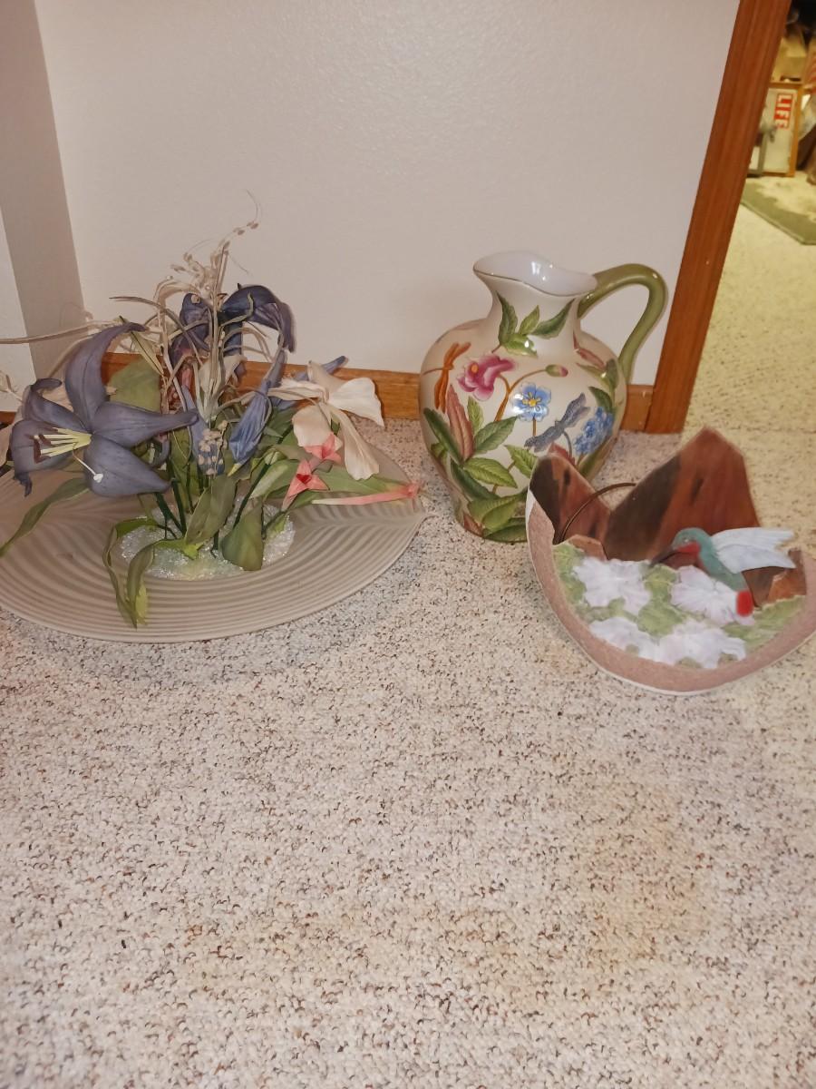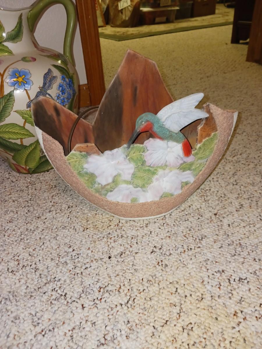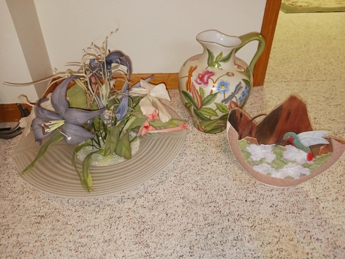 HUMMINGBIRD TV LAMP, LARGE PITCHER, FAUX FLOWERS ON A LARGE GLASS BOWL