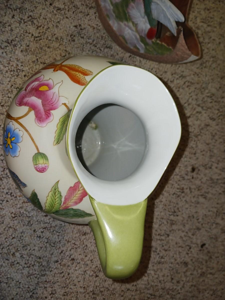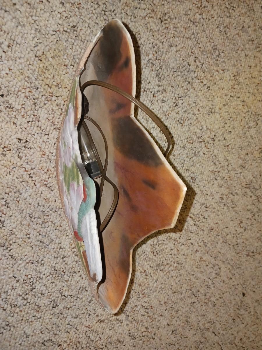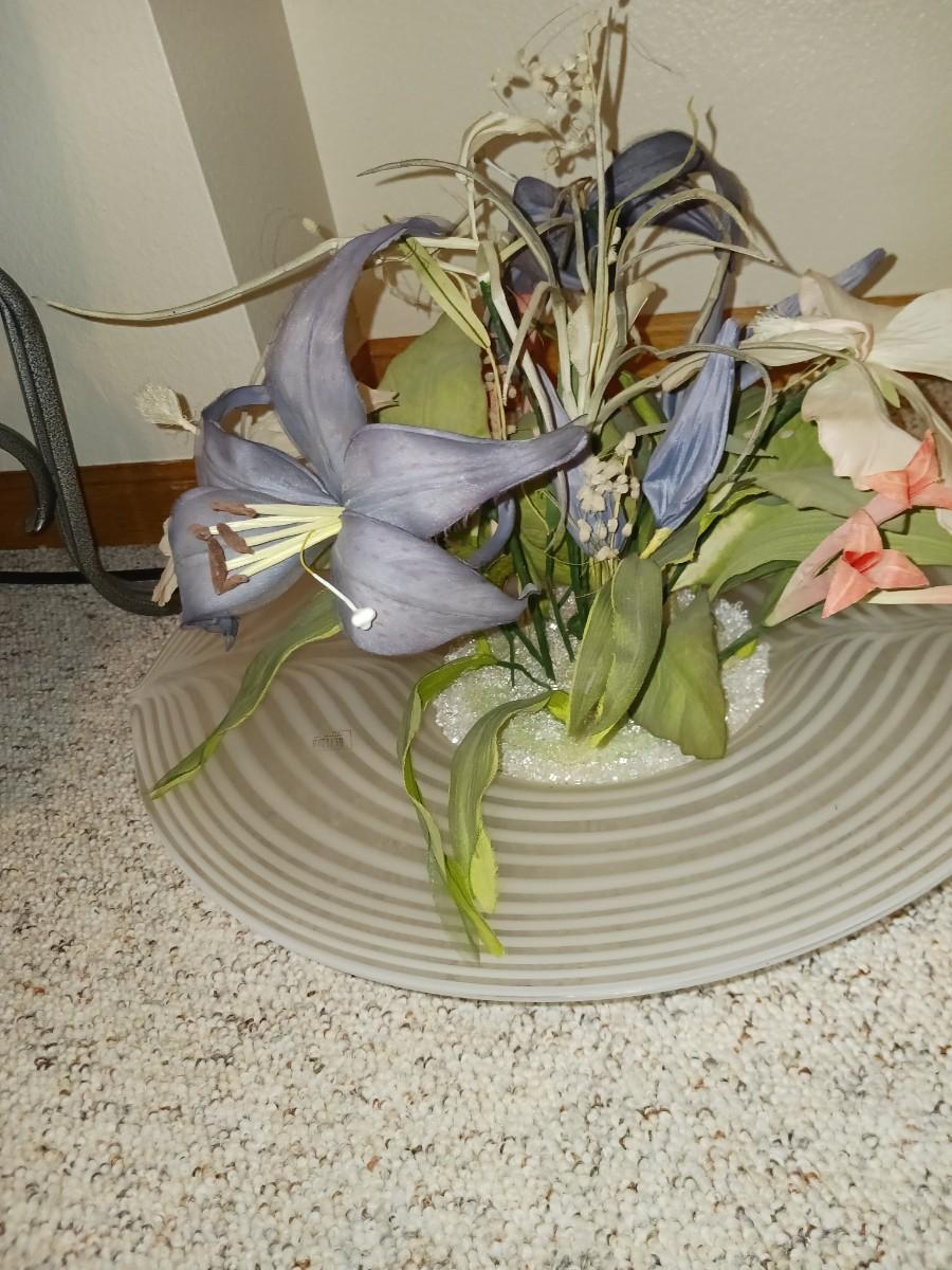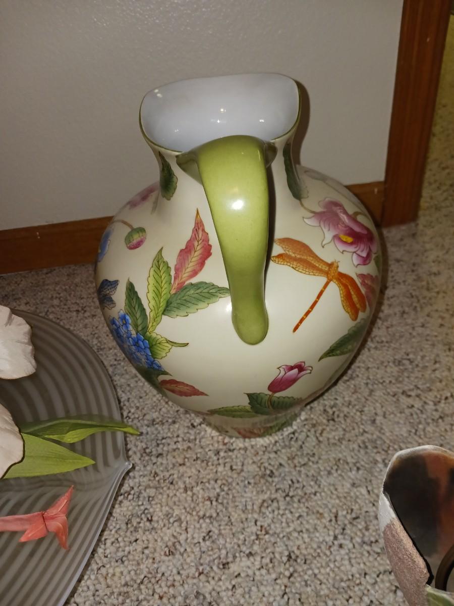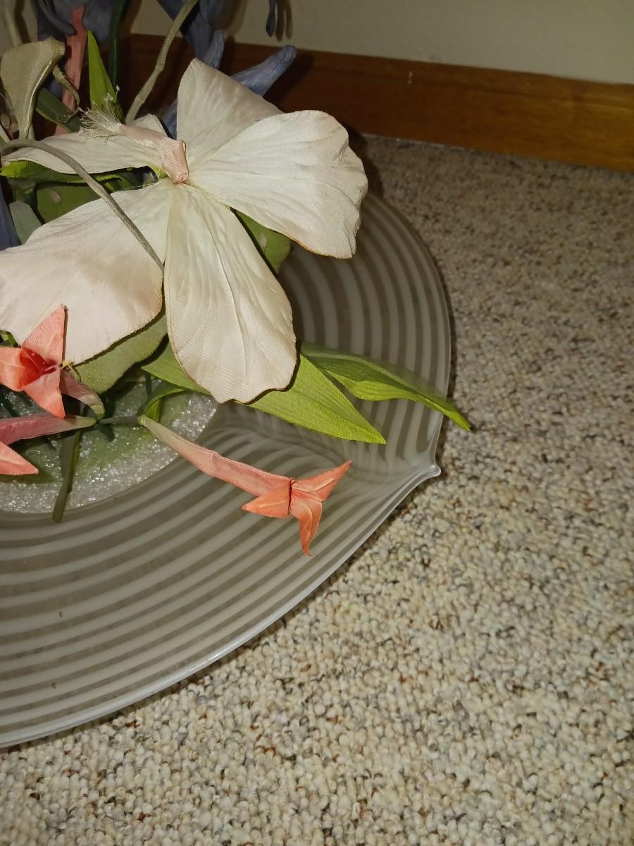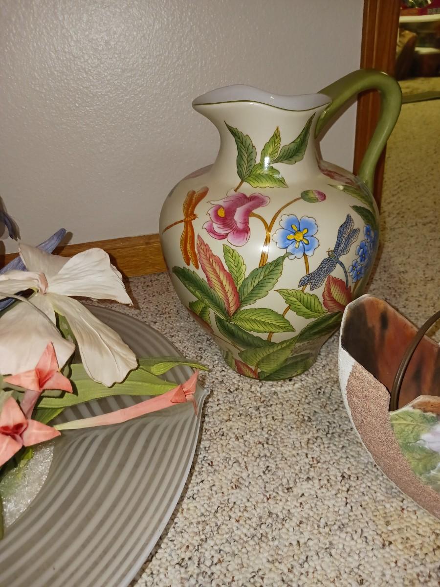HUMMINGBIRD TV LAMP, LARGE PITCHER, FAUX FLOWERS ON A LARGE GLASS BOWL