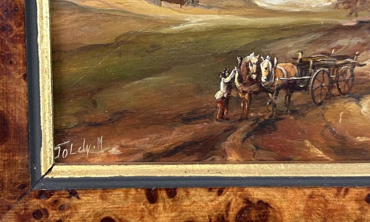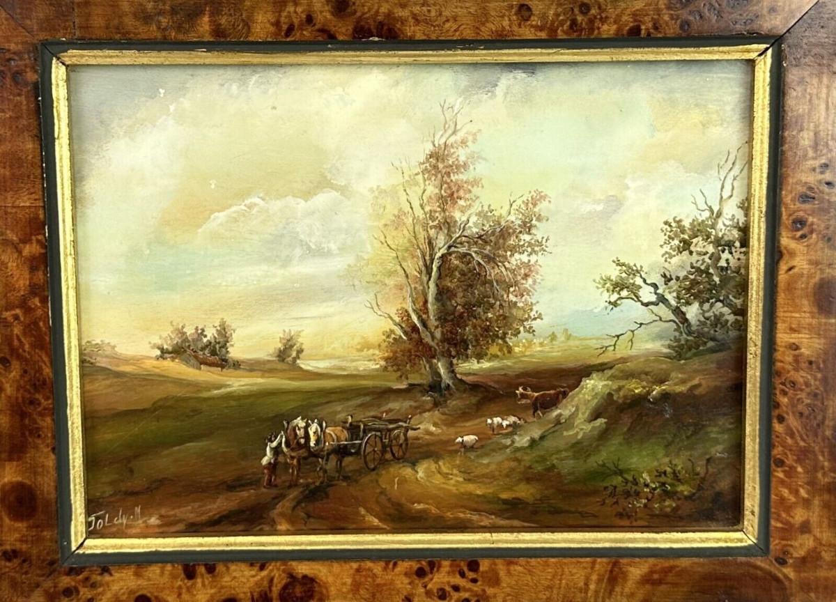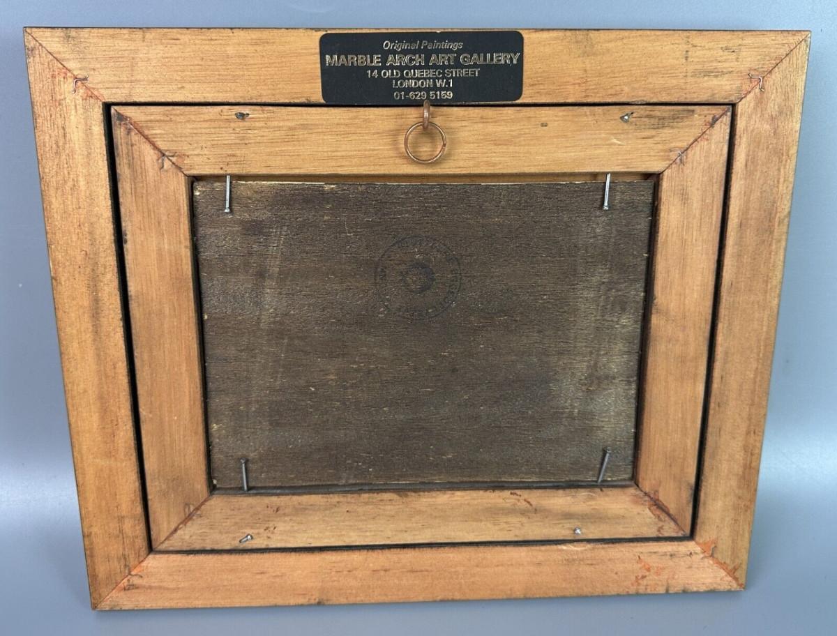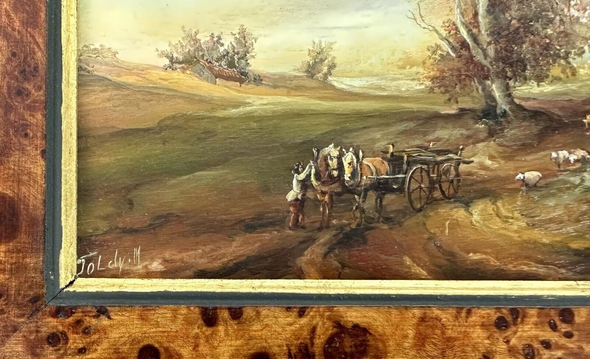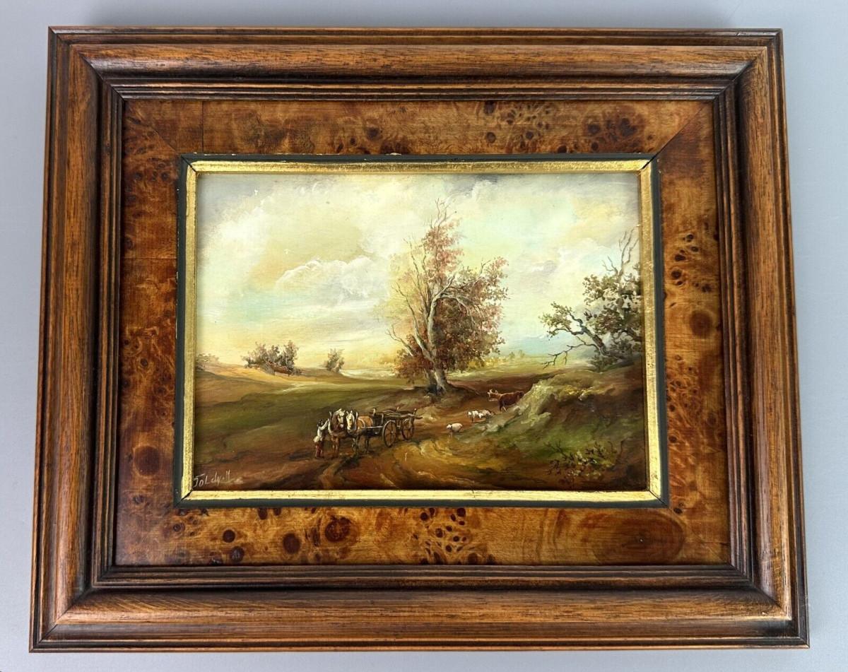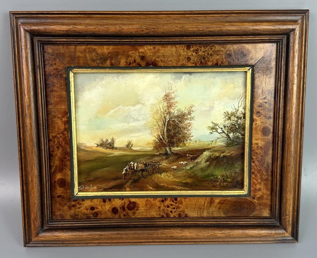 Known for her miniatures in baroque and renaissance style here is a signed original oil on board from Hungarian artist Maria Toldy..Born 1939...Framed in London in a marvelous burl wood...11.5 x 9.5"..the painting measures 7 x 5"...Excellent condition on this estate art...