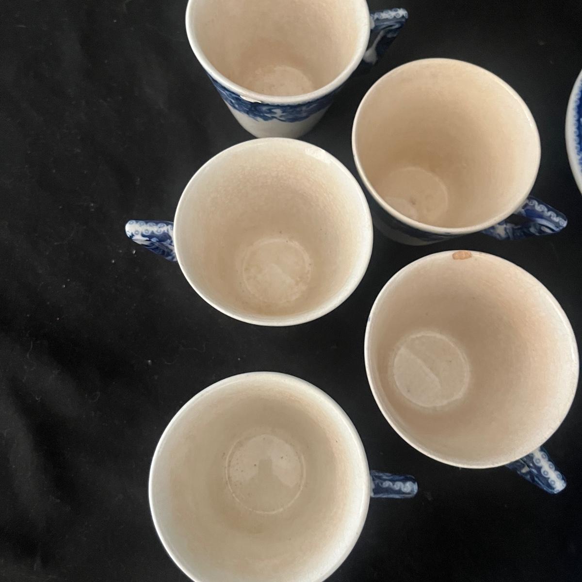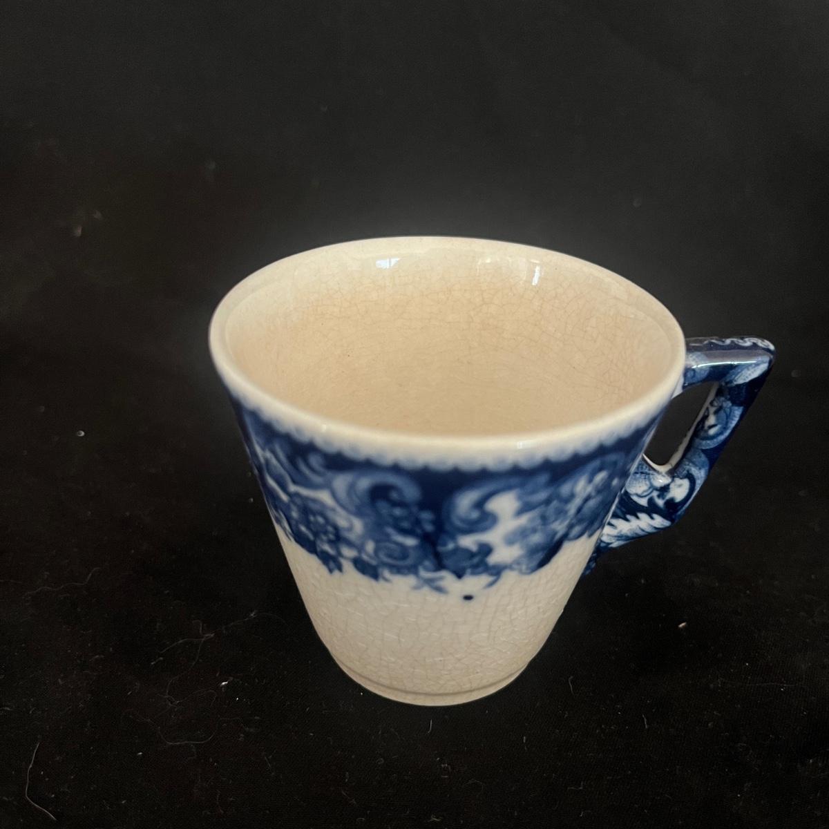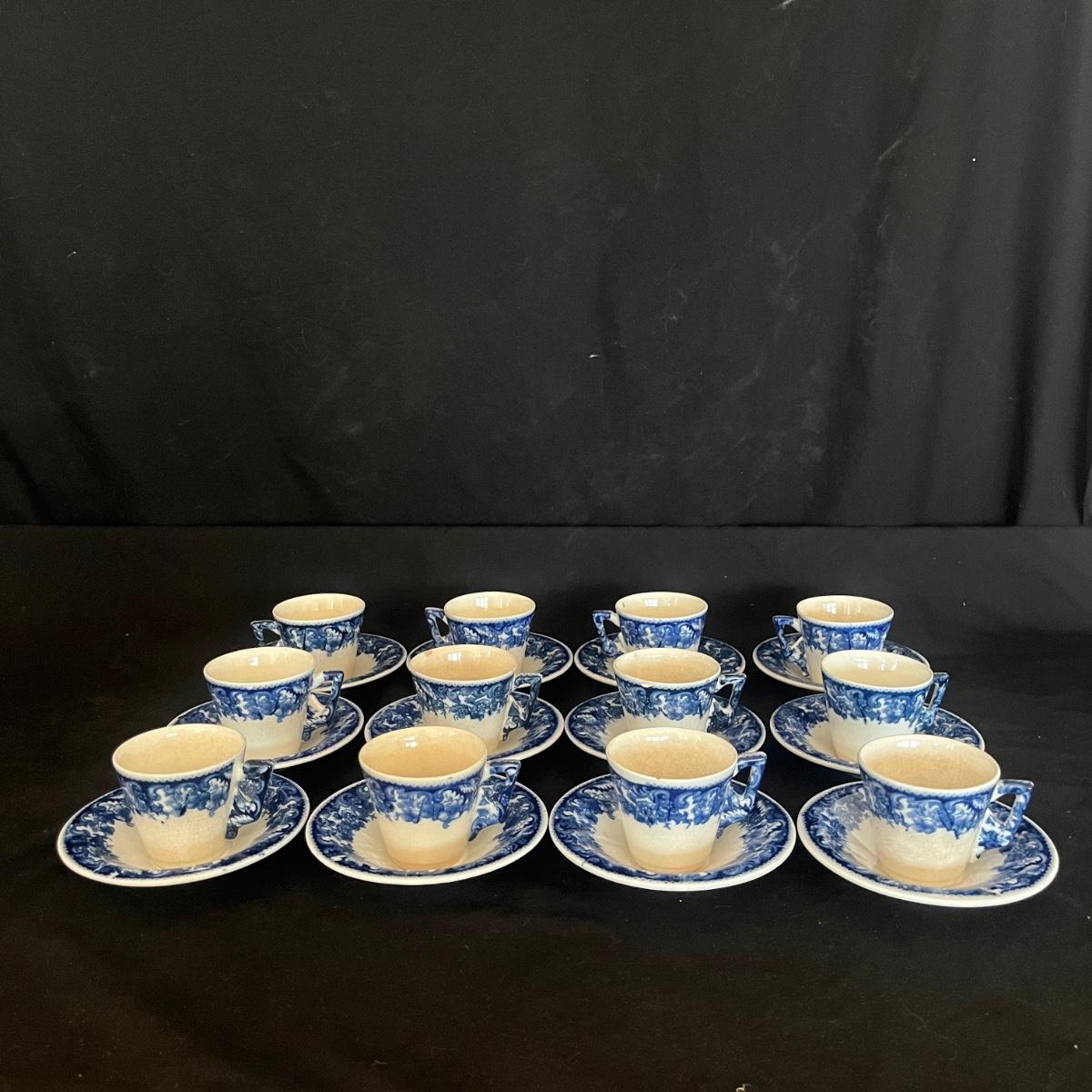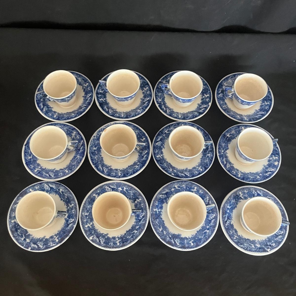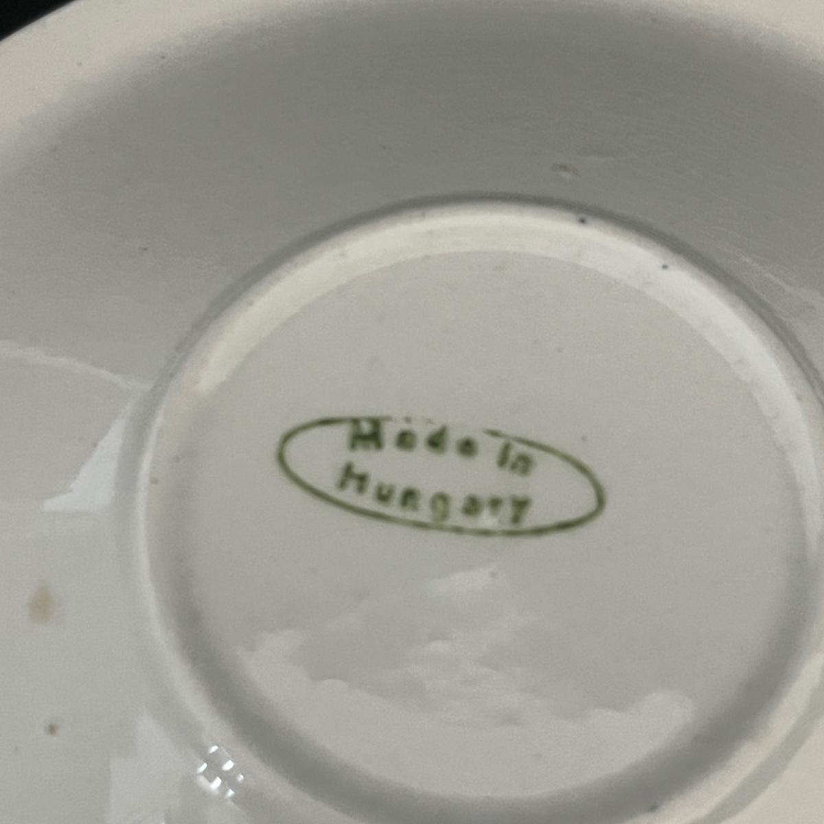 Lot includes 12 Demitasse cups and saucers that are made in Hungary. Saucer measures 4.75”D and cup measures 3” x 2.5” x 2.25”H. Two cups have chips and five cups have crazing, see pictures.