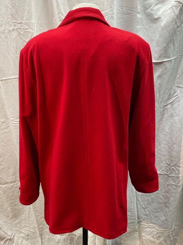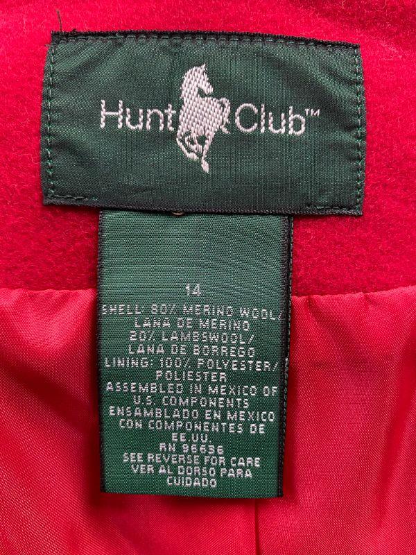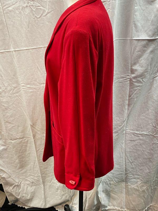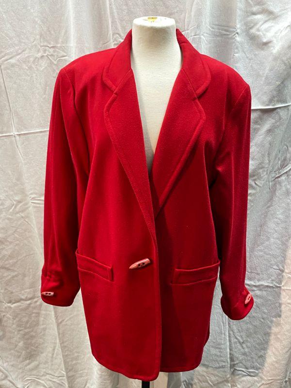 Hunt Club woman's blazer. Bright red, 100% wool blend. Single button closure, faux pockets. Size 14. Good condition, no holes, spots, or snags. may be dusty from storage.
