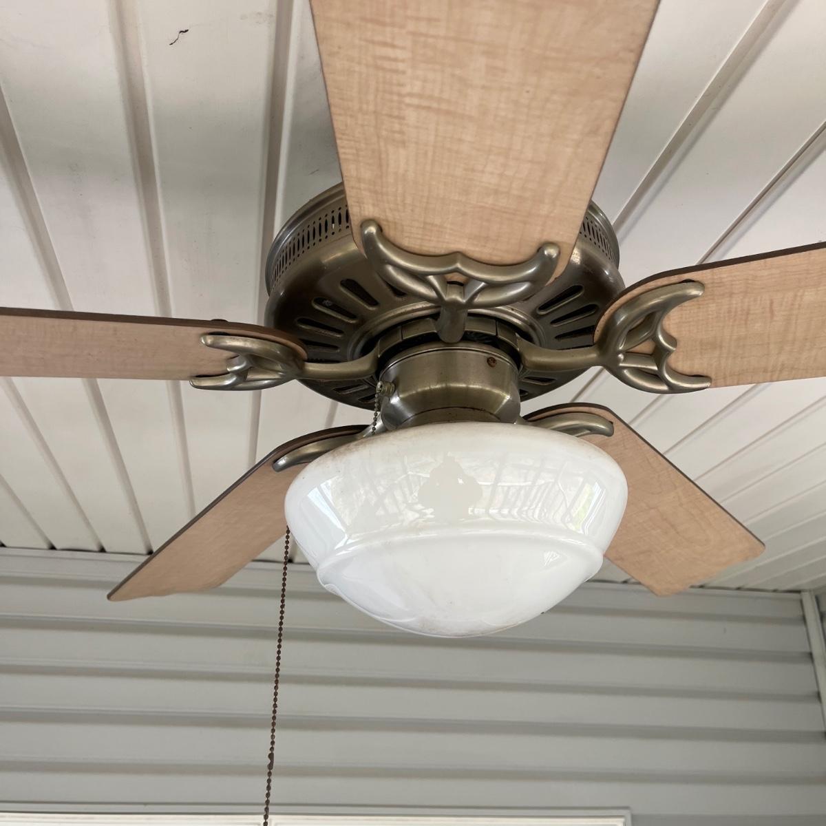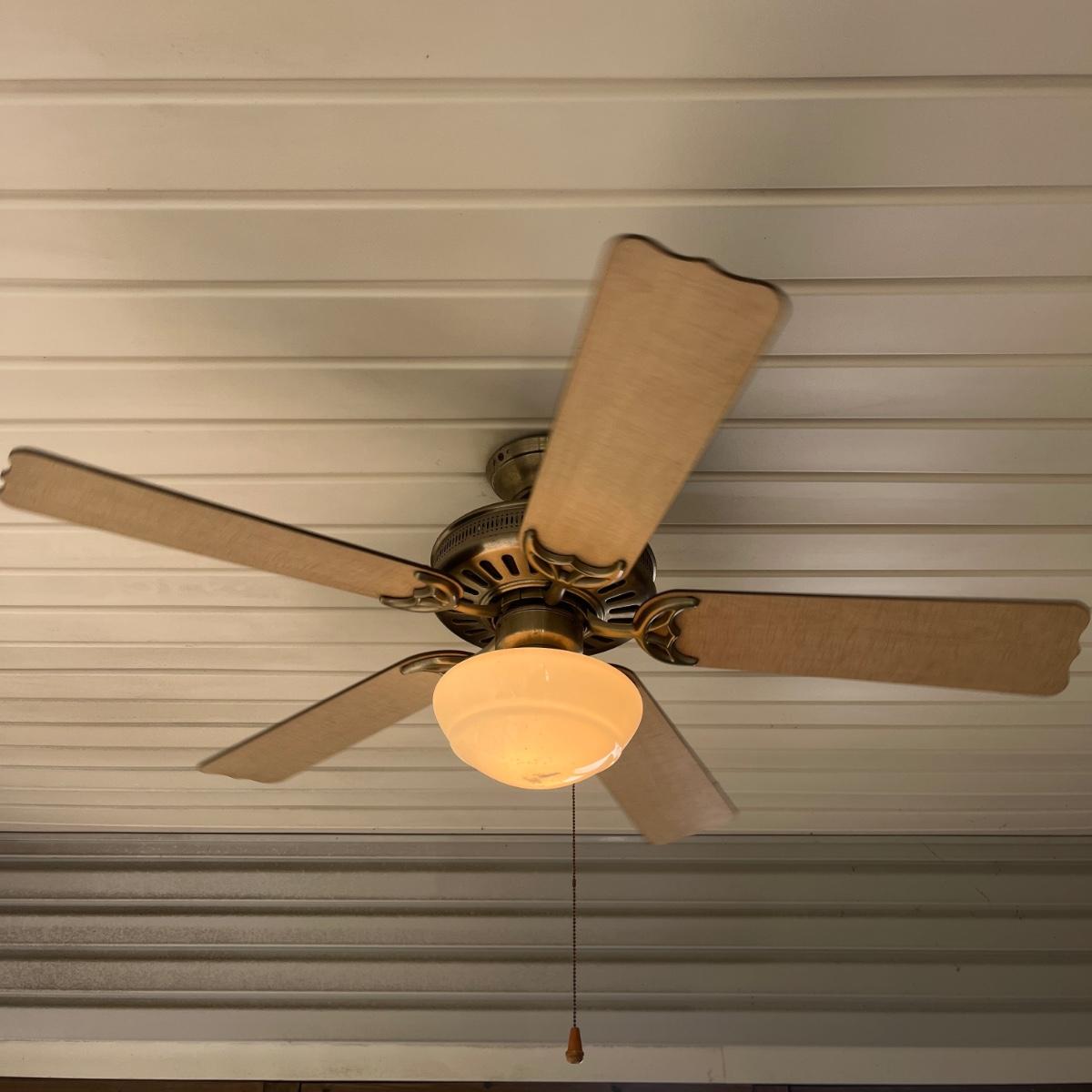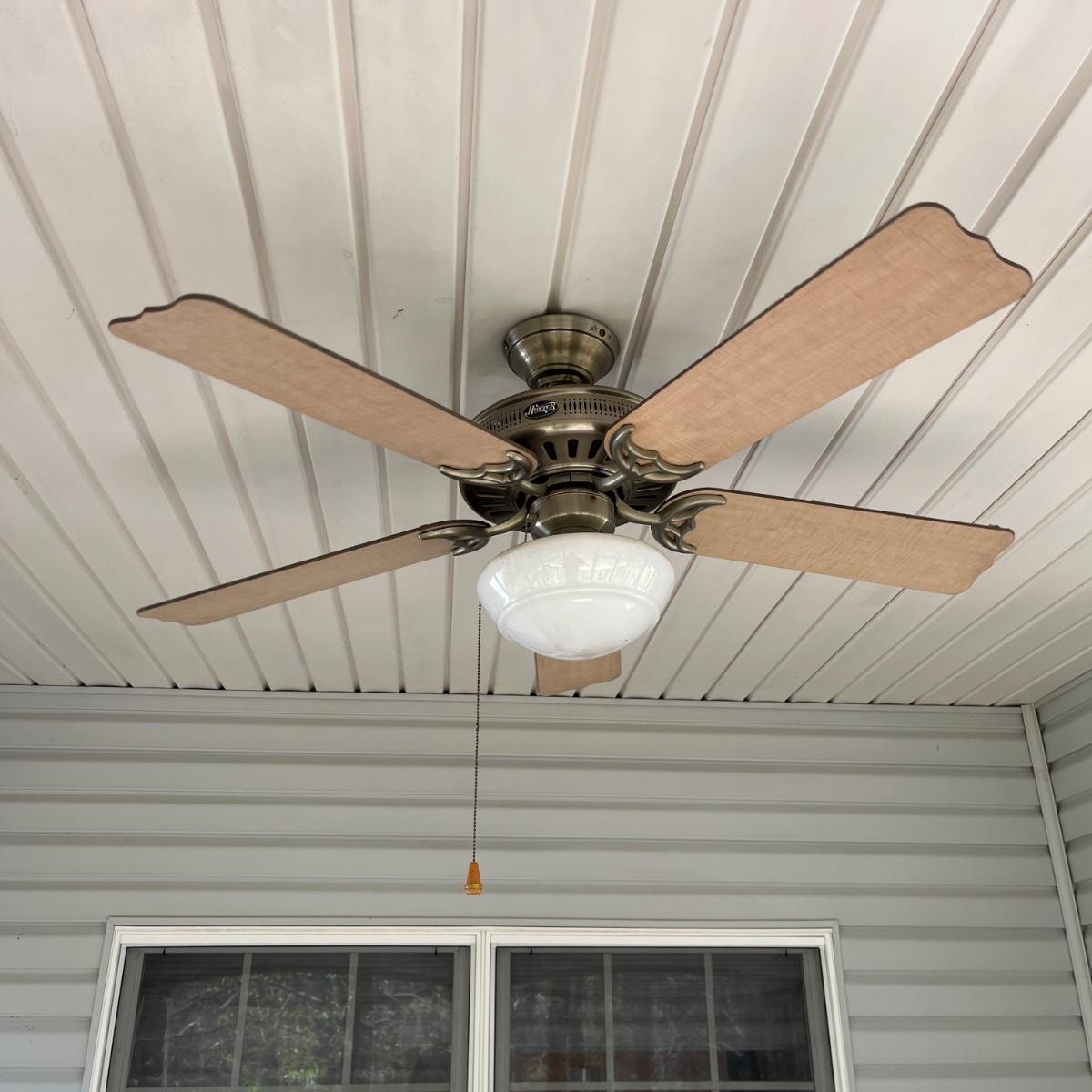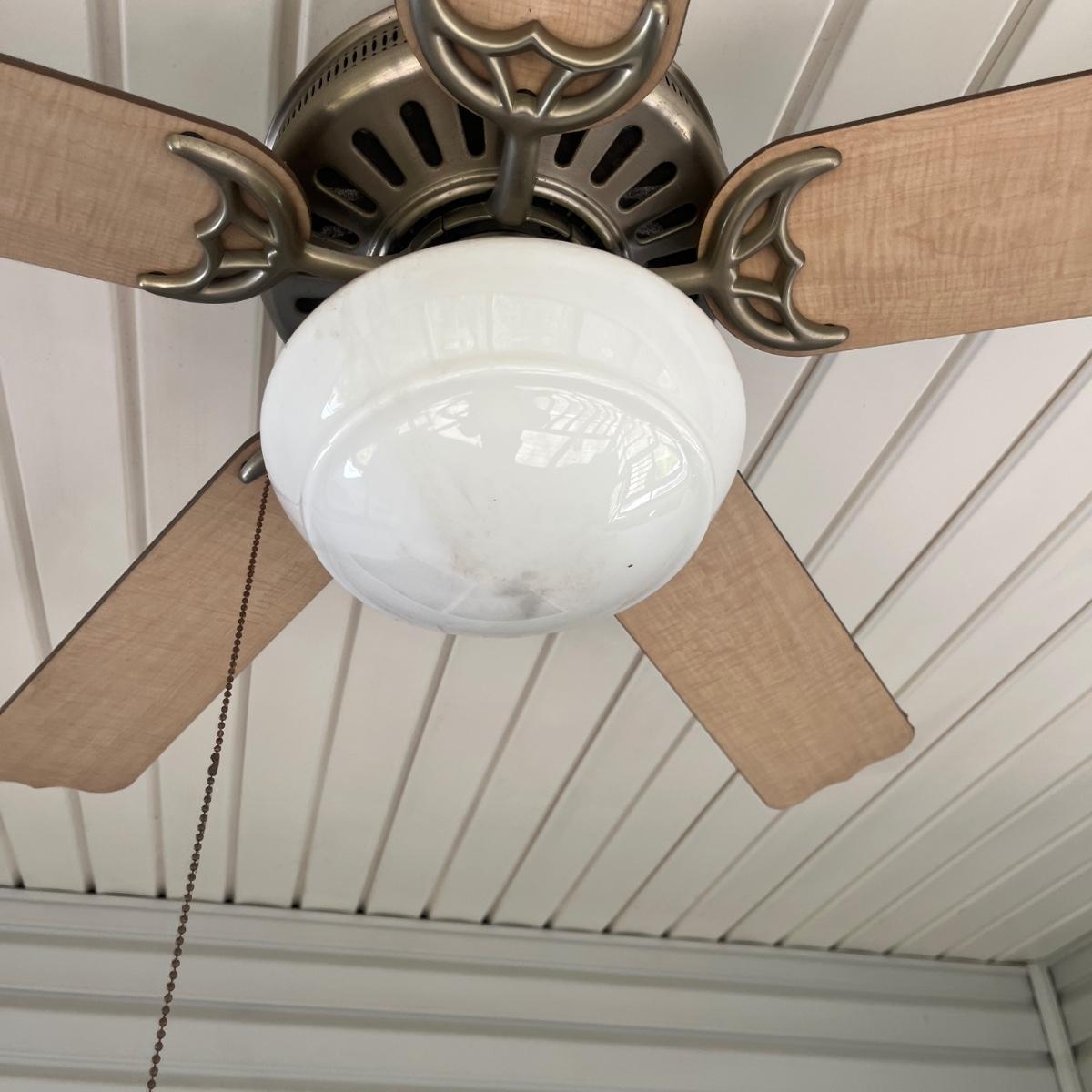 Lot includes a 48” Hunter ceiling fan with light. Light and fan both powered on when switched on. The fan is located in an outdoor porch 9' from the ground. The winning bidder will be responsible for taking this down, including disconnecting the electrical components and capping the wires. A ladder will be provided at pickup.