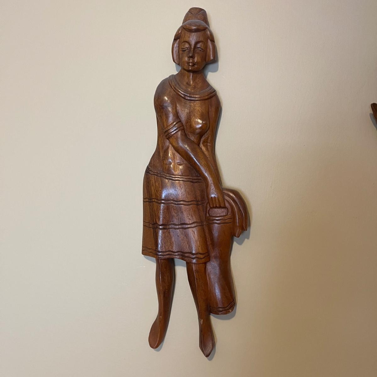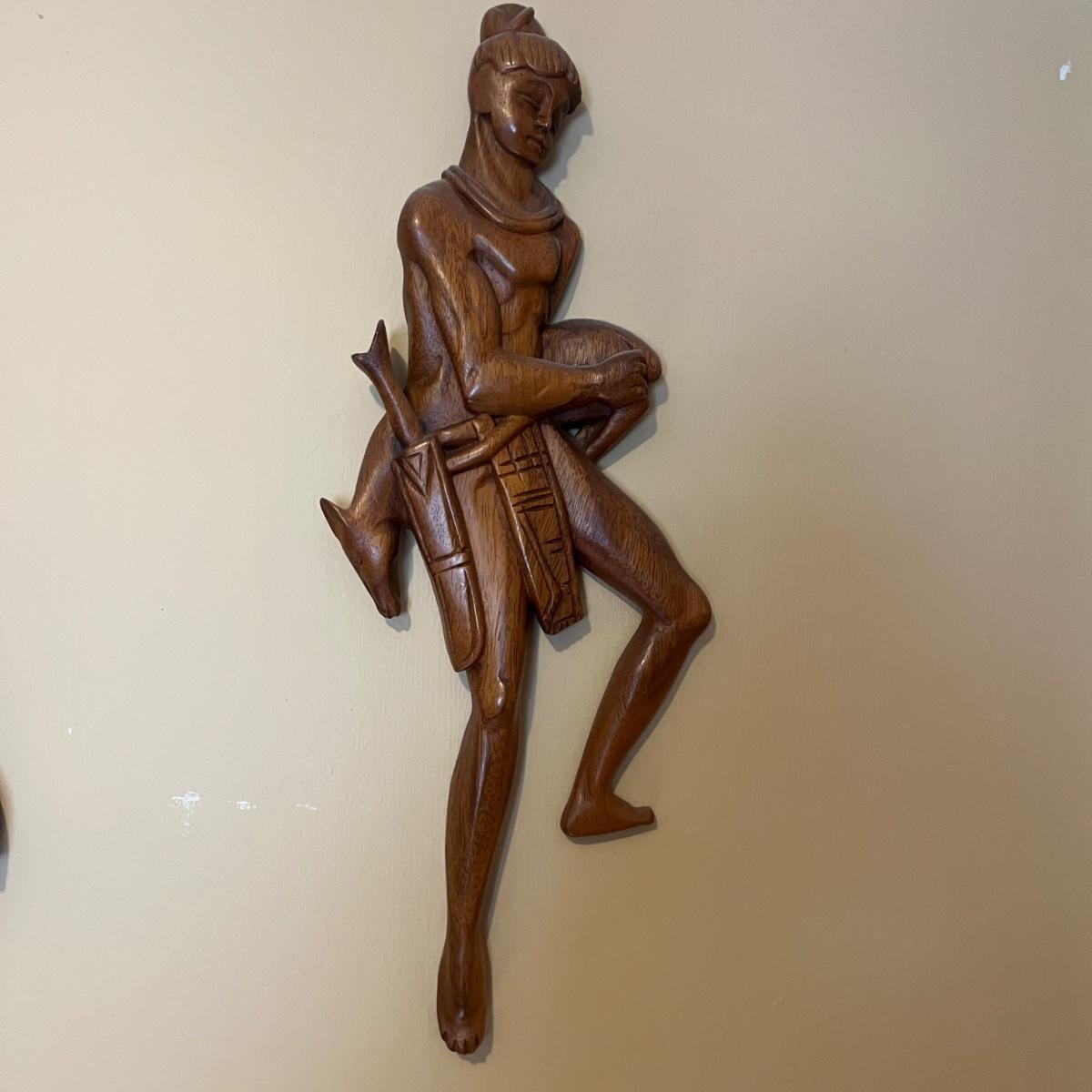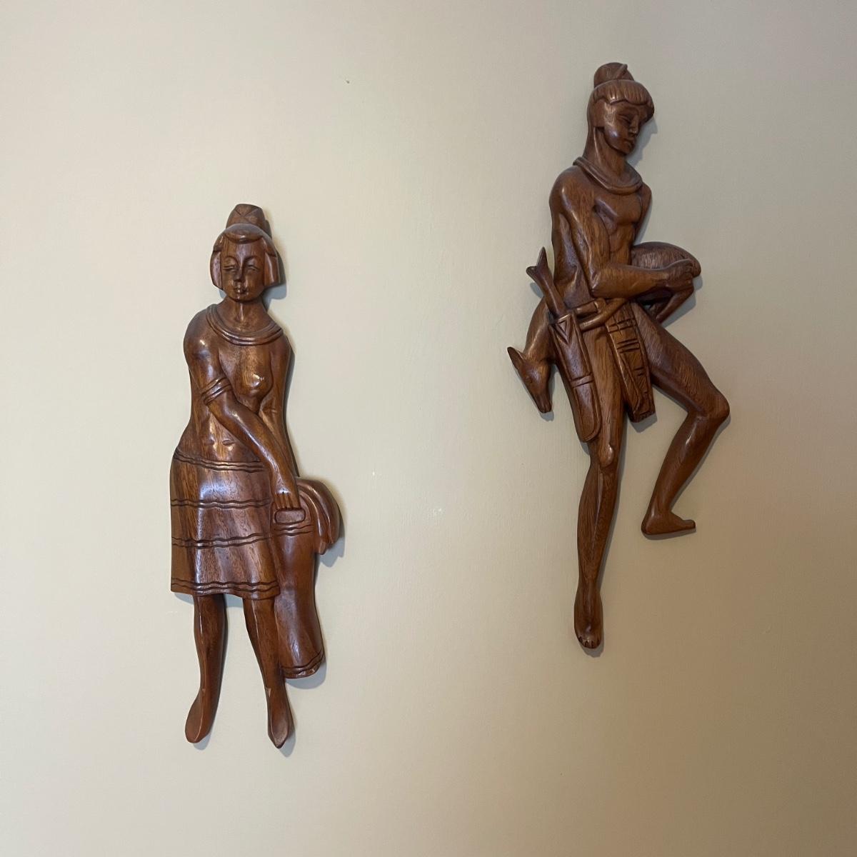 Lot includes two carved wooden pieces of wall art with one being a hunter and the other a gatherer. Tallest piece measures 6.5” x 1.5” x 19.5”H.