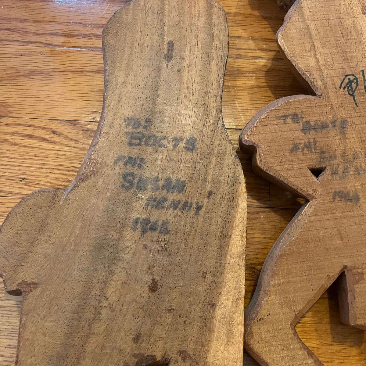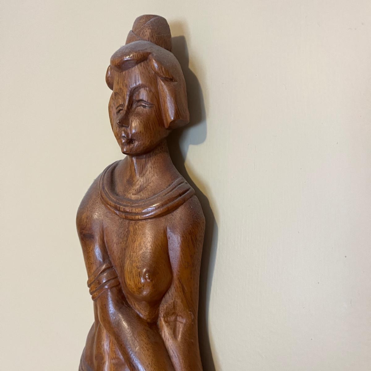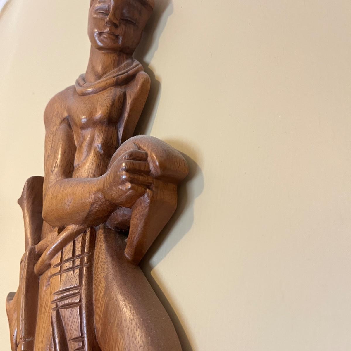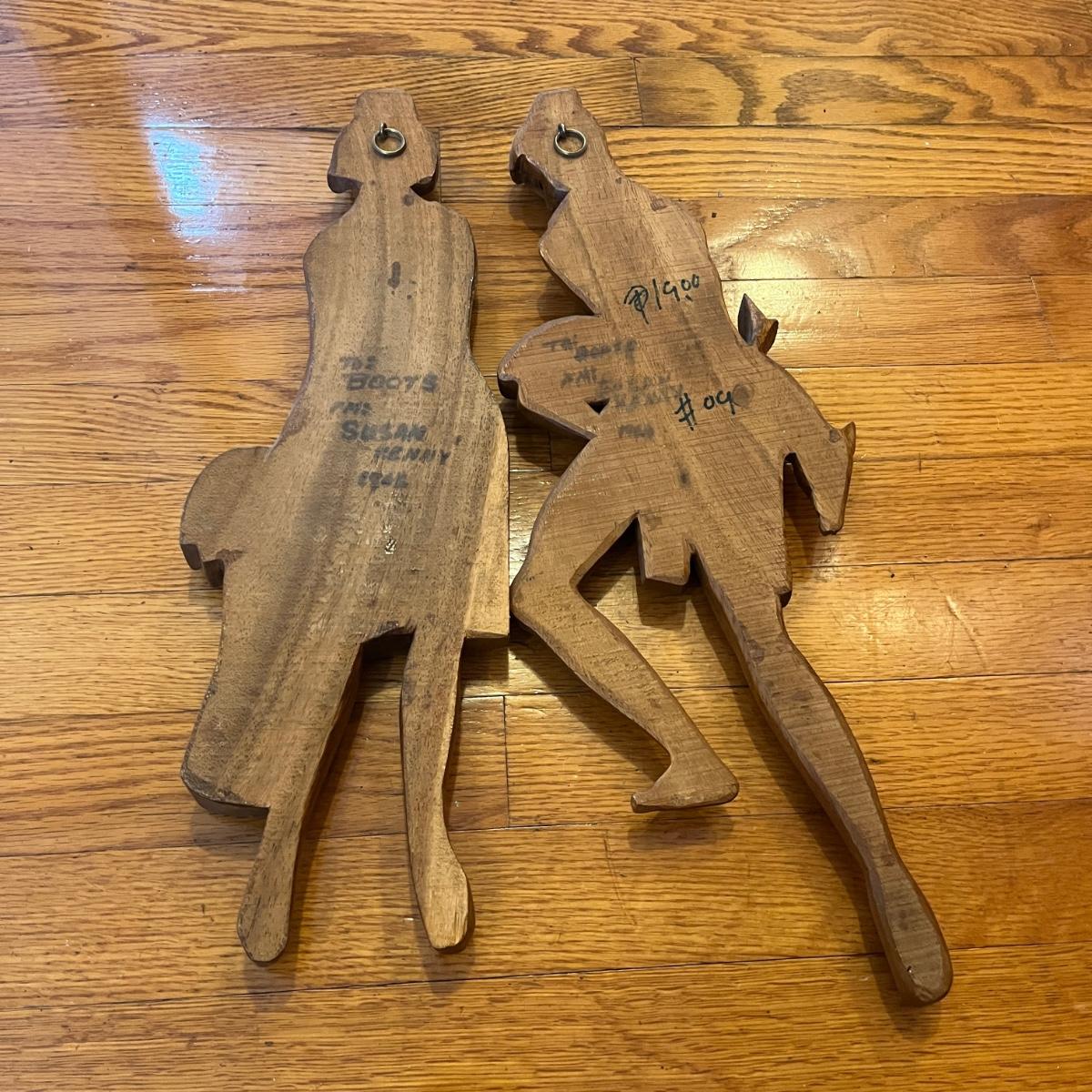 Lot includes two carved wooden pieces of wall art with one being a hunter and the other a gatherer. Tallest piece measures 6.5” x 1.5” x 19.5”H.