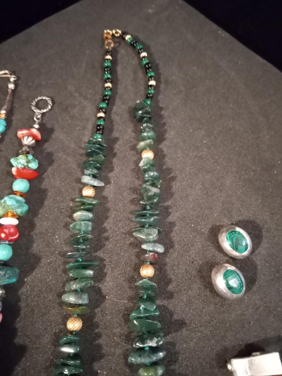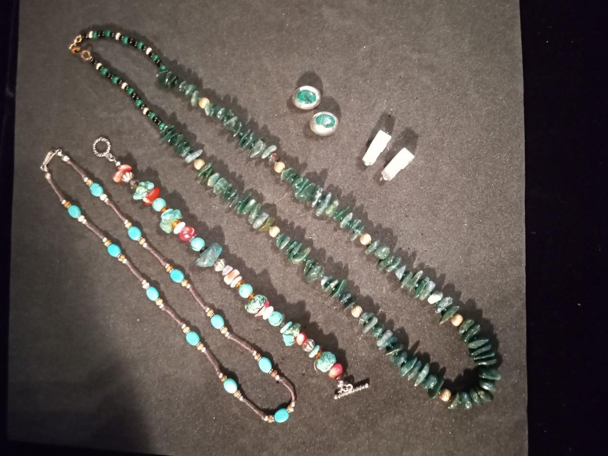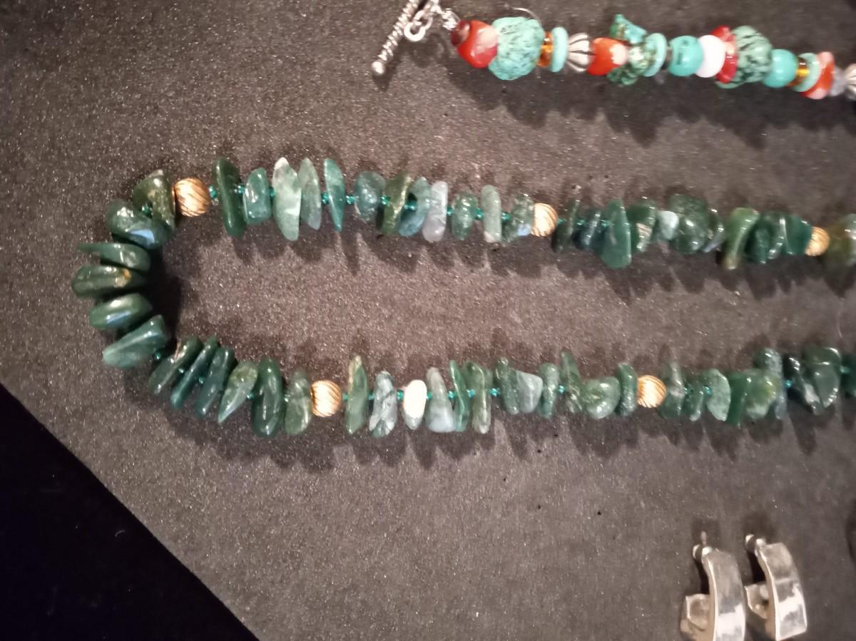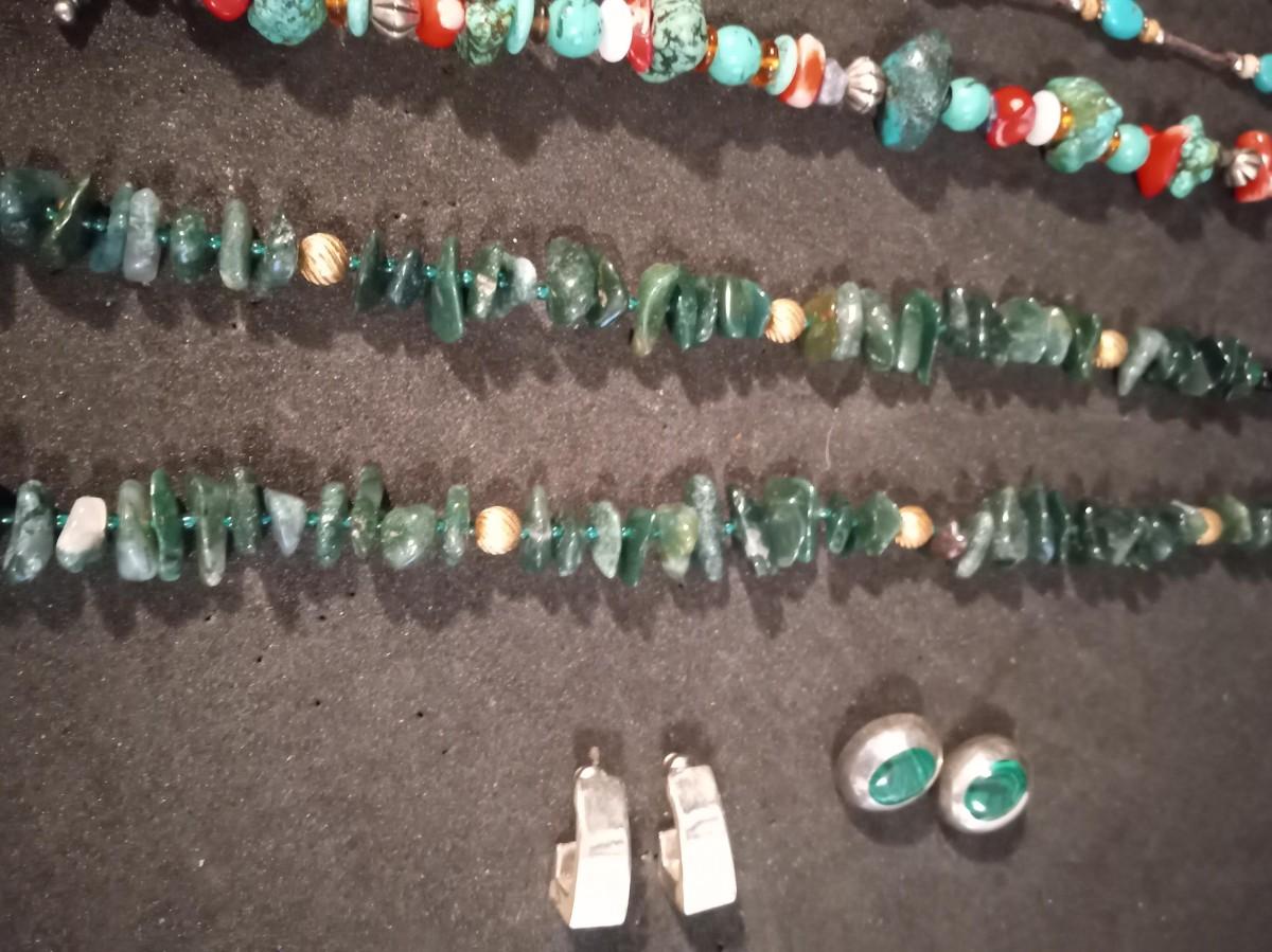 THIS LOT ALSO INCLUDES A PAIR OF STERLING PIERCED EARRINGS WITH A DARK GREEN STONE AND A PAIR OF SILVER TONE EARRINGS