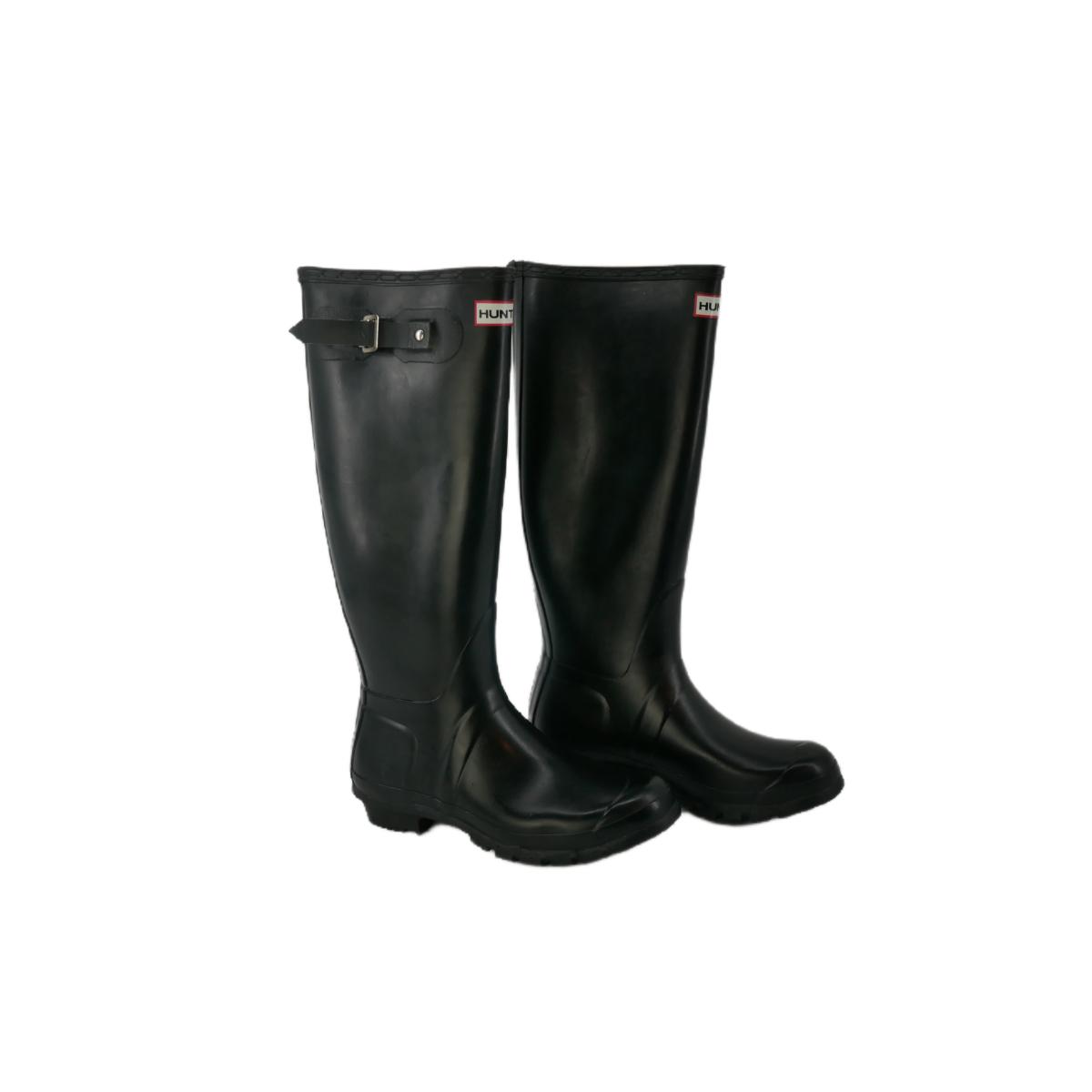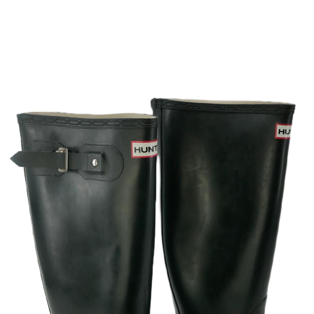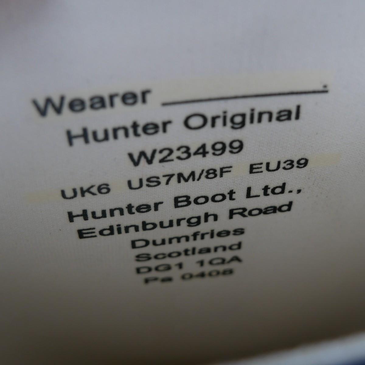 Hunter original rubber rubber rain boots or wellies. Made in Scotland #W23499. Height of shaft is 17" and boot has low heel. In excellent condition! Size UK 6, US 7M/8F, EU 39. Weighs 5 lbs. (F12)