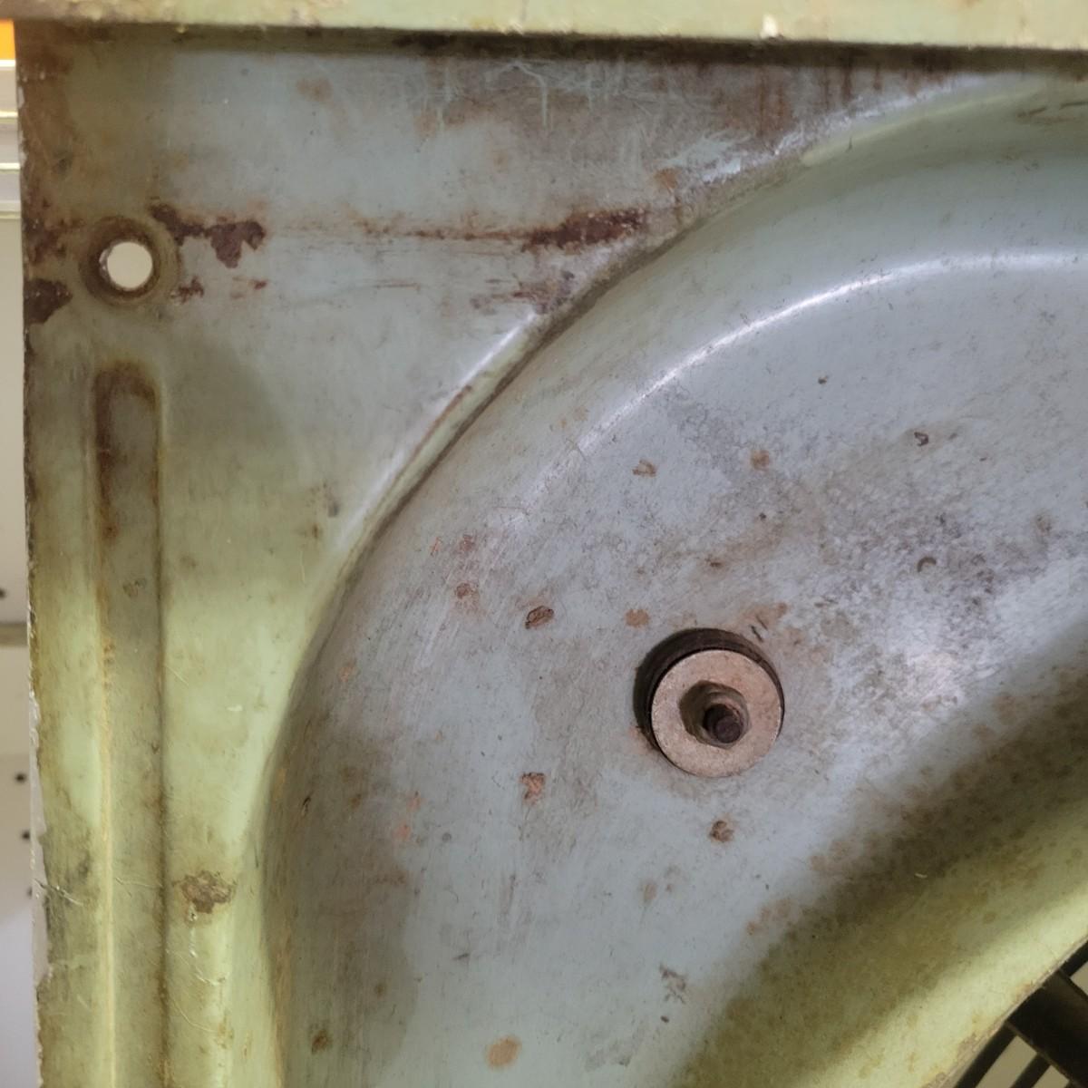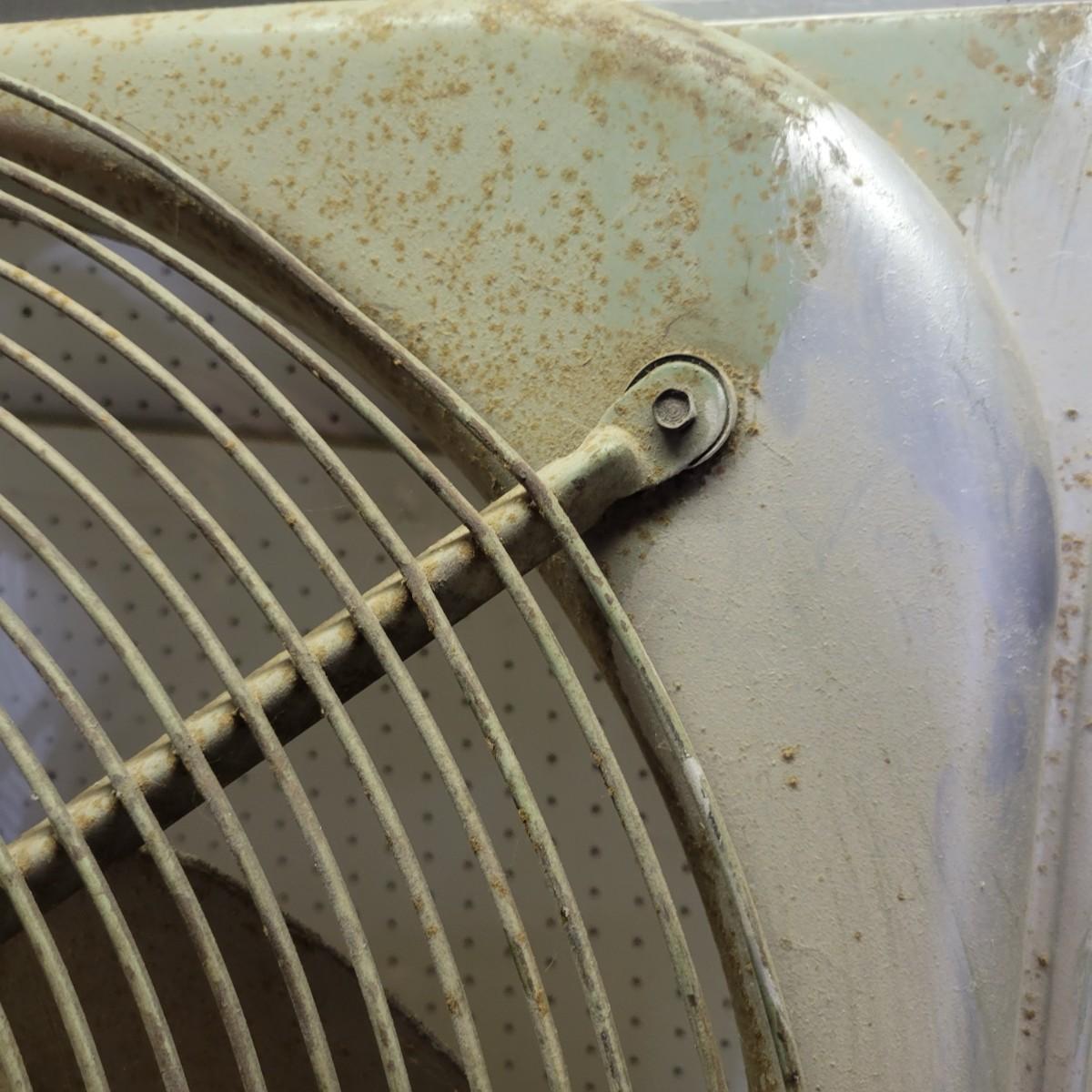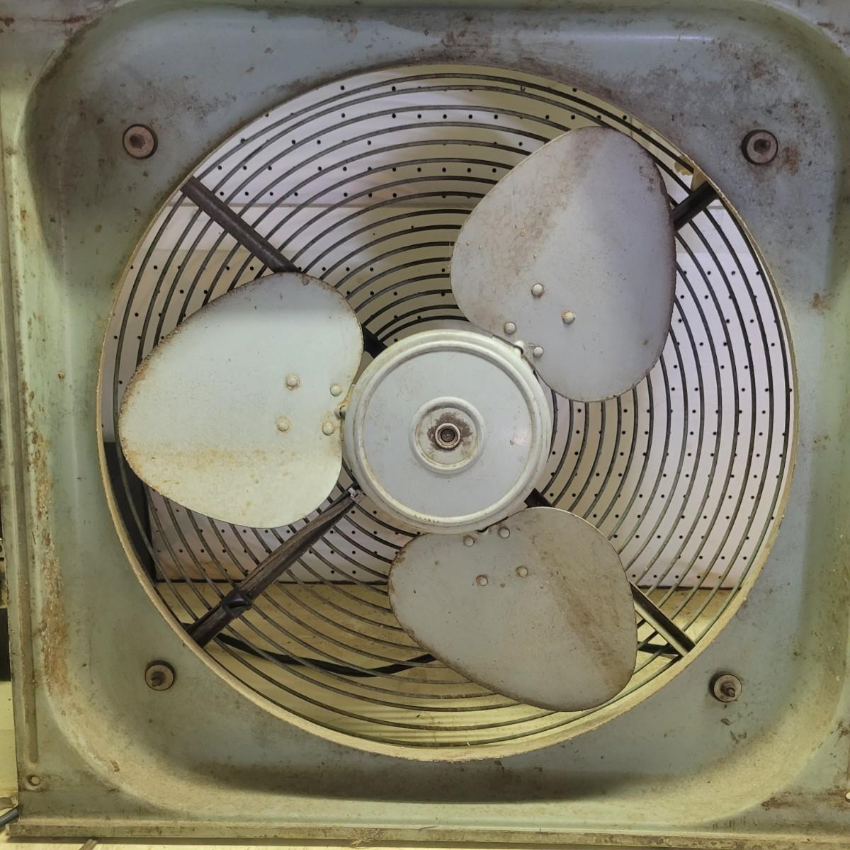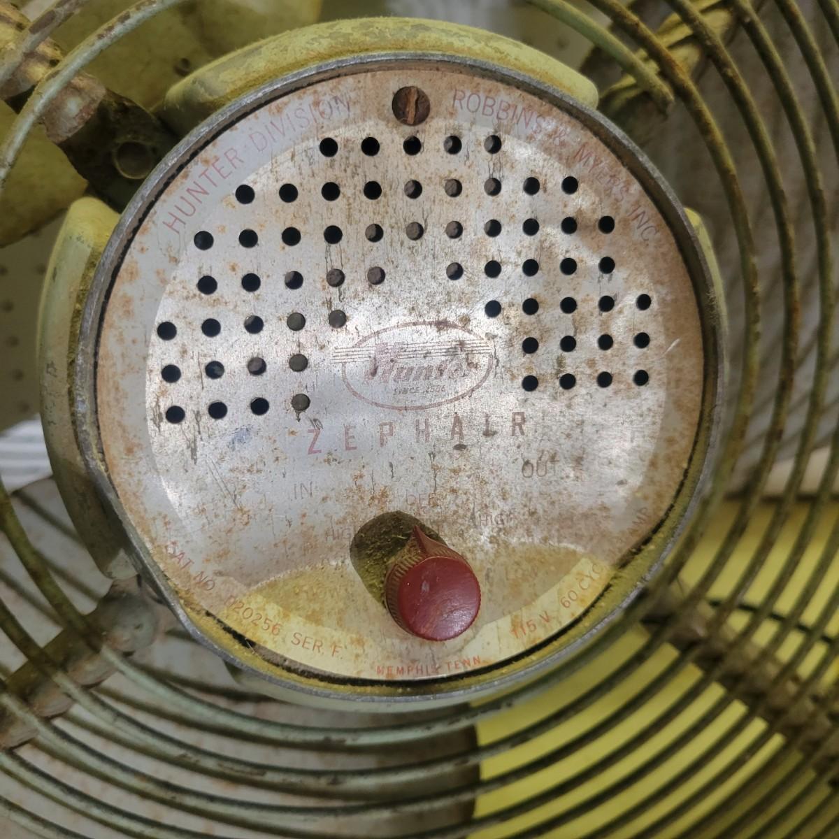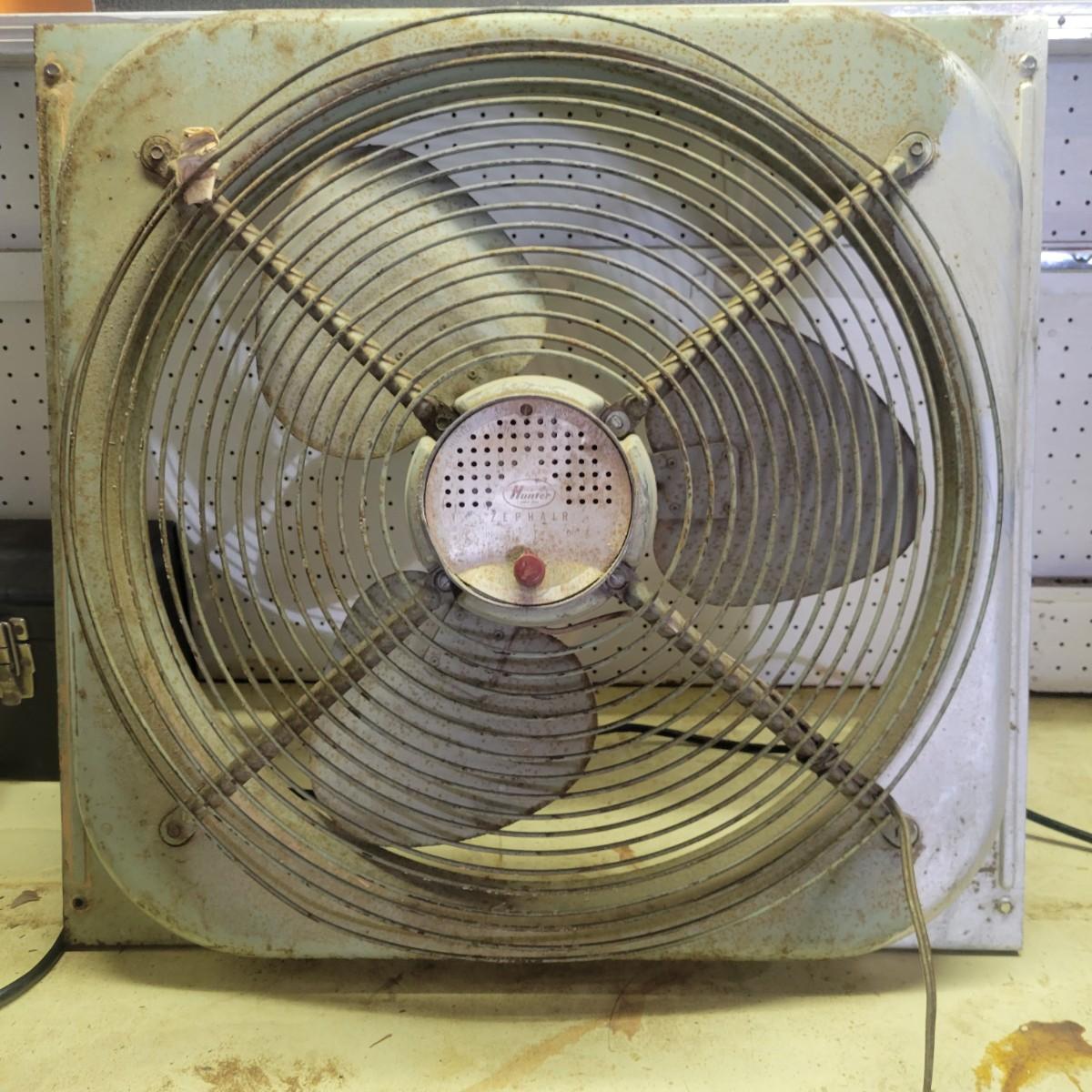 A Hunter Zephair fan in fair condition with rusty areas and the front facing is missing. Item was tested and works. Has an in and out switch. Constructed of a heavy guage steel. Measures approximately 26" x 24.5" x 8" Local pickup only