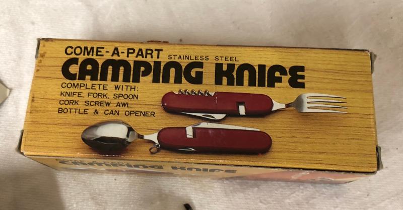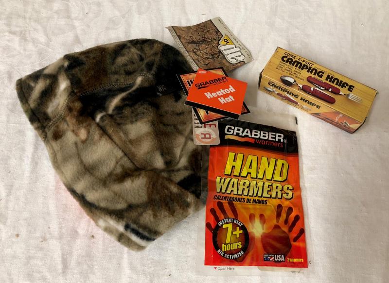 Come-A-Part Stainless Steel Camping Knife..Fleece camo cap and pocket warmers...