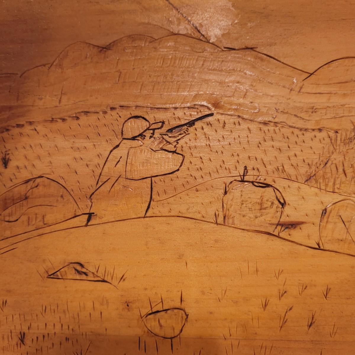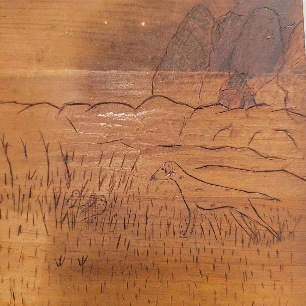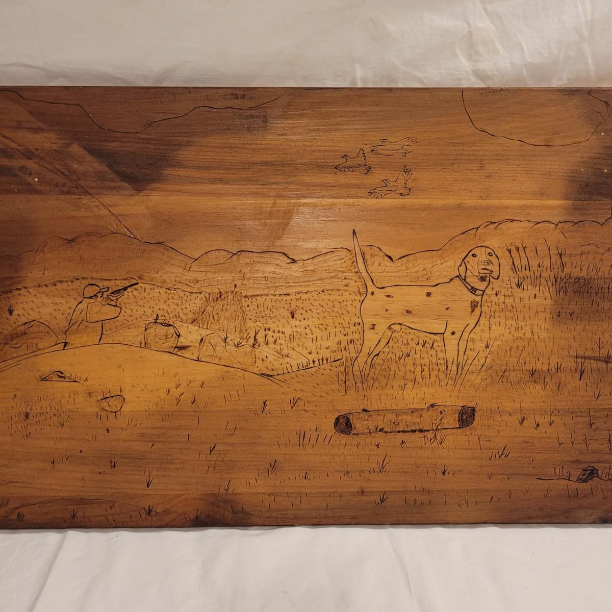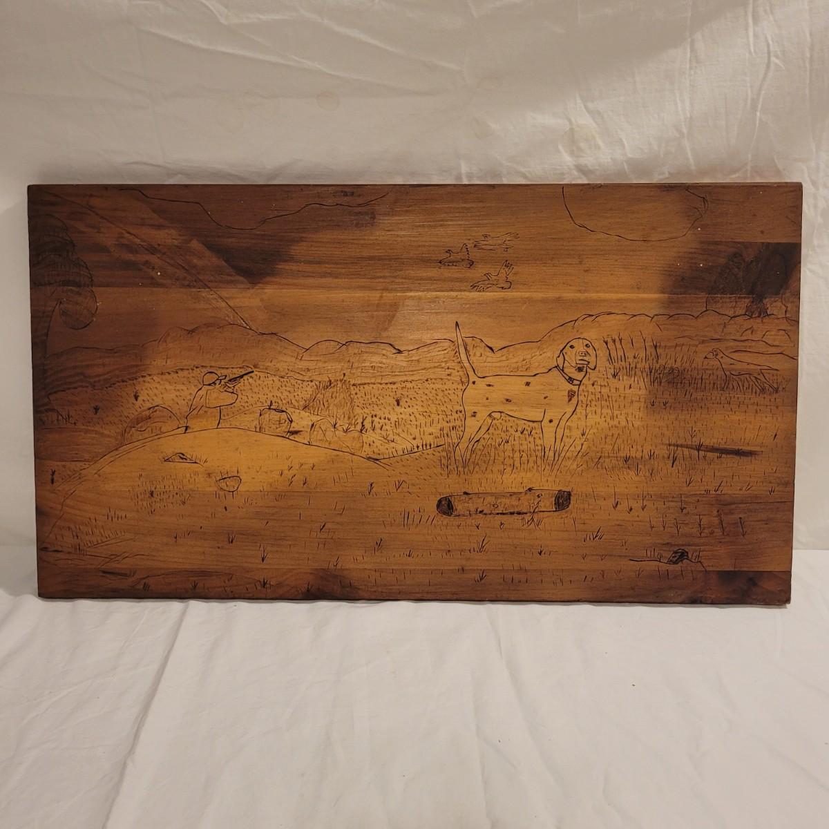 This lot includes one piece of wooden folk art. The piece depicts a dog and man on a hunting trip with rolling hills and birds in the sky. It is a Pyrograph, meaning wood burning art. It is done on a solid piece of wood that could easily be mounted or hung. The wood measures 24" x 14"H. There does not appear to be an artists signature or makers mark.