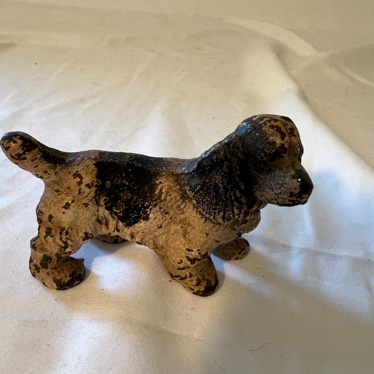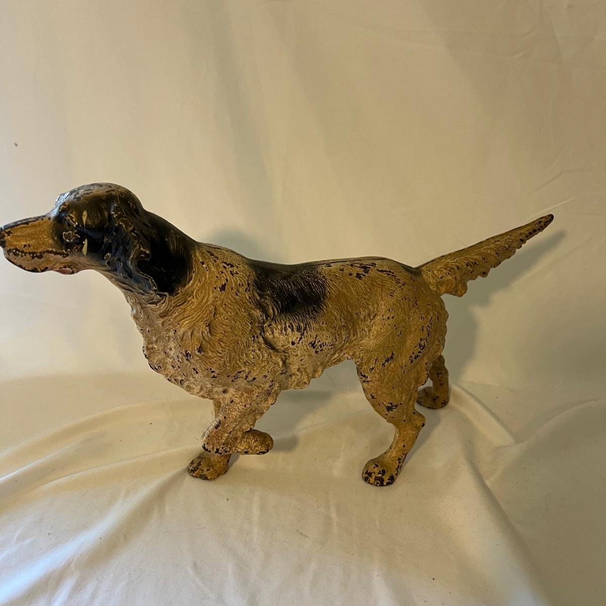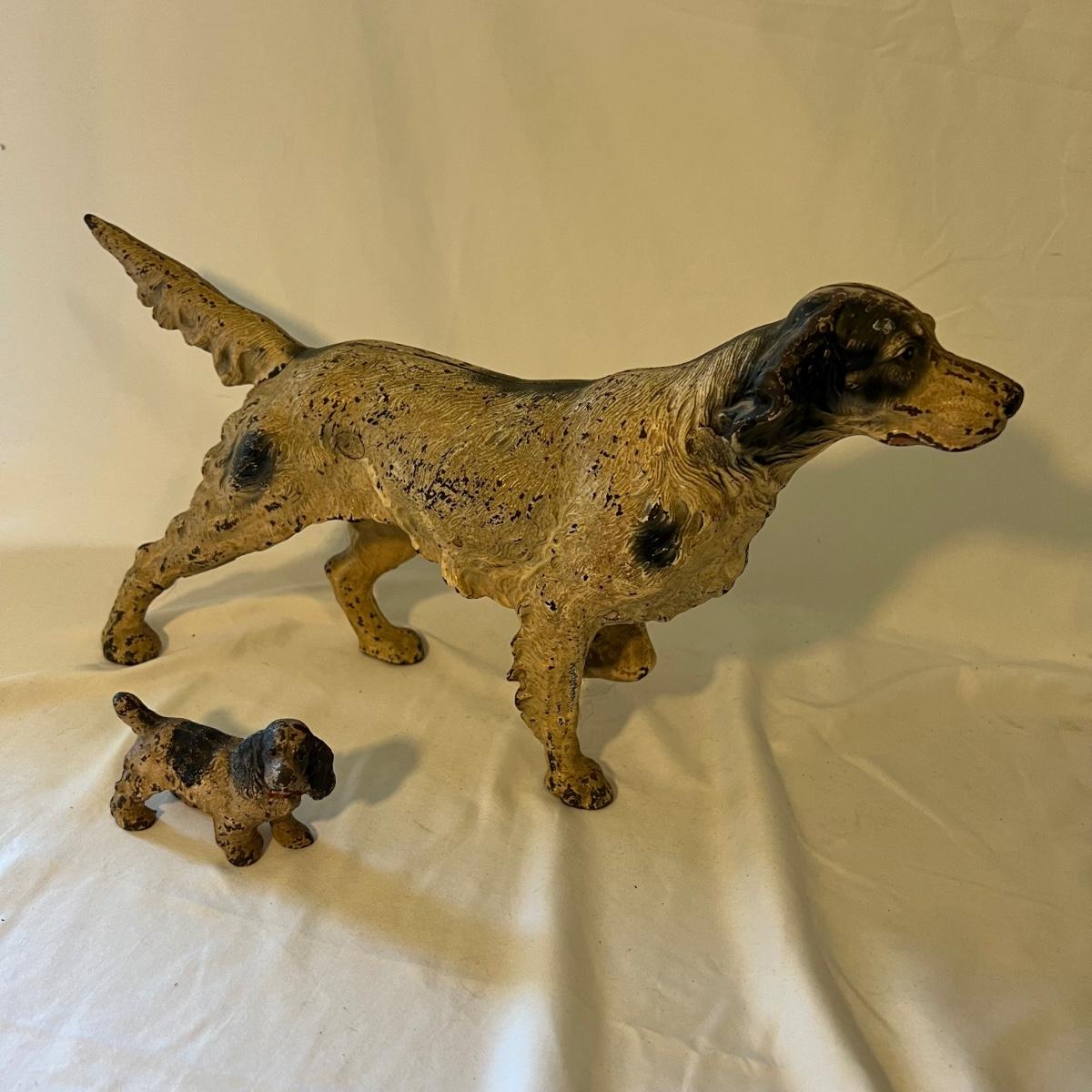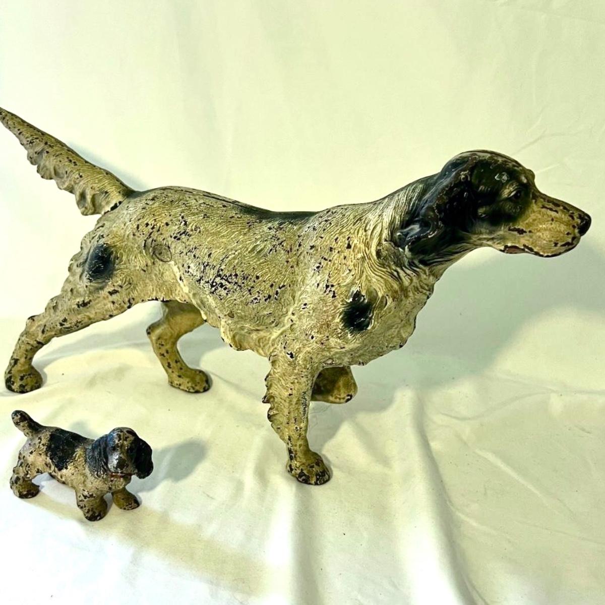 Two cast iron dogs. The larger hunting dog door stop has a sticker stating Hubley and measures approximately 16” x 3” x 9”H. The small cocker spaniel paperweight measures 3.5” x 1.25” x 2.25”H. Shipping available.