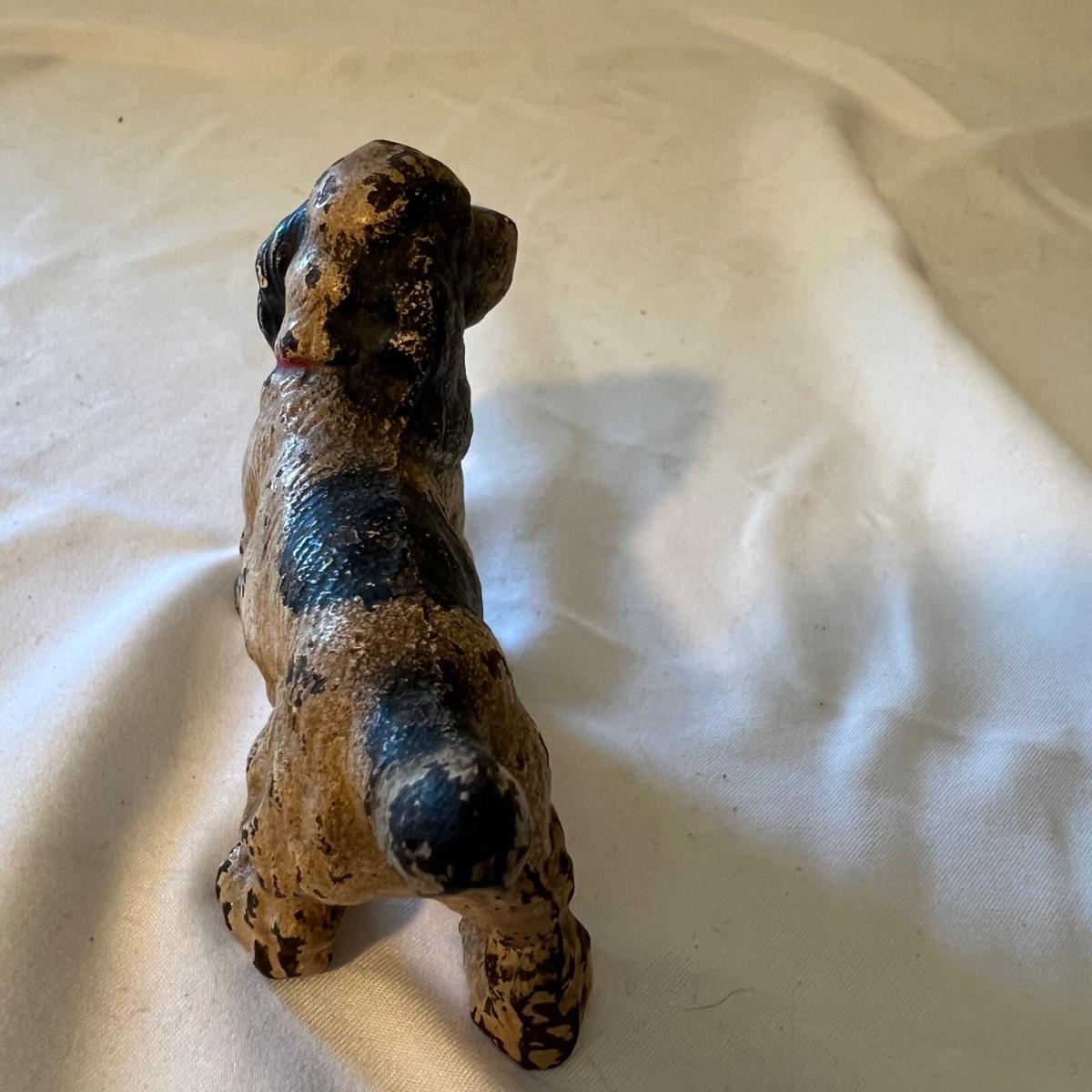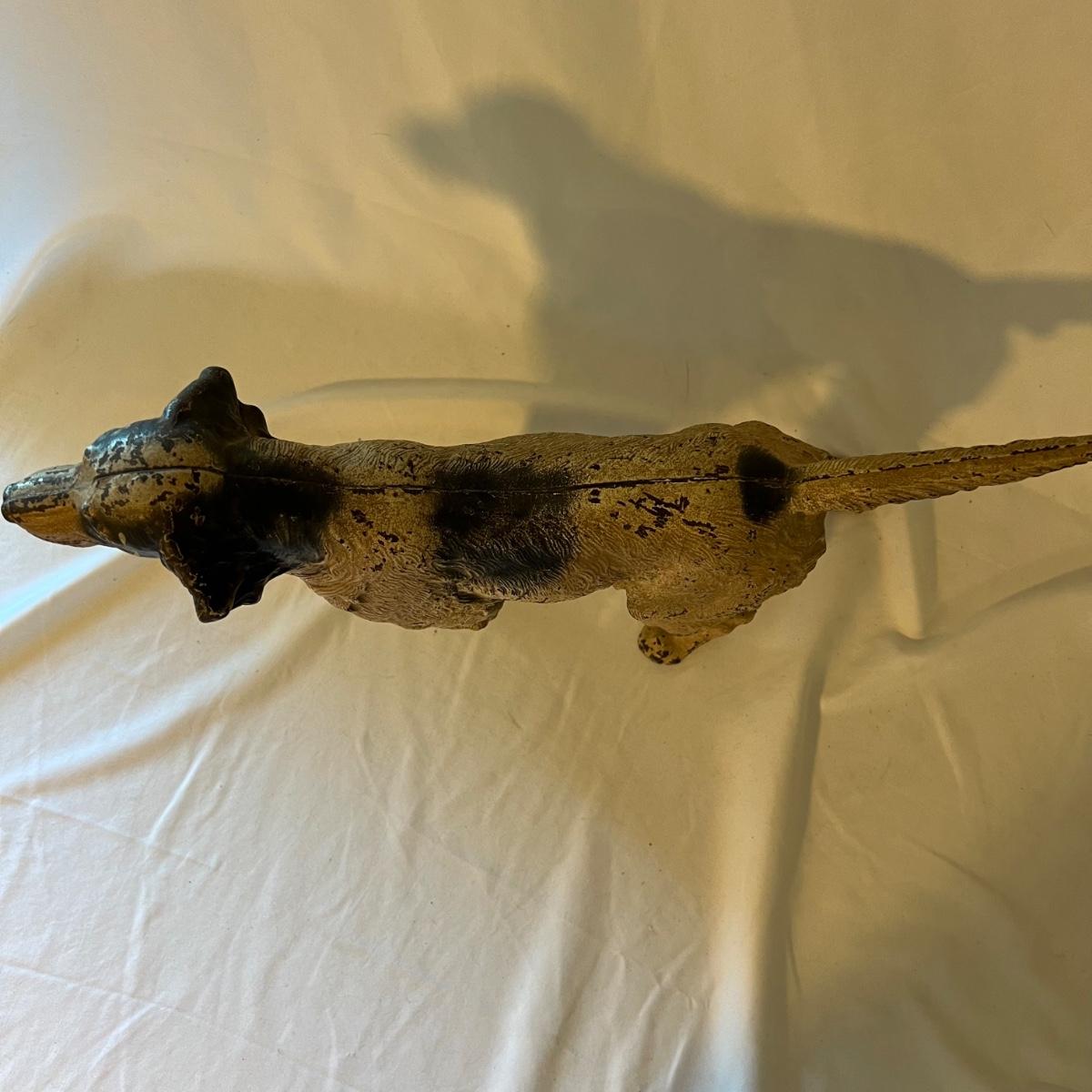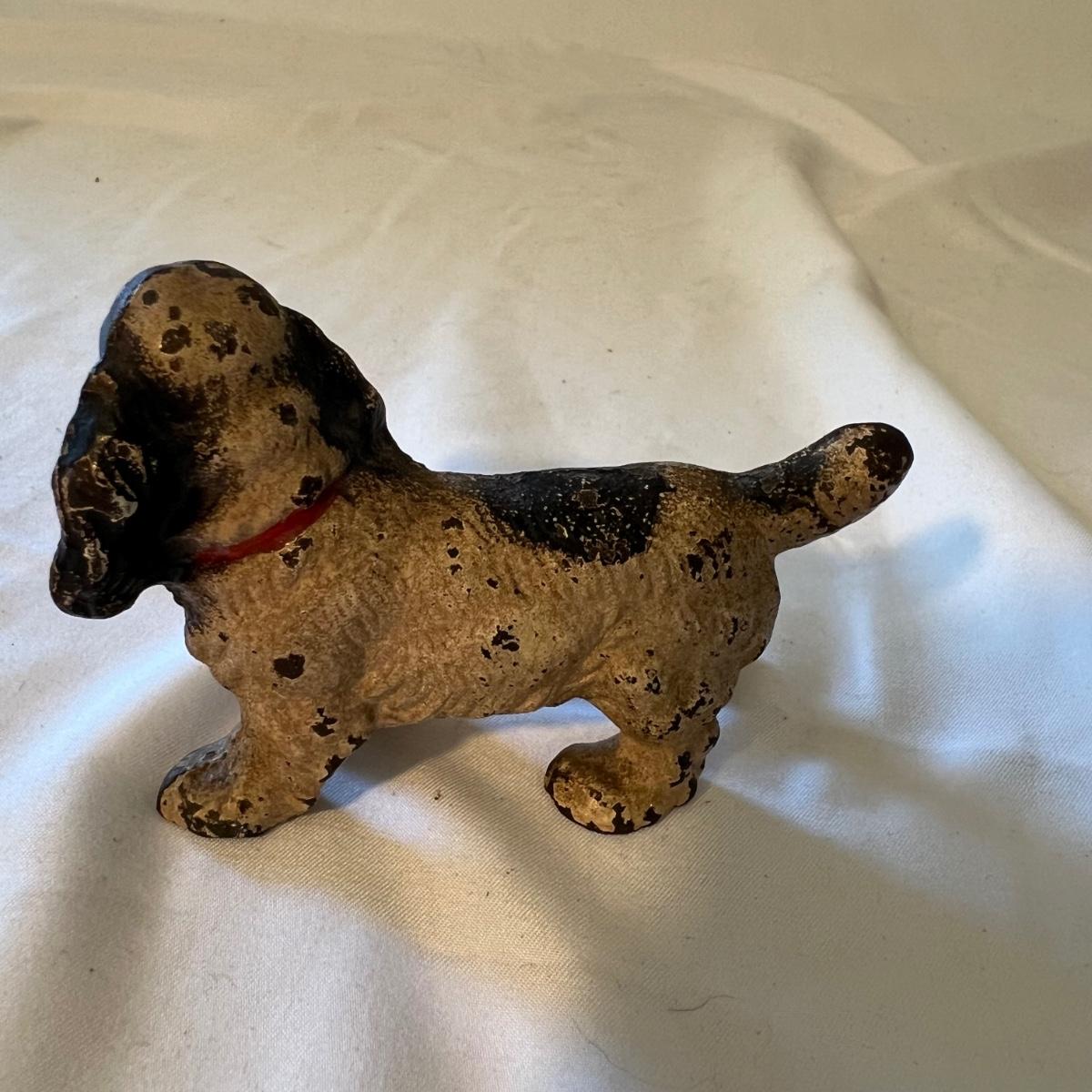 Two cast iron dogs. The larger hunting dog door stop has a sticker stating Hubley and measures approximately 16” x 3” x 9”H. The small cocker spaniel paperweight measures 3.5” x 1.25” x 2.25”H. Shipping available.