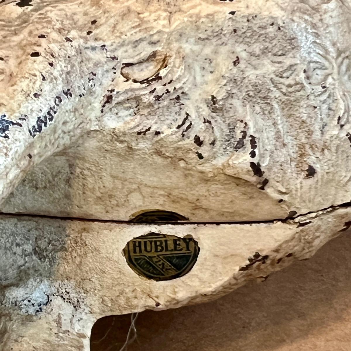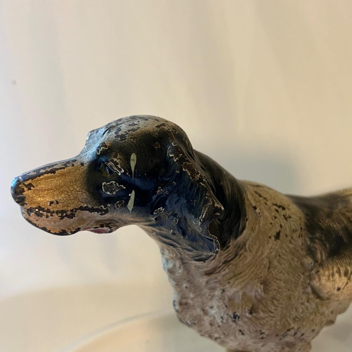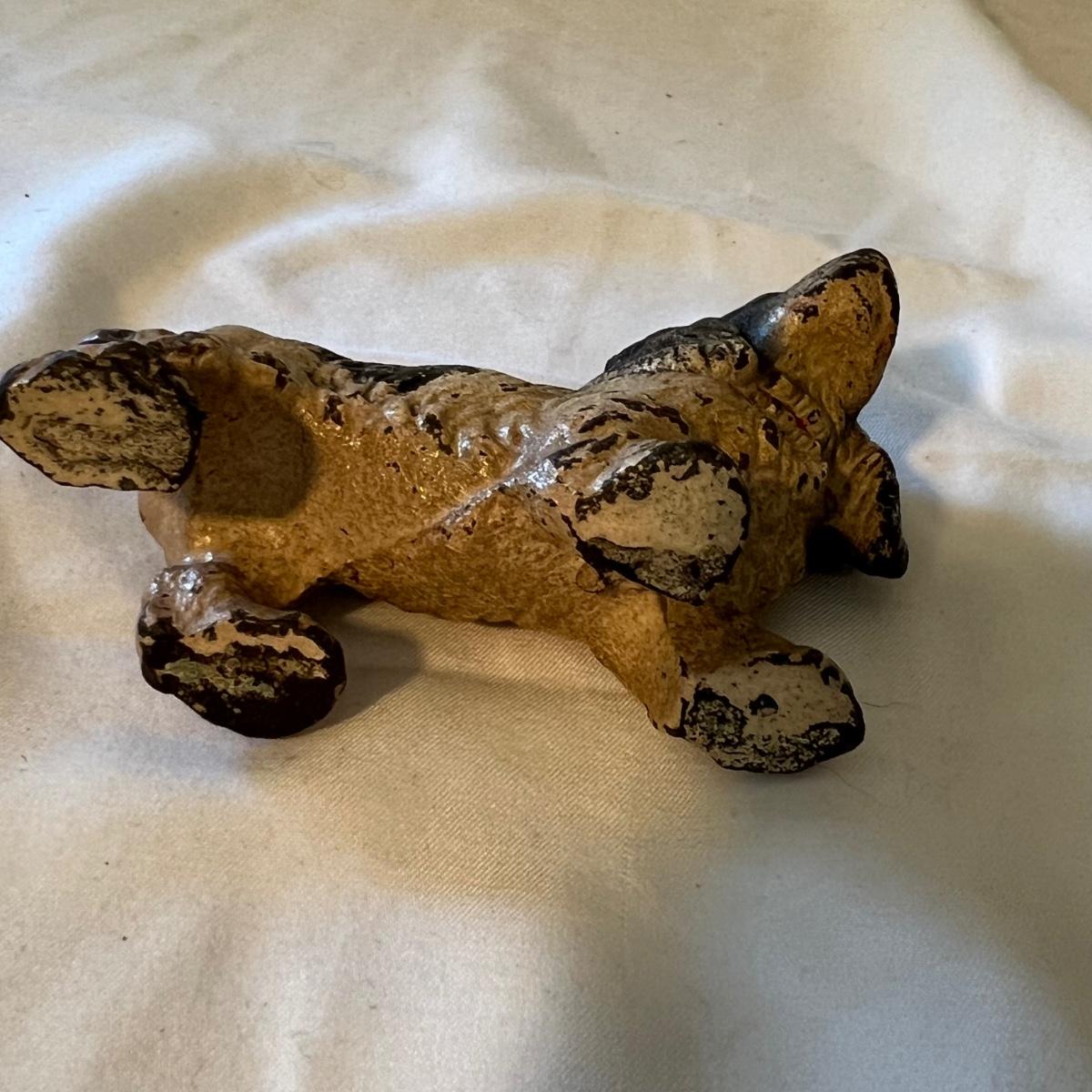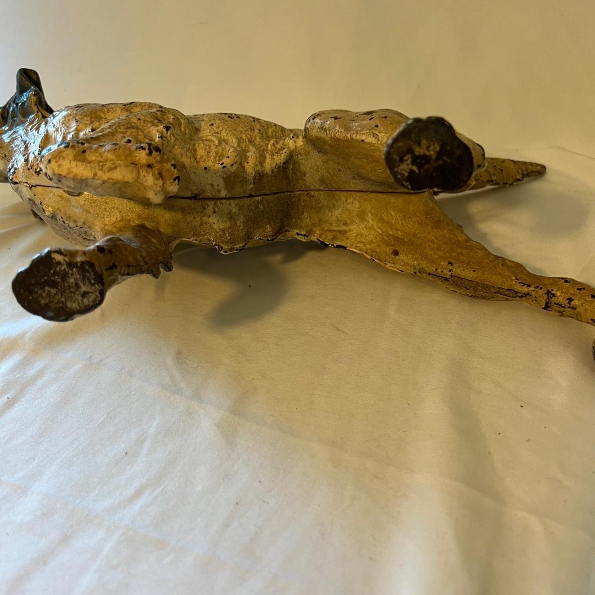 Two cast iron dogs. The larger hunting dog door stop has a sticker stating Hubley and measures approximately 16” x 3” x 9”H. The small cocker spaniel paperweight measures 3.5” x 1.25” x 2.25”H. Shipping available.