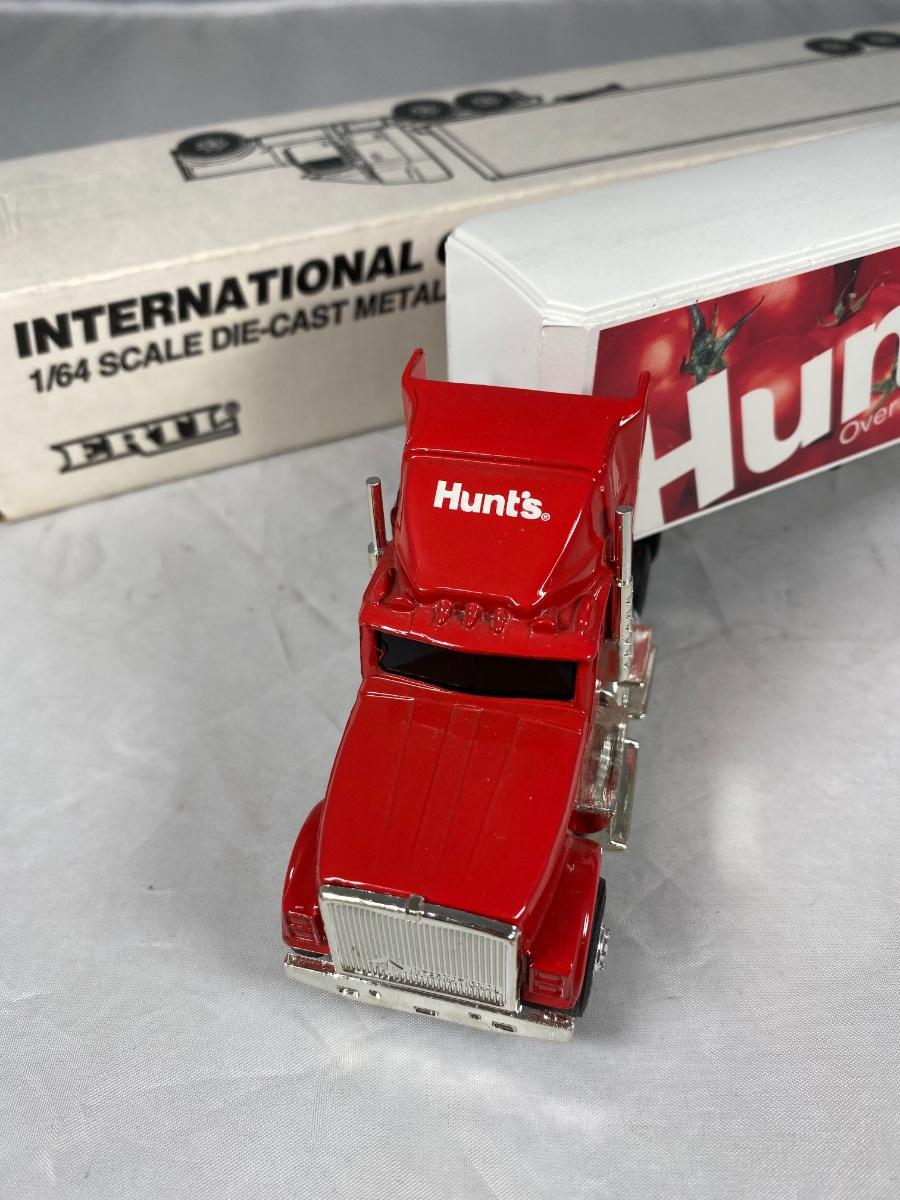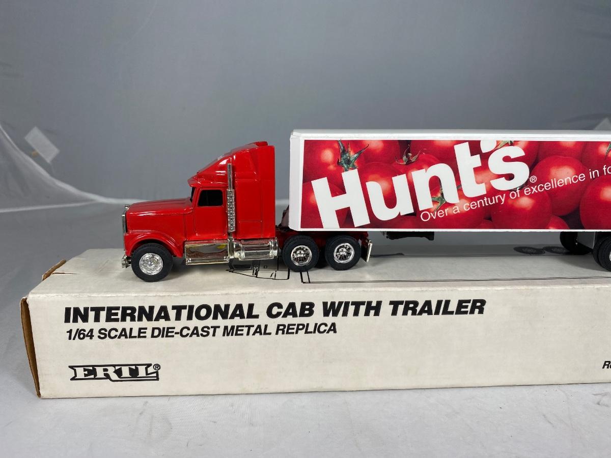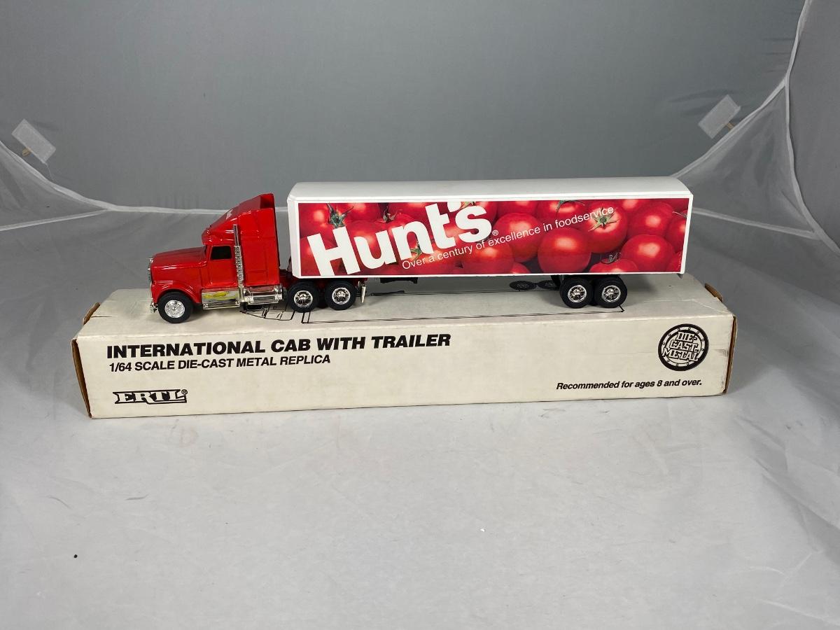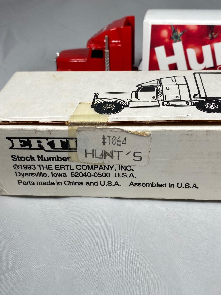 Die-cast scale model semi cab with trailer featuring Hunt's tomatoes on the trailer. Comes in original box. In very good condition. Made by The ERTL Company.