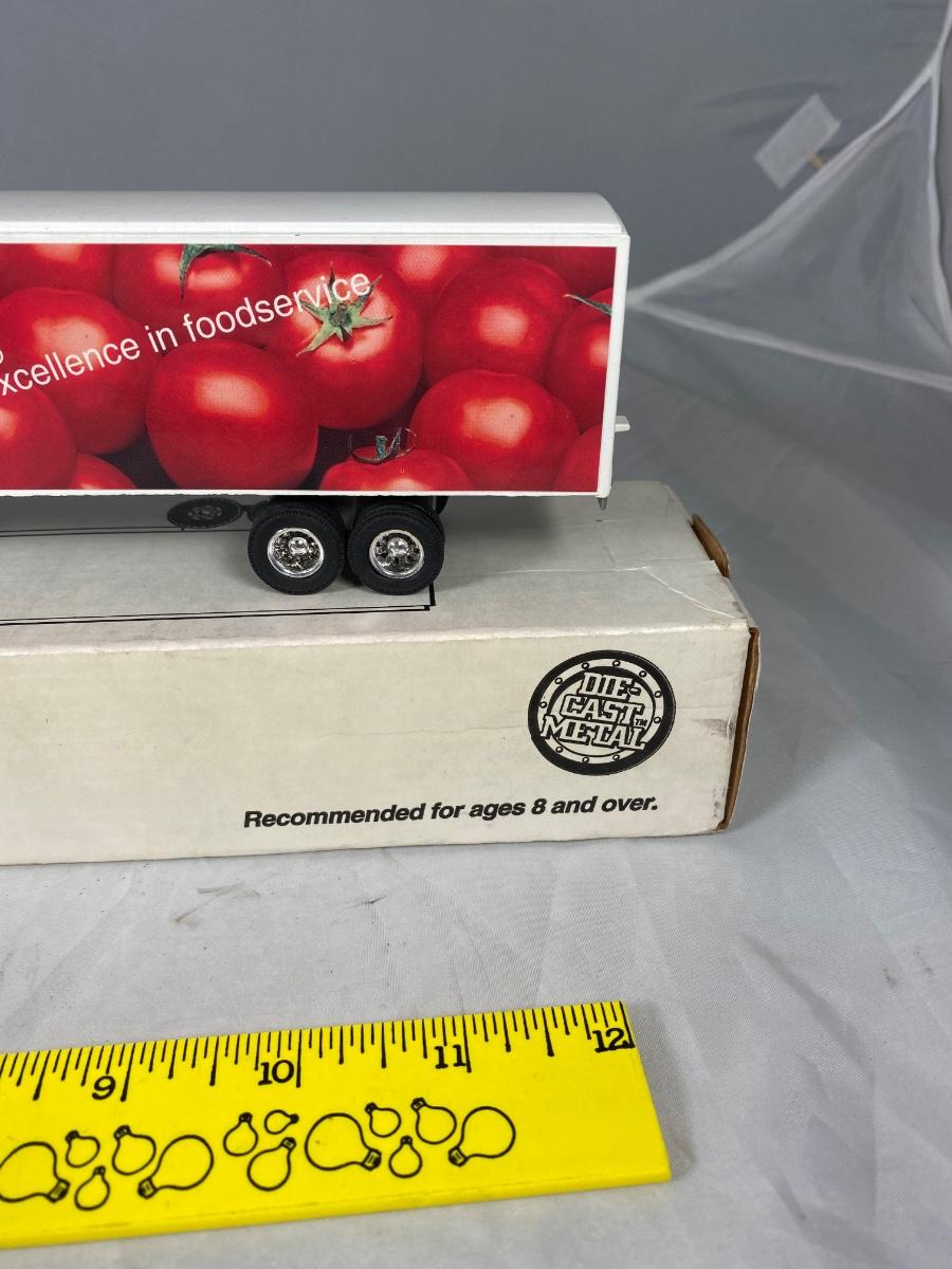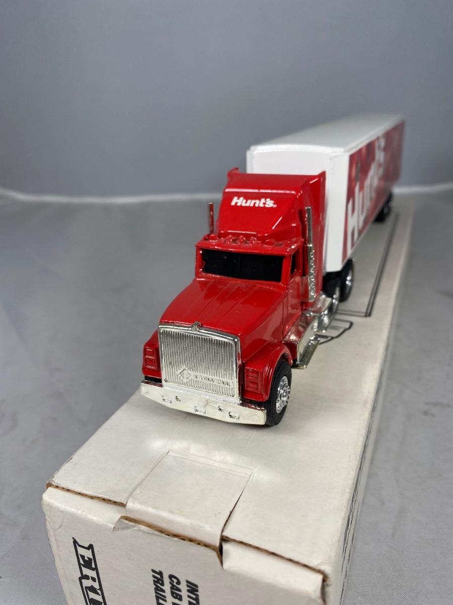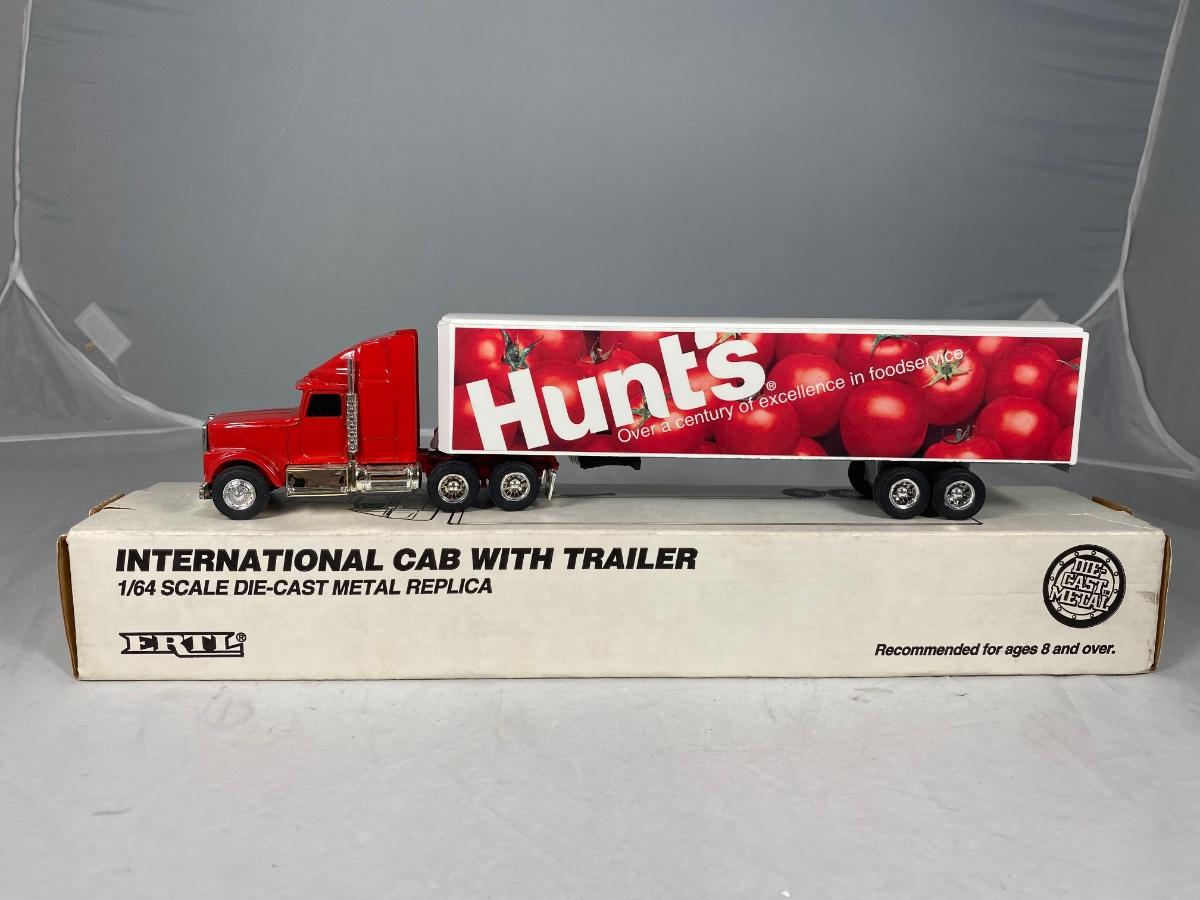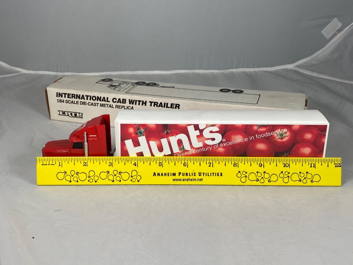 Die-cast scale model semi cab with trailer featuring Hunt's tomatoes on the trailer. Comes in original box. In very good condition. Made by The ERTL Company.