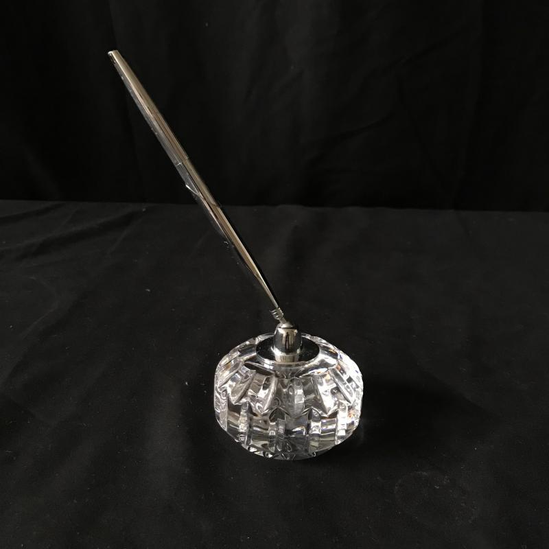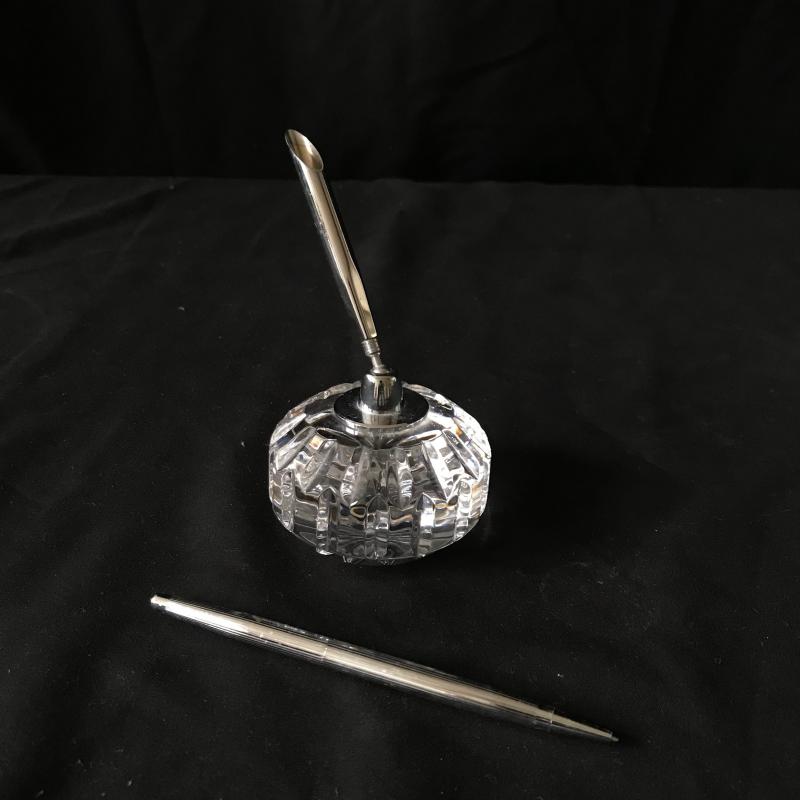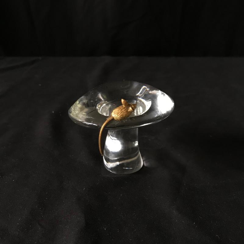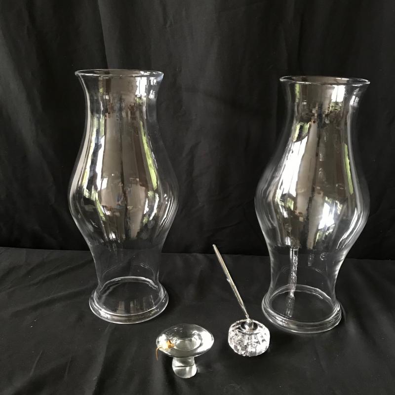 Lot contains matching hurricane glass vases (approx. 17.5” tall and 8” in diameter), glass pen holder with pen, and glass mushroom (approx. 3” tall) with gold mouse. No shipping available. Local pickup only in Hendersonville, NC.