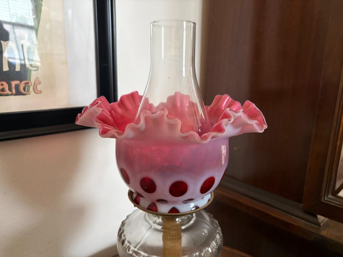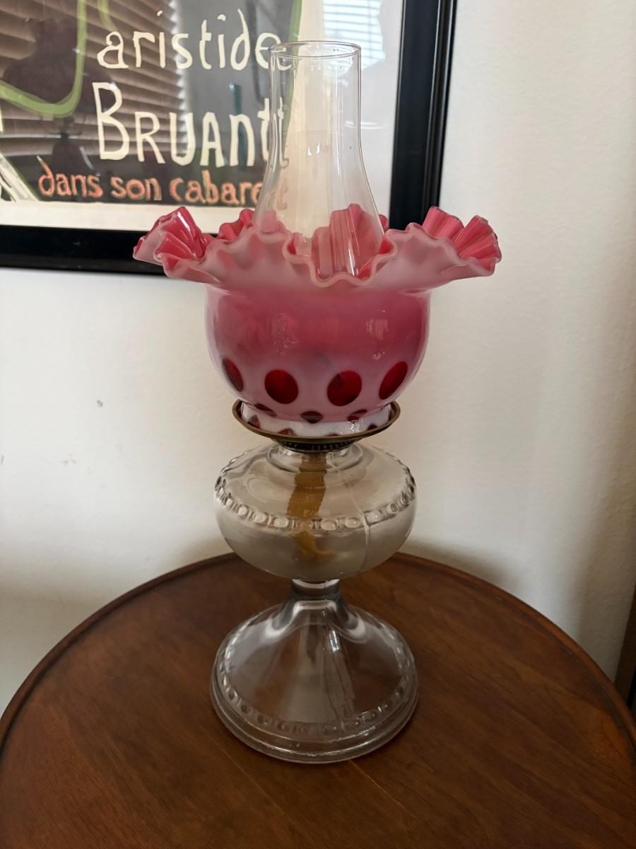 Hurricane lamp with pink Fenton ruffled shade