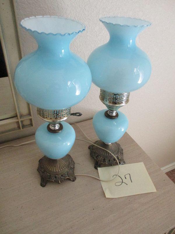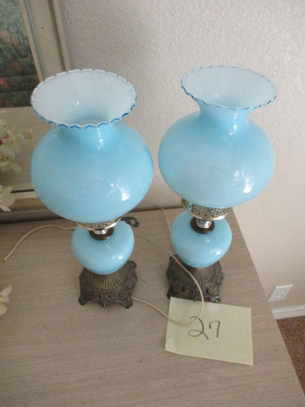 Two baby blue hurricane lamps. Great condition. Metal base. Approx 16 1/2in tall.