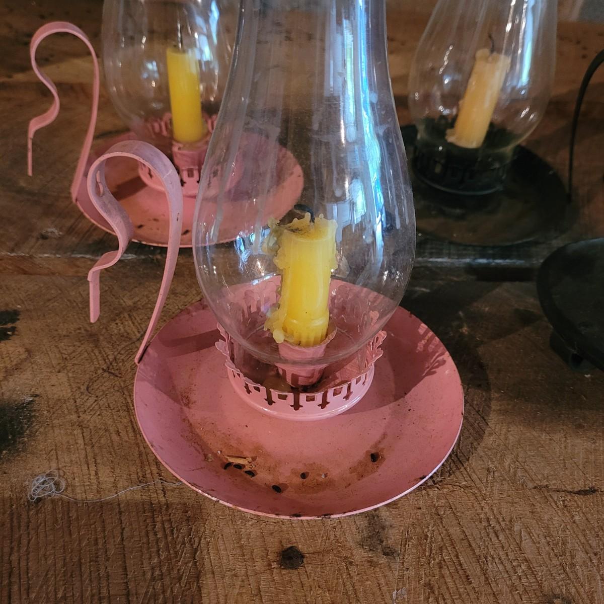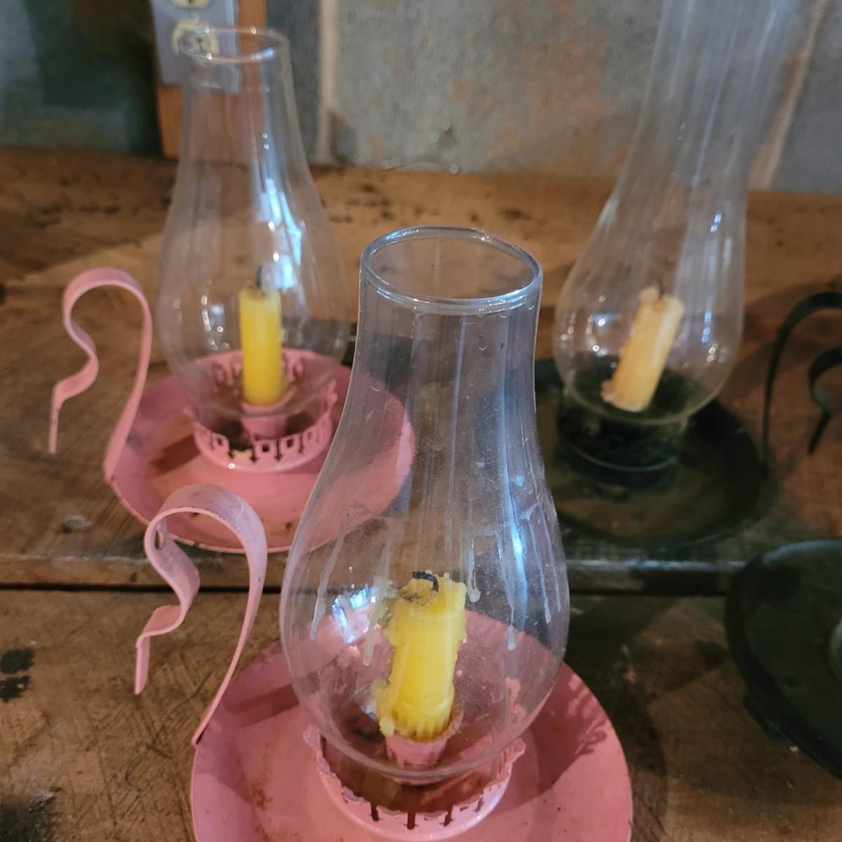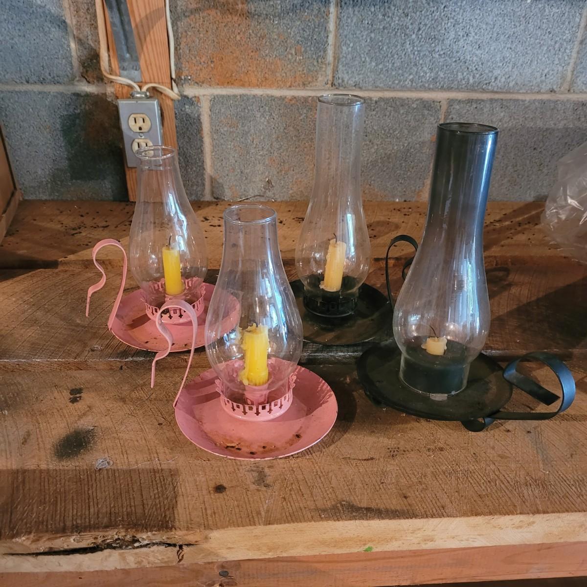 Four small handheld hurricane lamps make a useful addition to the home. Smaller pink lamps measure approximately 6.5"D x 8.5"H. Shipping available.