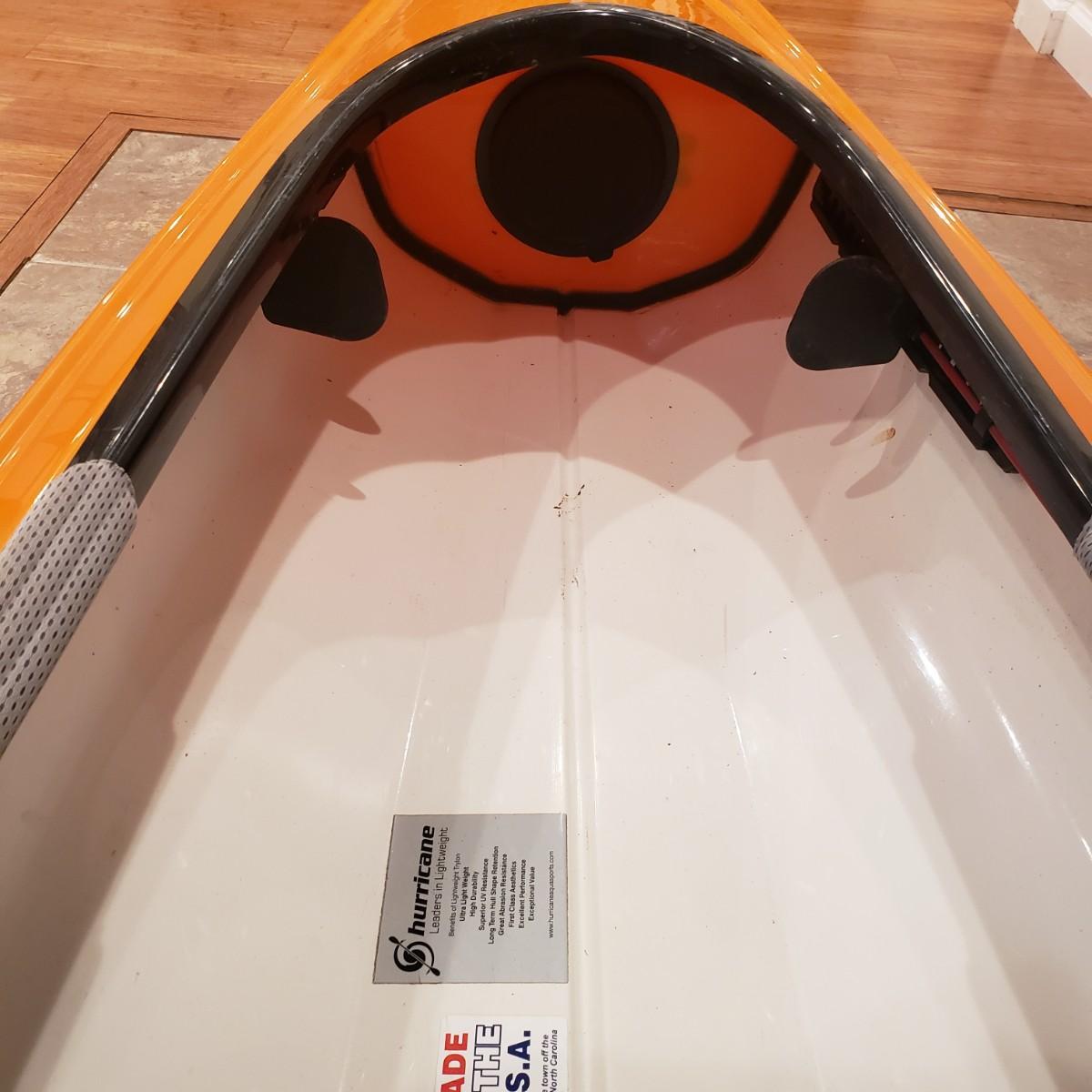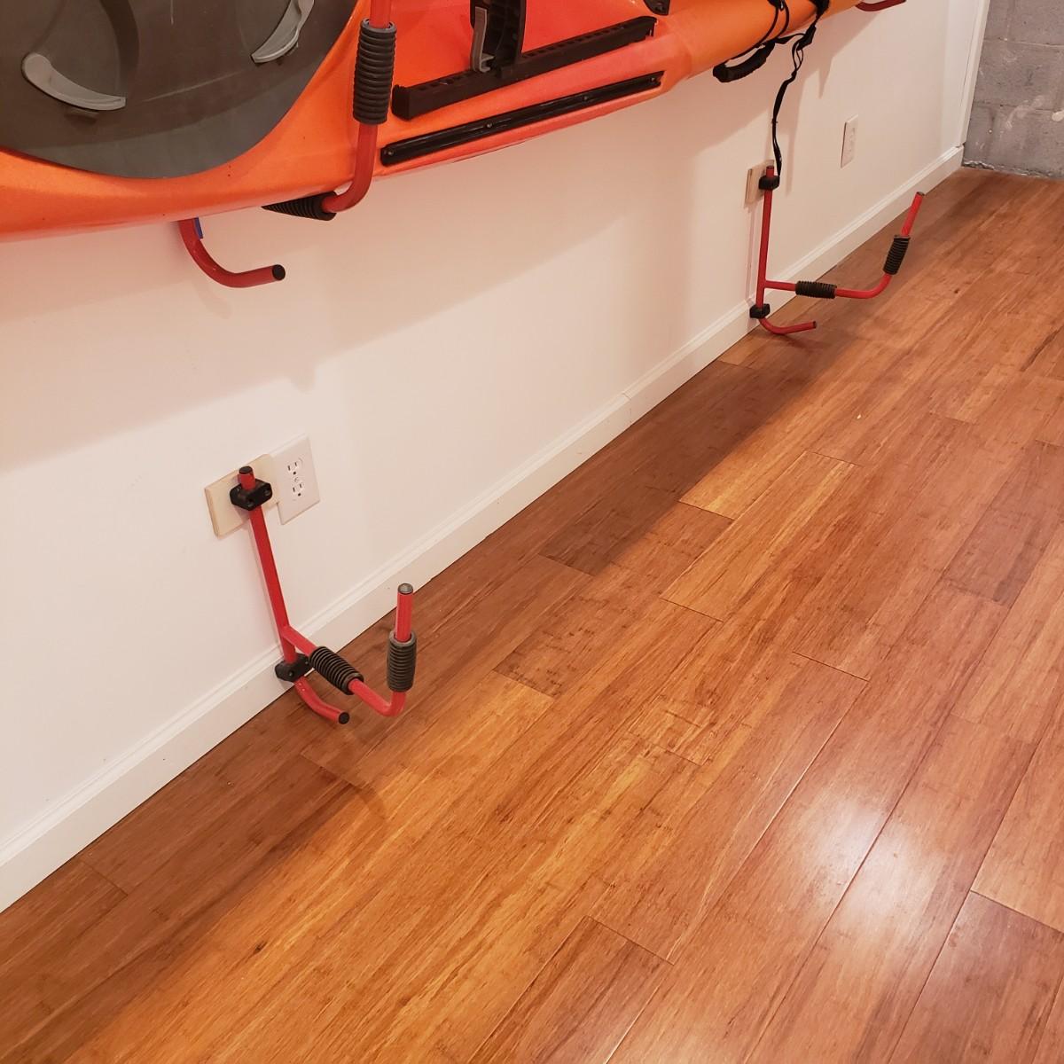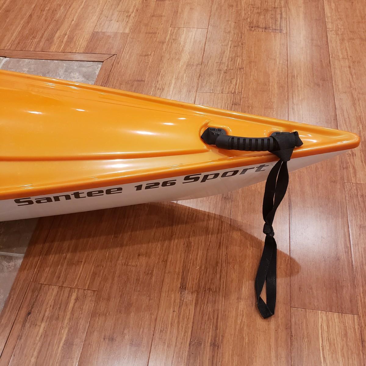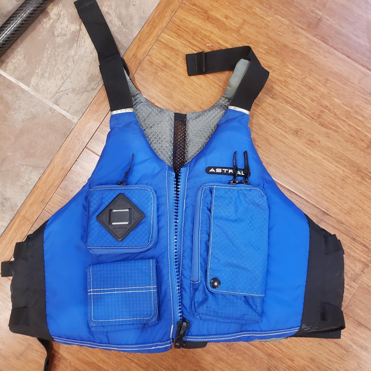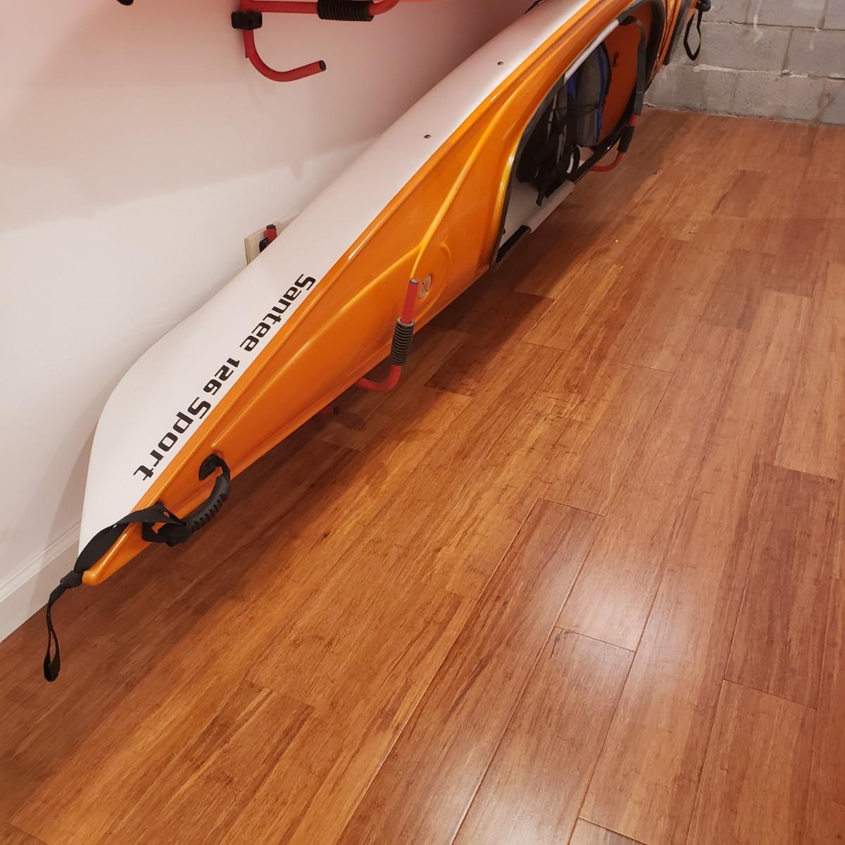 This super light weight kayak features adjustable foot holders, two water tight compartments, a Canon paddle and a Astral size small life jacket. There are two racks to hold Kayak against a wall. Please bring Phillips screwdriver to assist.