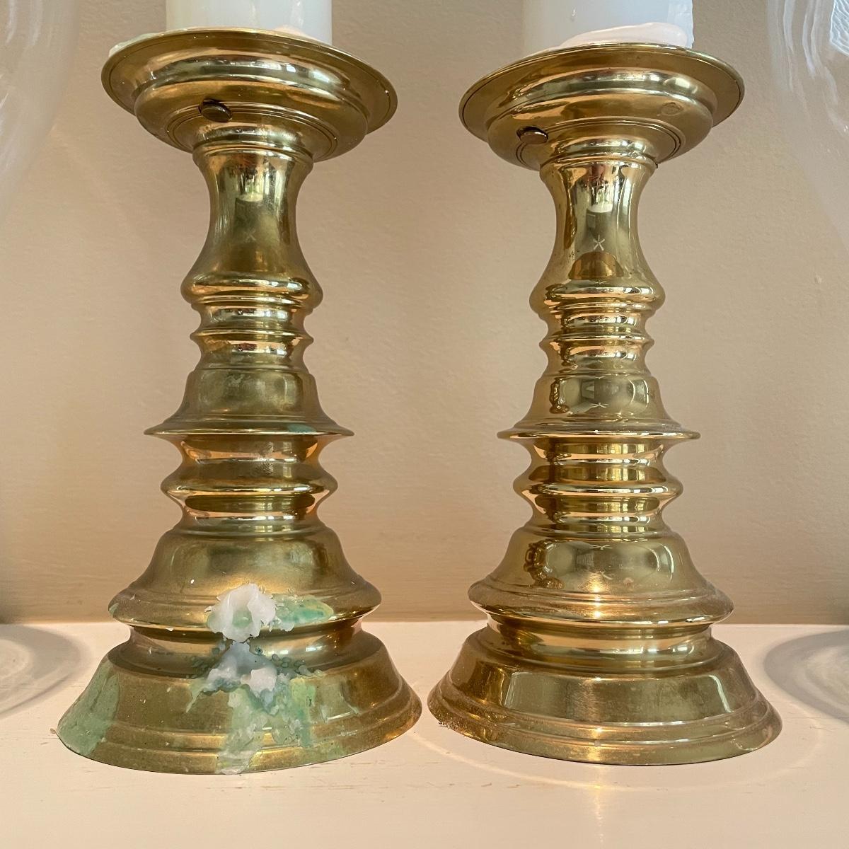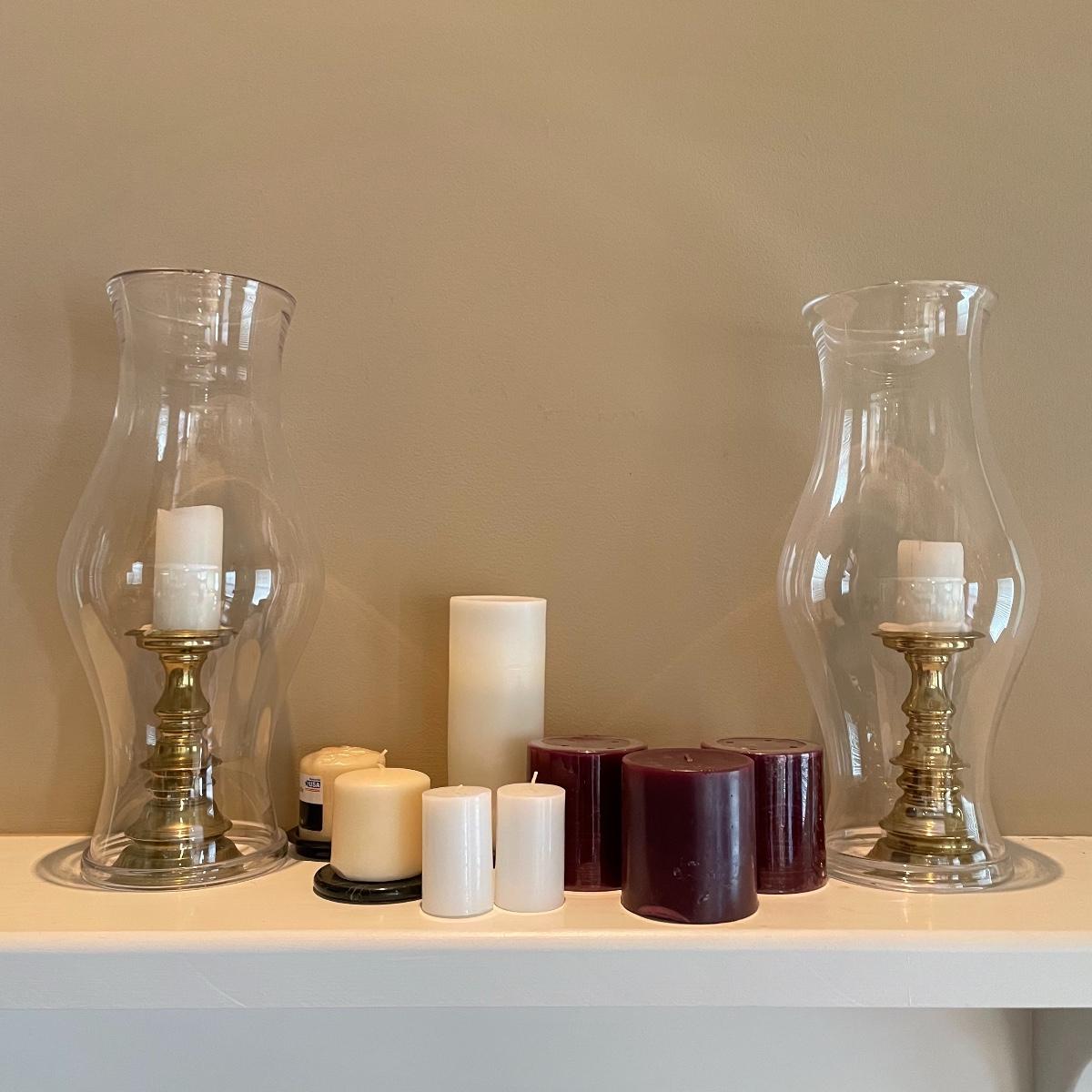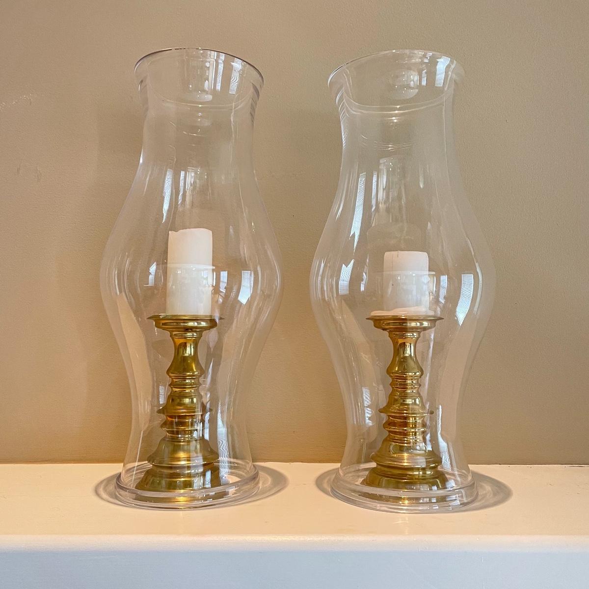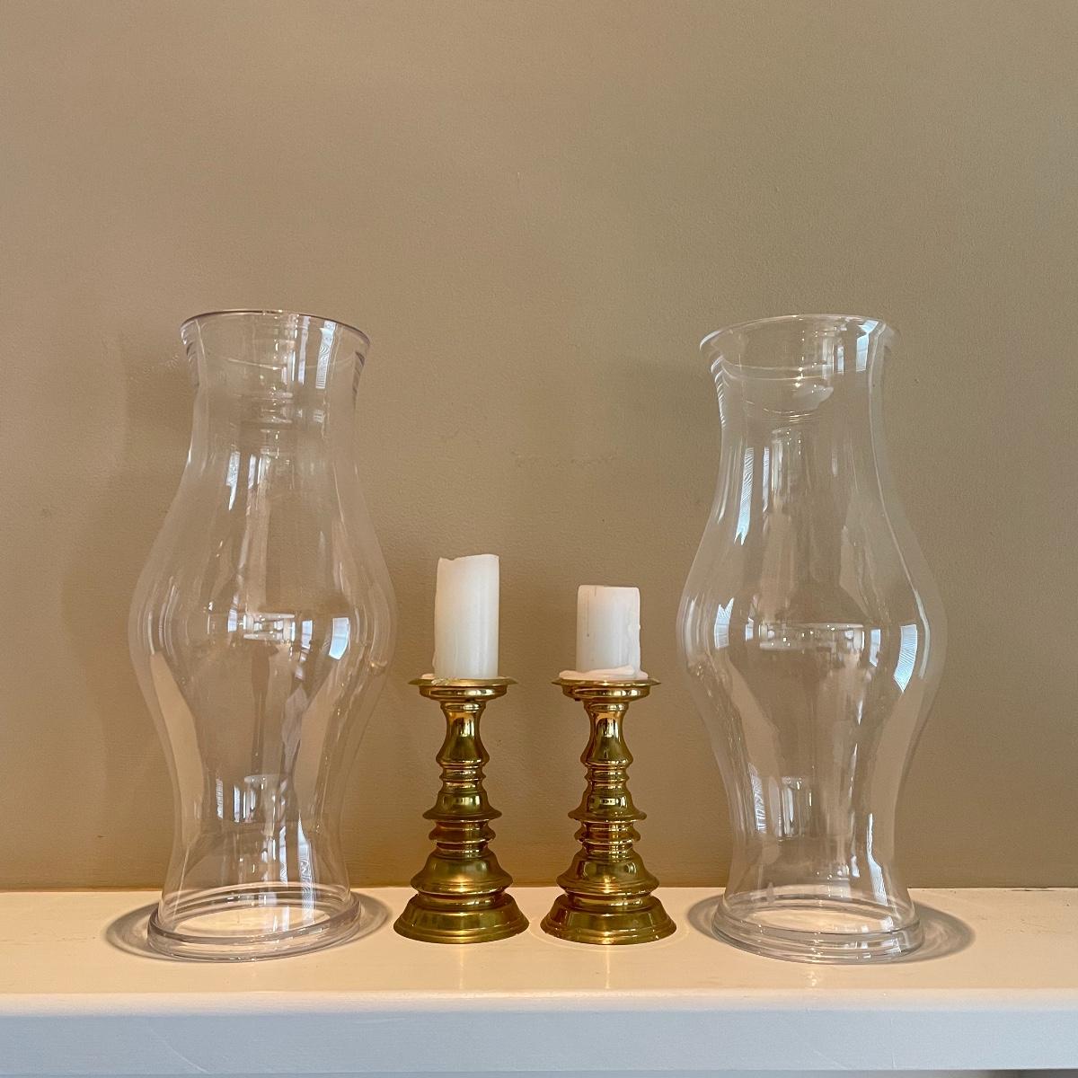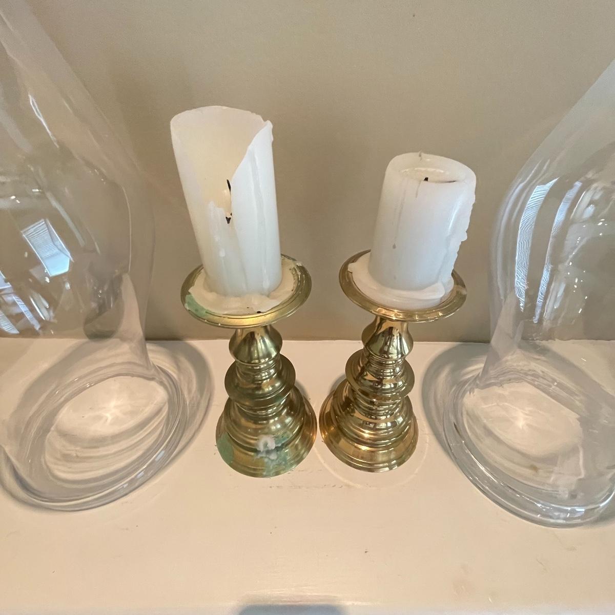 A set of two heavy, hollow brass candle holders standing 7.5” tall with matching glass Hurricane shades standing 18” tall. Lot also includes one 8” tall battery operated candle with seven wax candles and three coasters. One coaster is stoneware and the other two appear to be green marble. See images. Local pick up only.