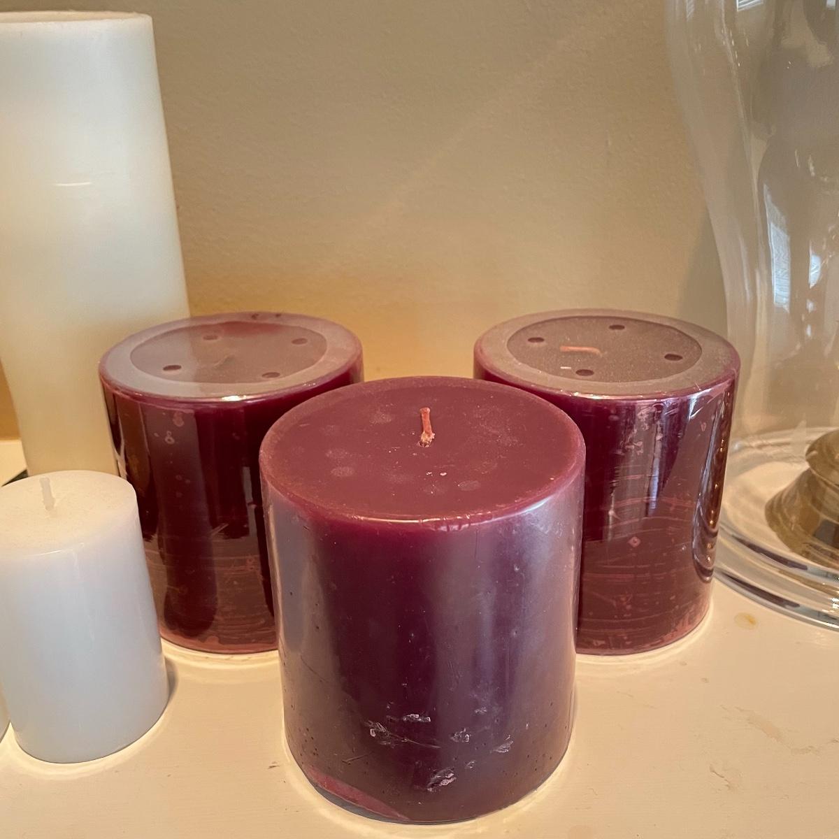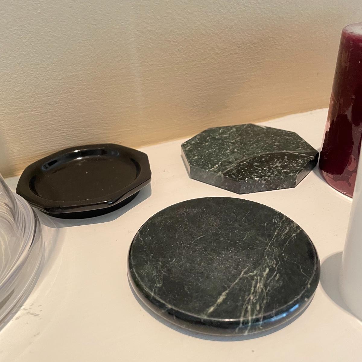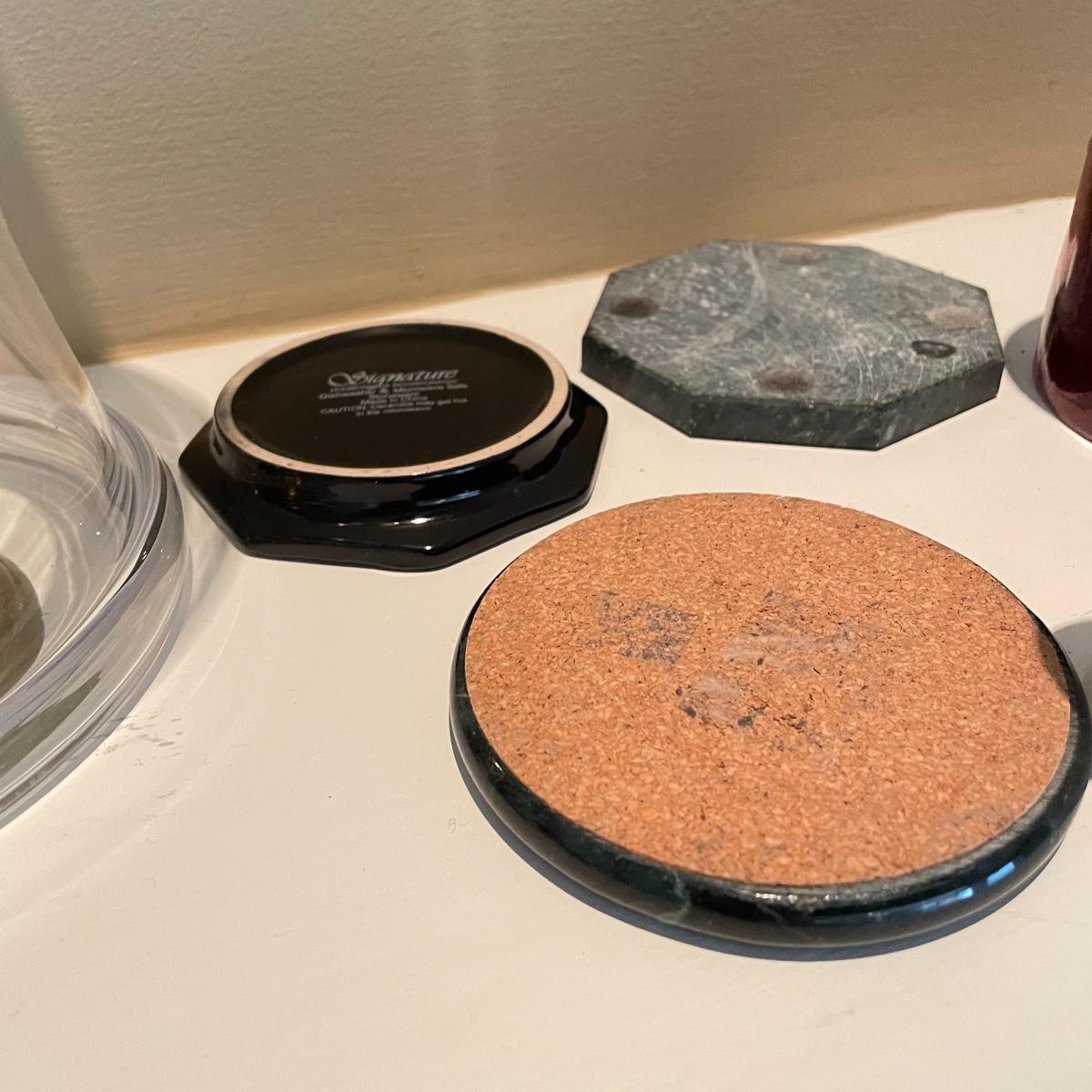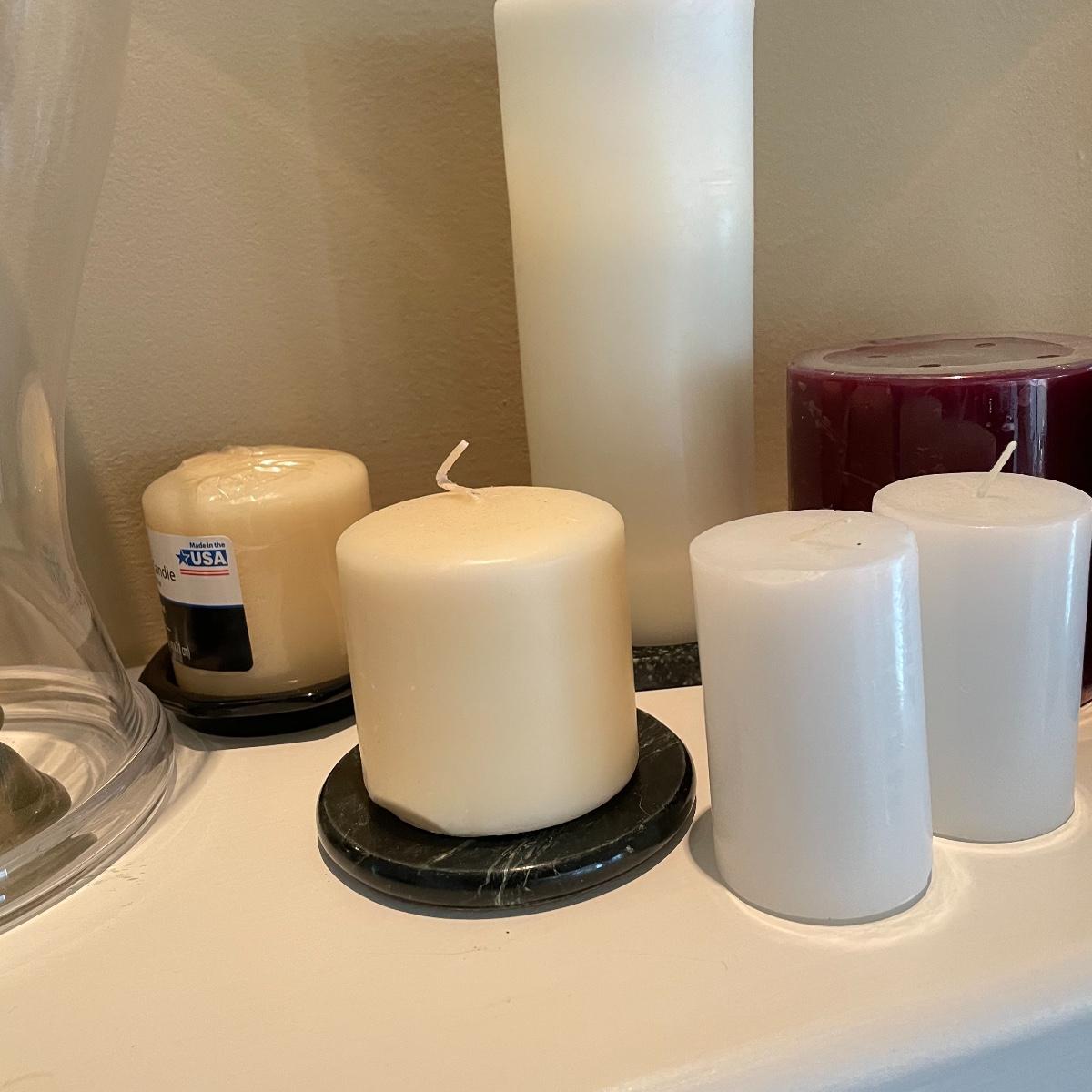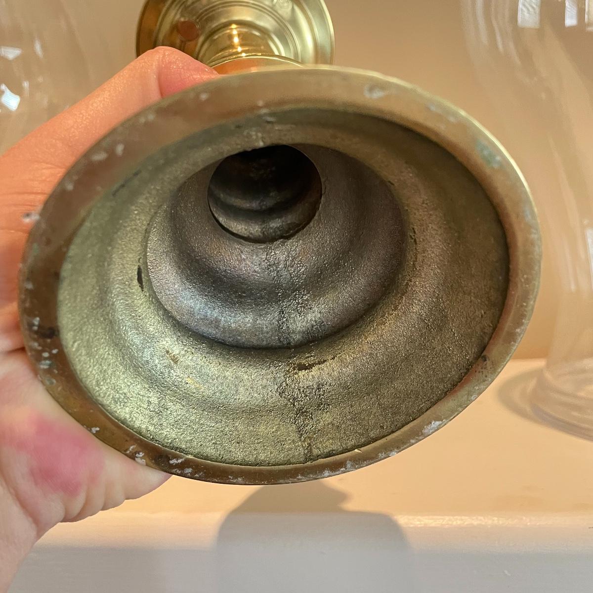 A set of two heavy, hollow brass candle holders standing 7.5” tall with matching glass Hurricane shades standing 18” tall. Lot also includes one 8” tall battery operated candle with seven wax candles and three coasters. One coaster is stoneware and the other two appear to be green marble. See images. Local pick up only.