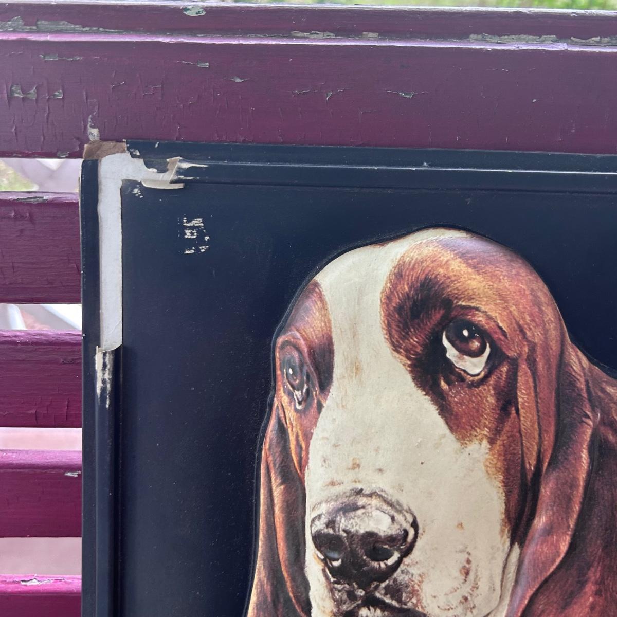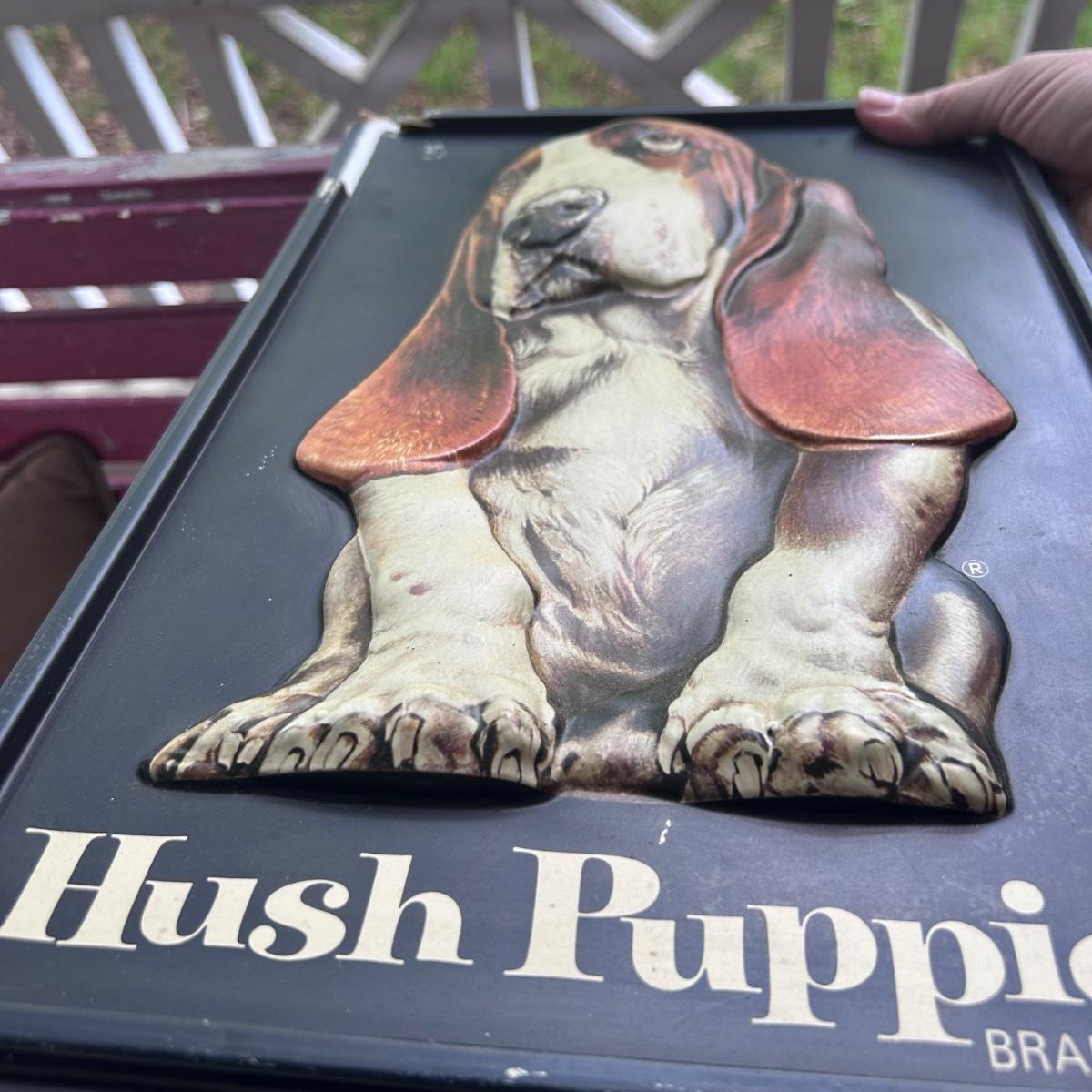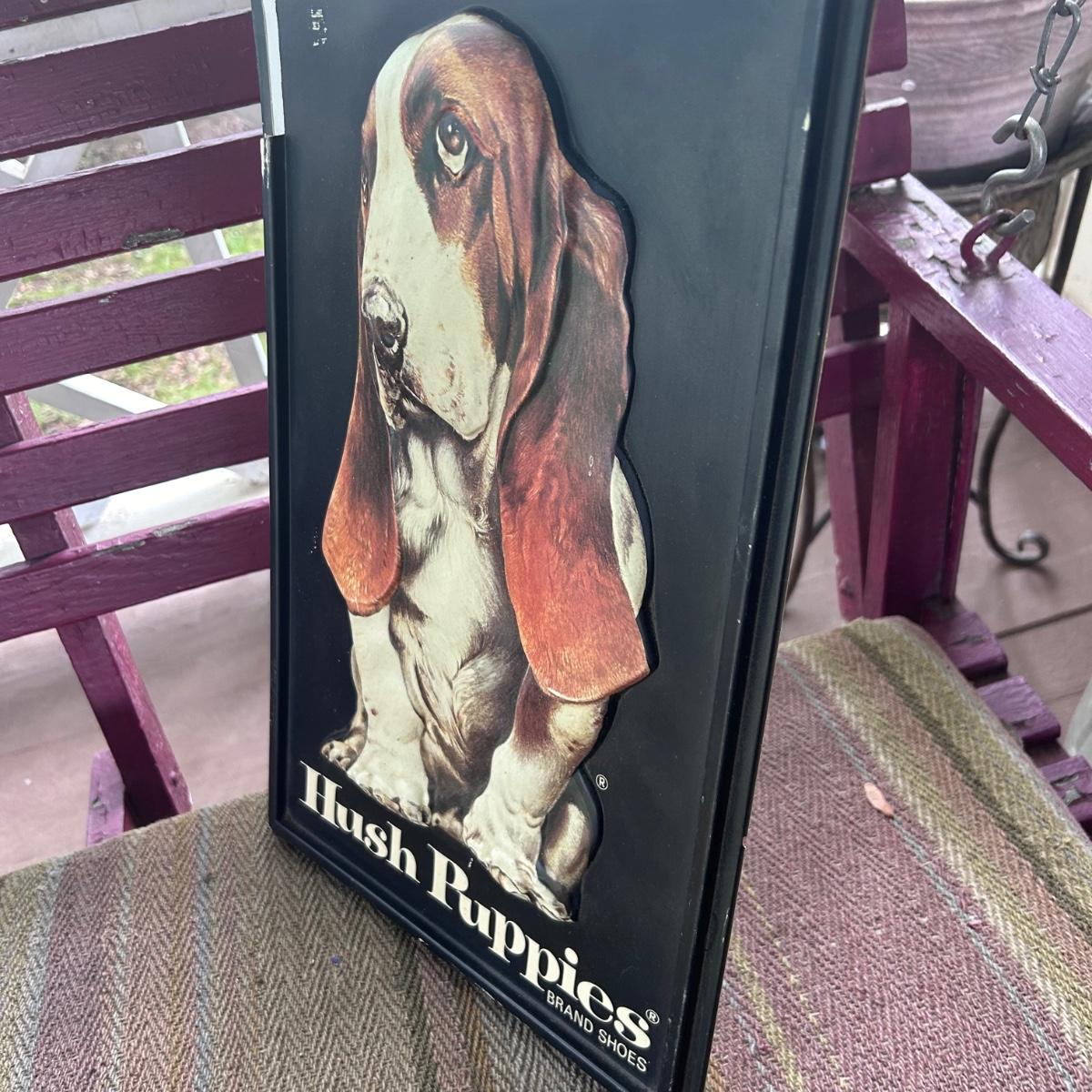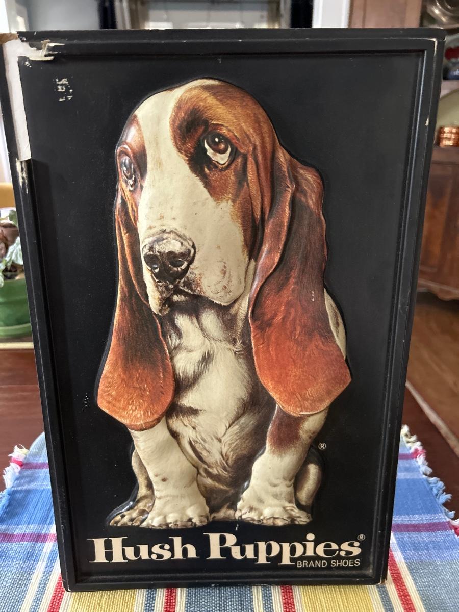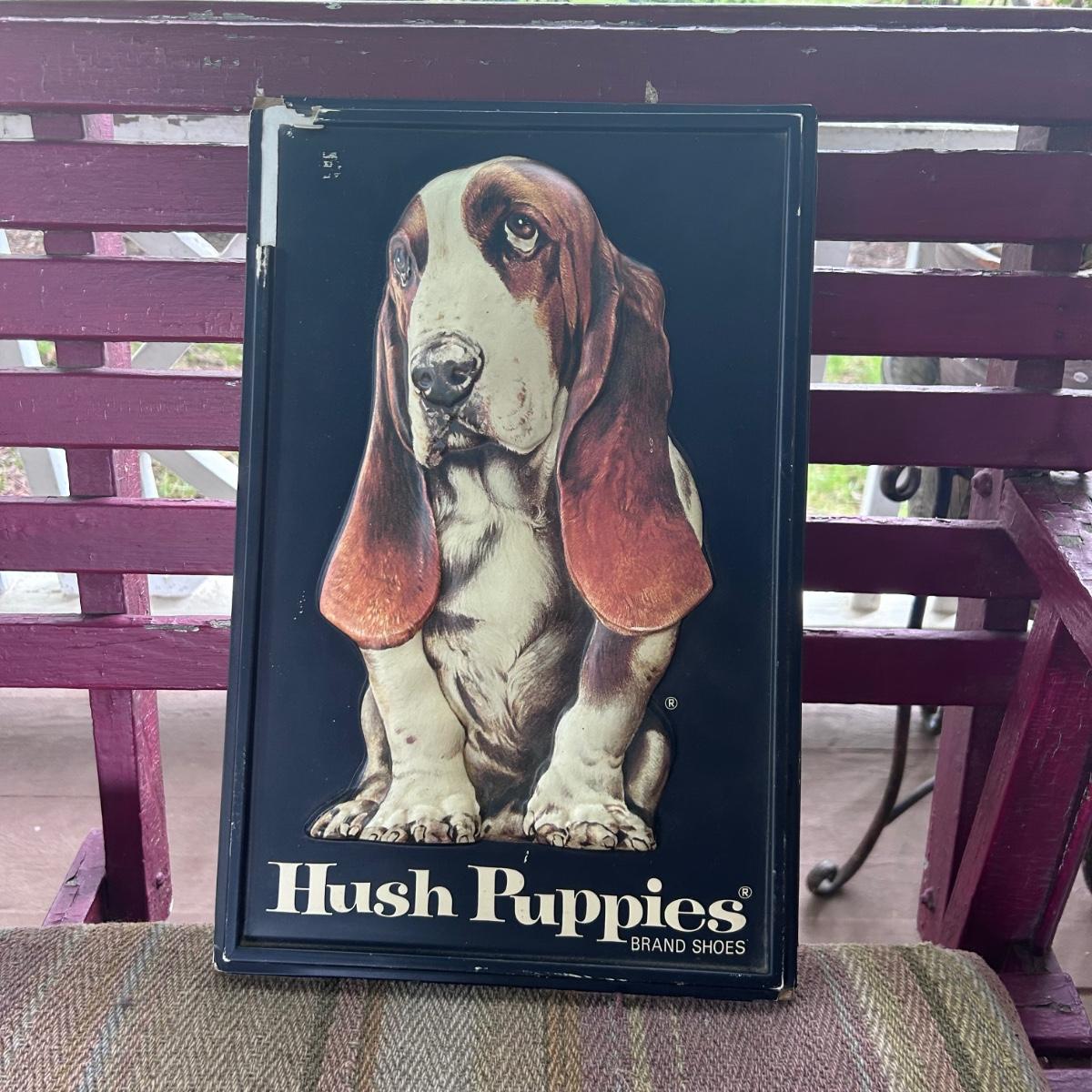Small, plastic, 3D sign for Hush Puppies Brand shoes from the 60’s. Top left corner is broken off and a few scuffs, but the image is good. Piece measures 10.5” x 16”H with 5” depth when stand is opened. Shipping available.