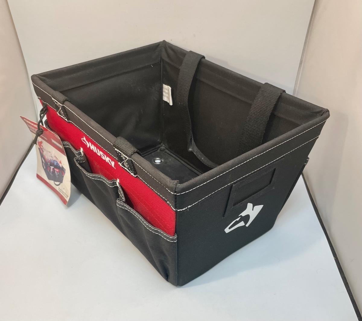 Heavy duty canvas 13” tool tote or storage bin. Ideal for carrying tools or cleaning supplies. Made by Husky.