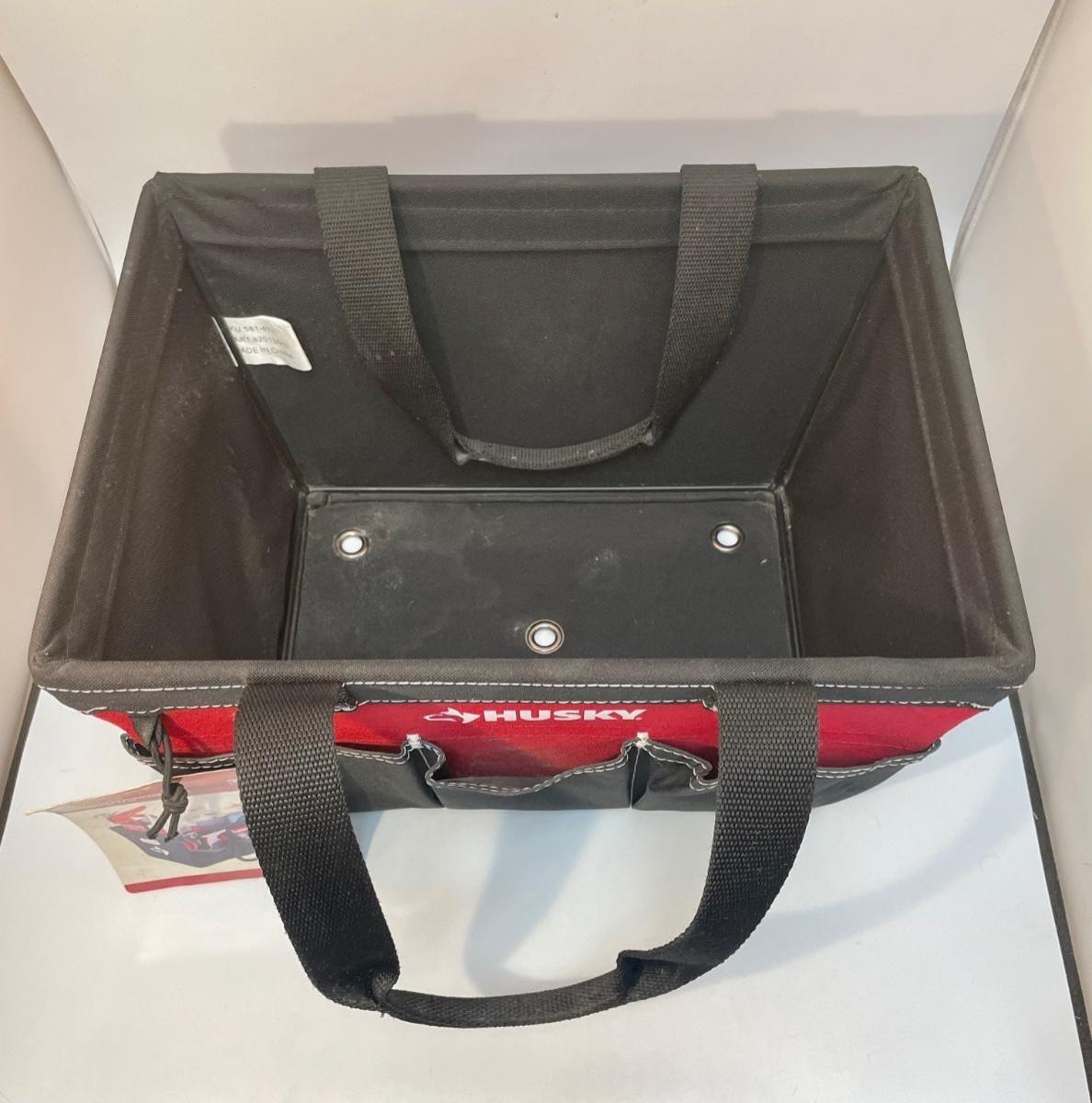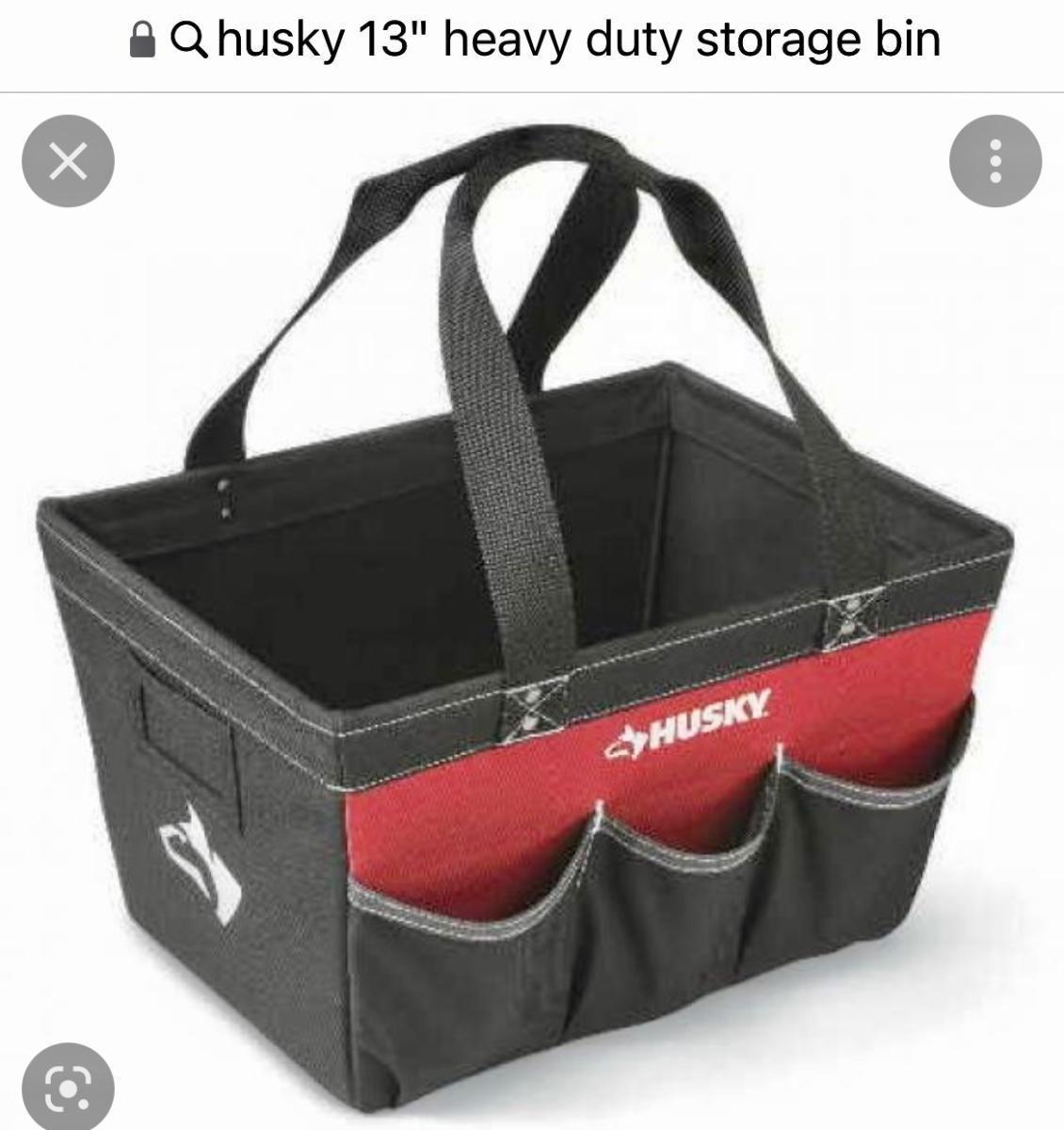 Heavy duty canvas 13” tool tote or storage bin. Ideal for carrying tools or cleaning supplies. Made by Husky.