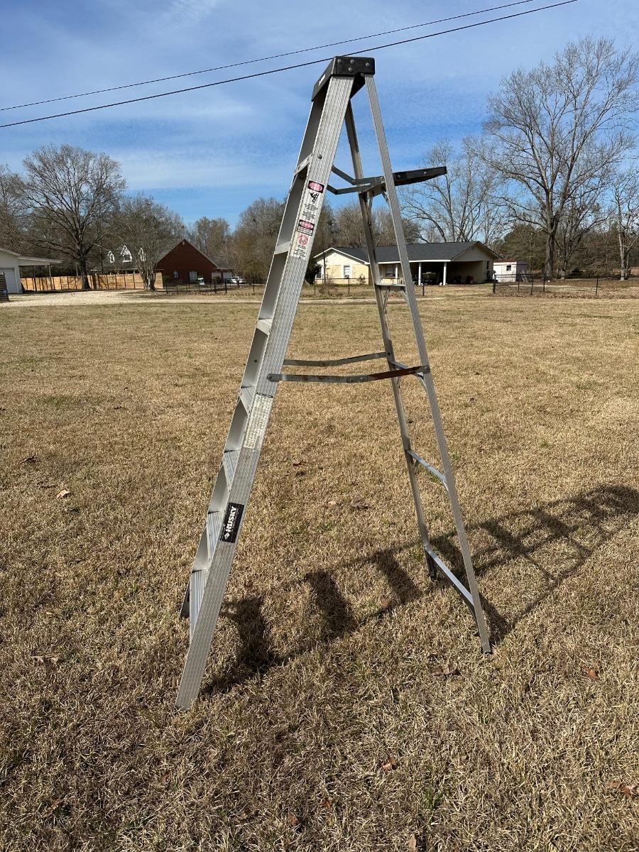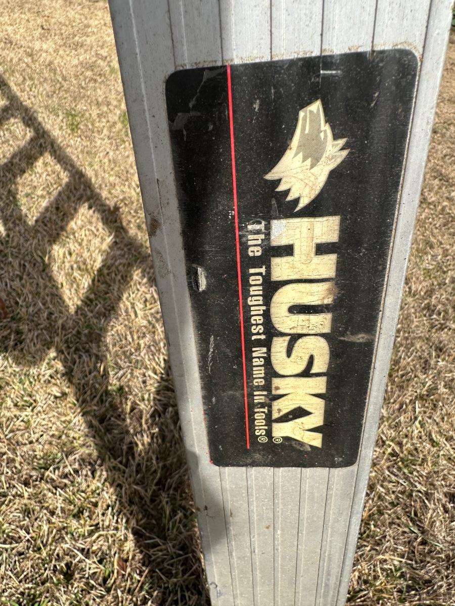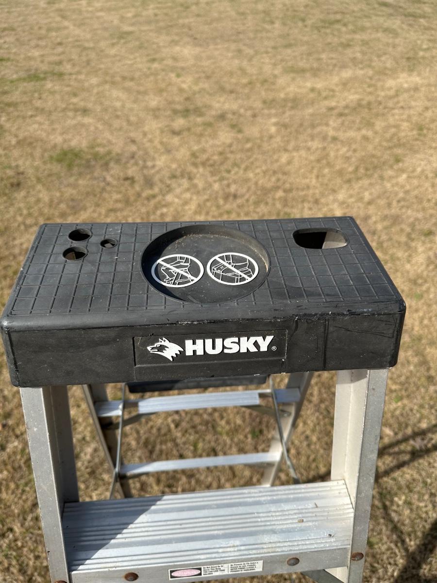 Sturdy Husky aluminum step ladder, ideal for home, shop, or light contractor use. Clean, solid example with working spreaders and integrated top tool tray.