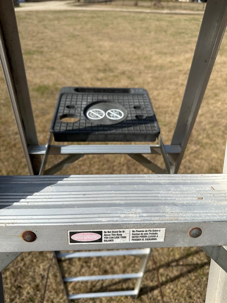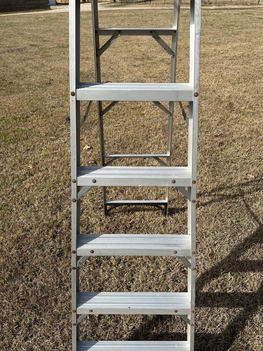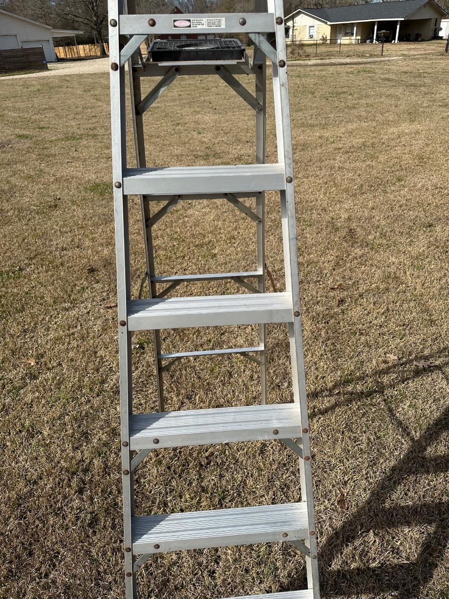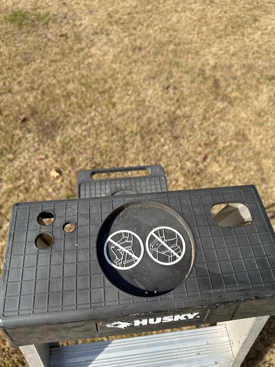 Sturdy Husky aluminum step ladder, ideal for home, shop, or light contractor use. Clean, solid example with working spreaders and integrated top tool tray.