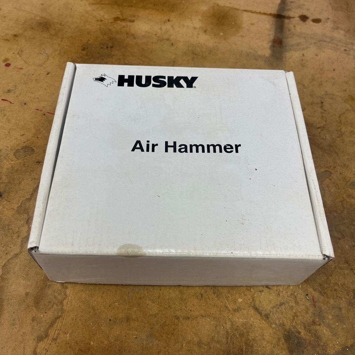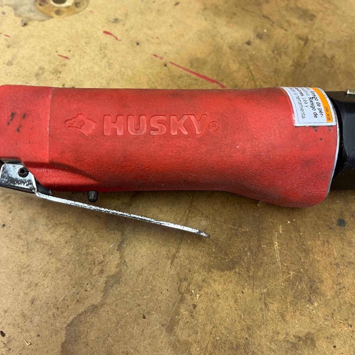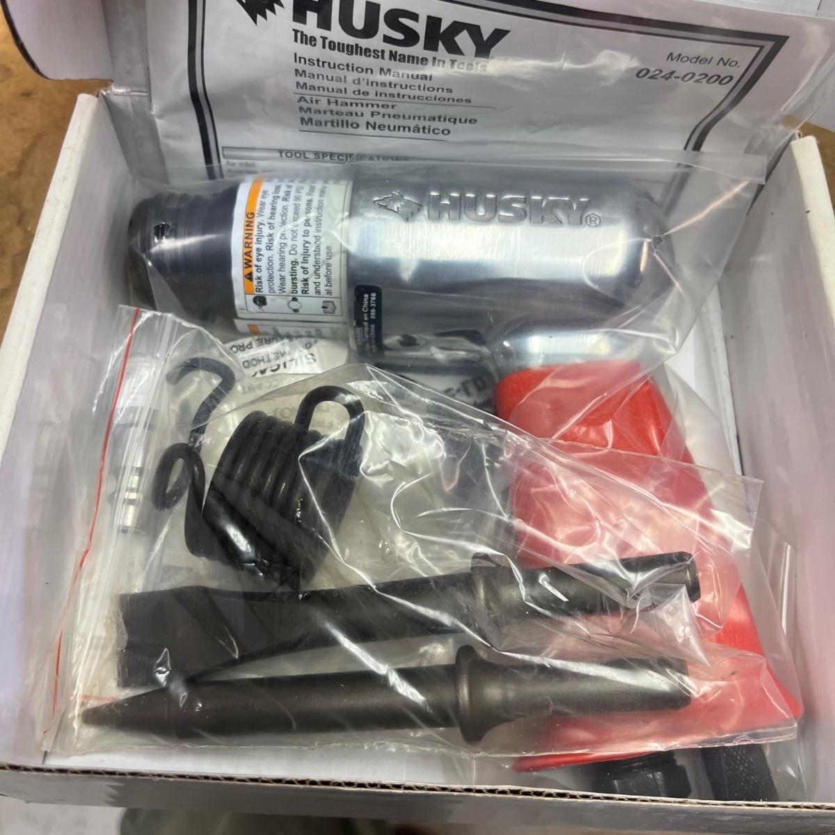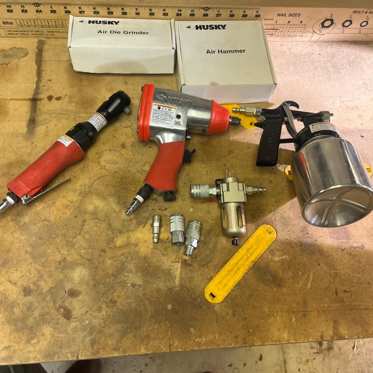 Lot contains five Husky air tools that includes 1/2” impact, 3/8” drive ratchet, paint sprayer and a NIB die grinder and air hammer. Also includes a filter and a few fittings.