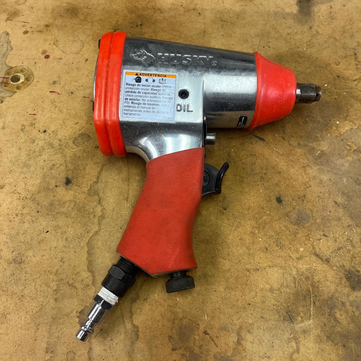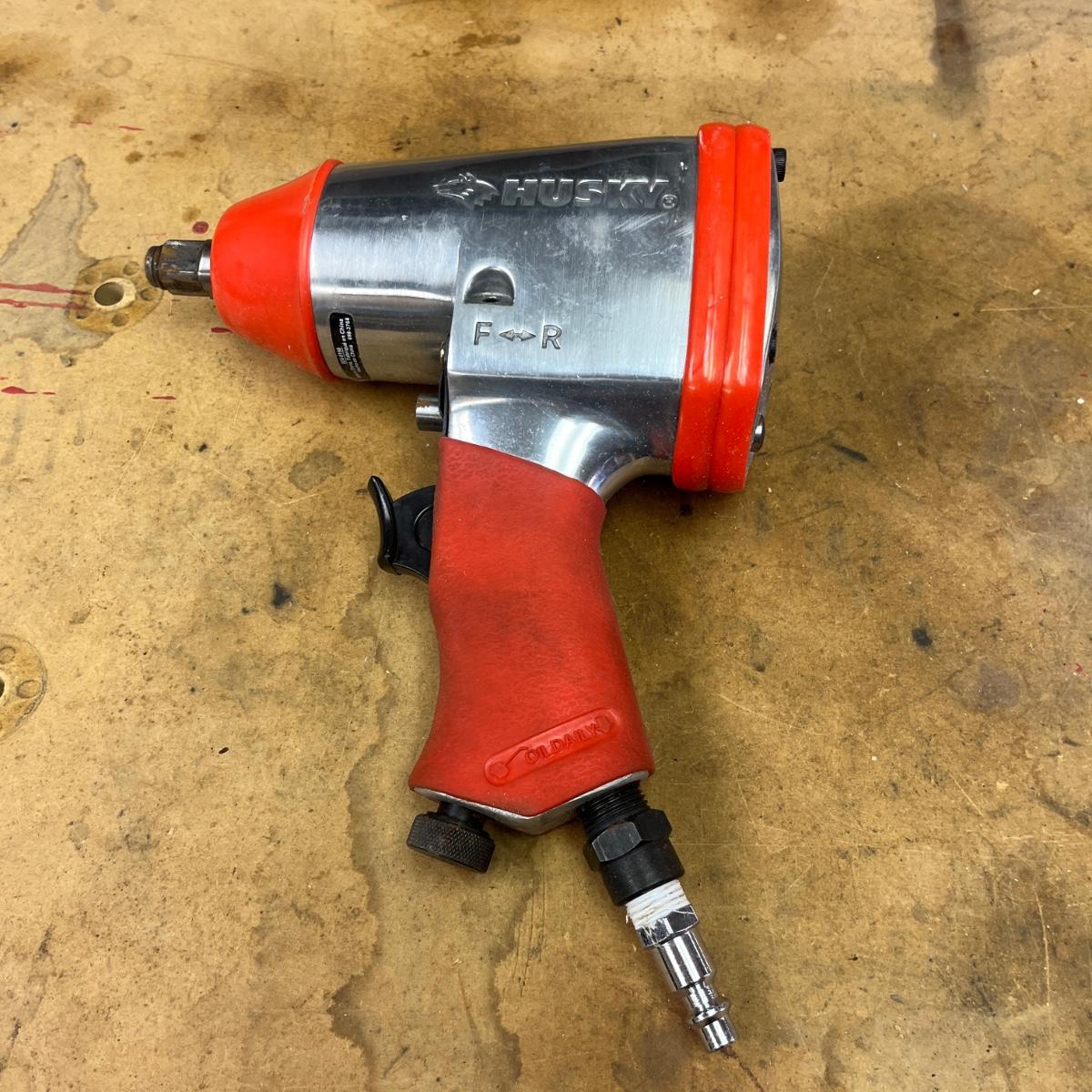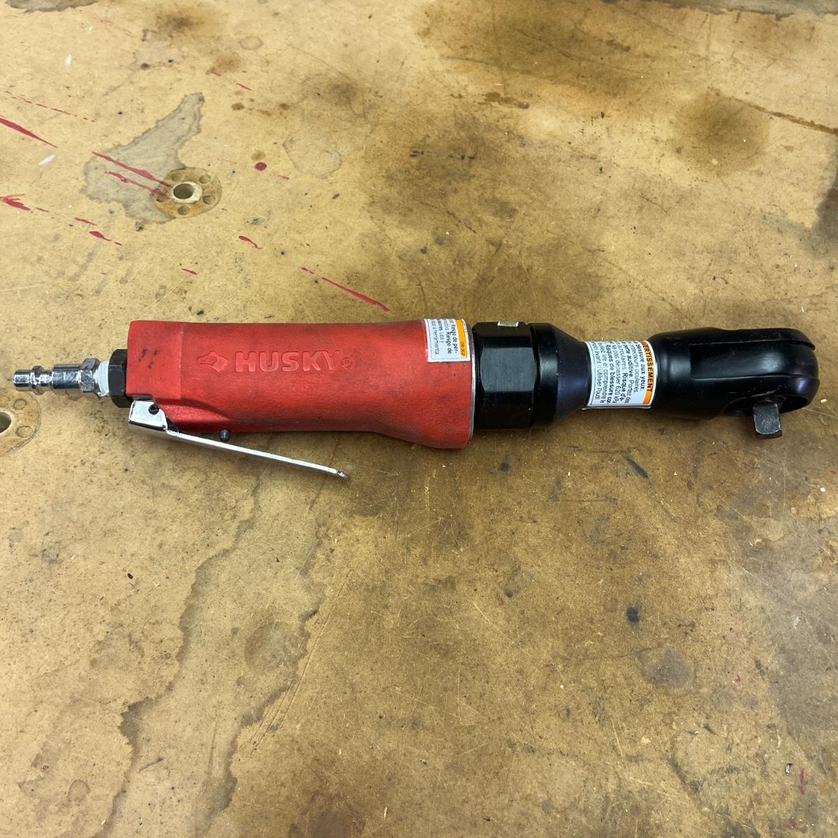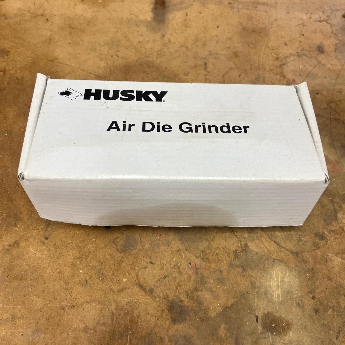 Lot contains five Husky air tools that includes 1/2” impact, 3/8” drive ratchet, paint sprayer and a NIB die grinder and air hammer. Also includes a filter and a few fittings.