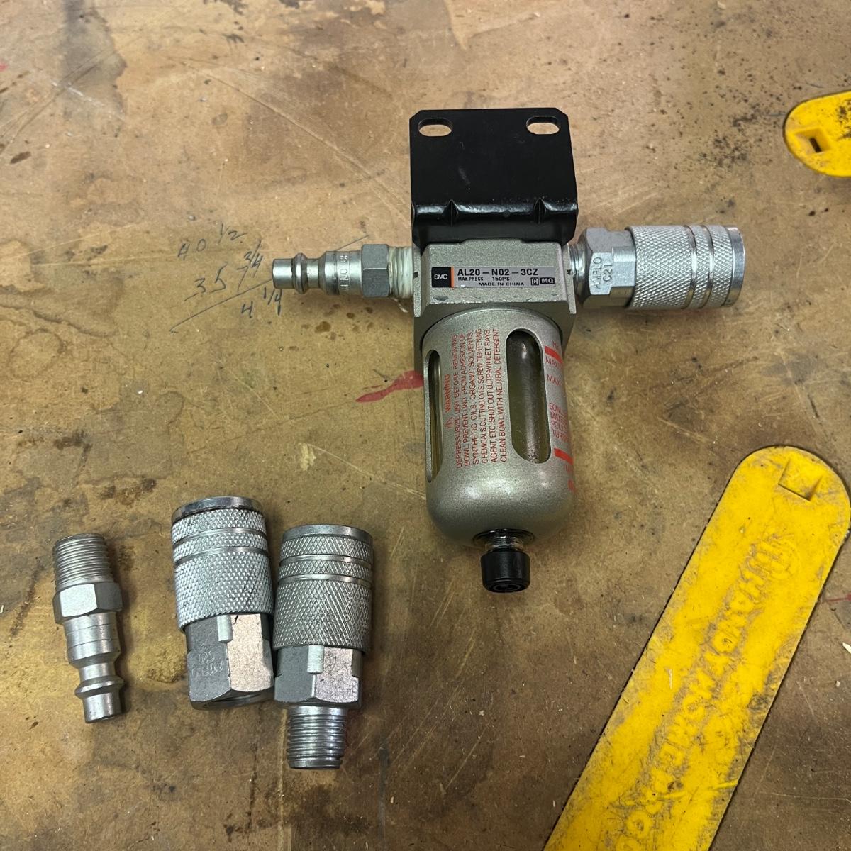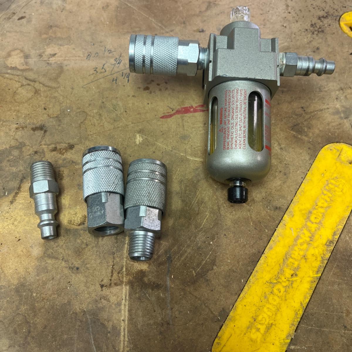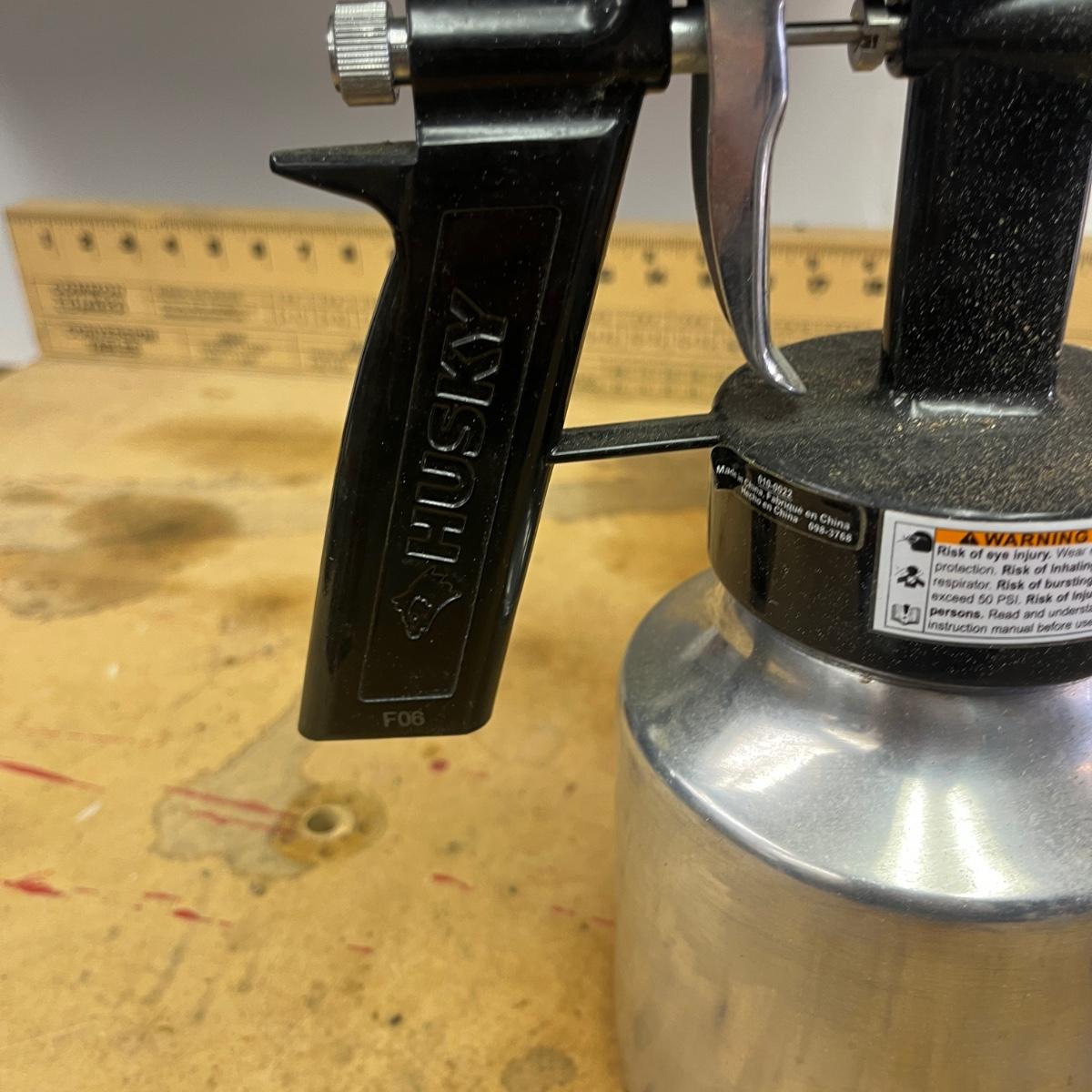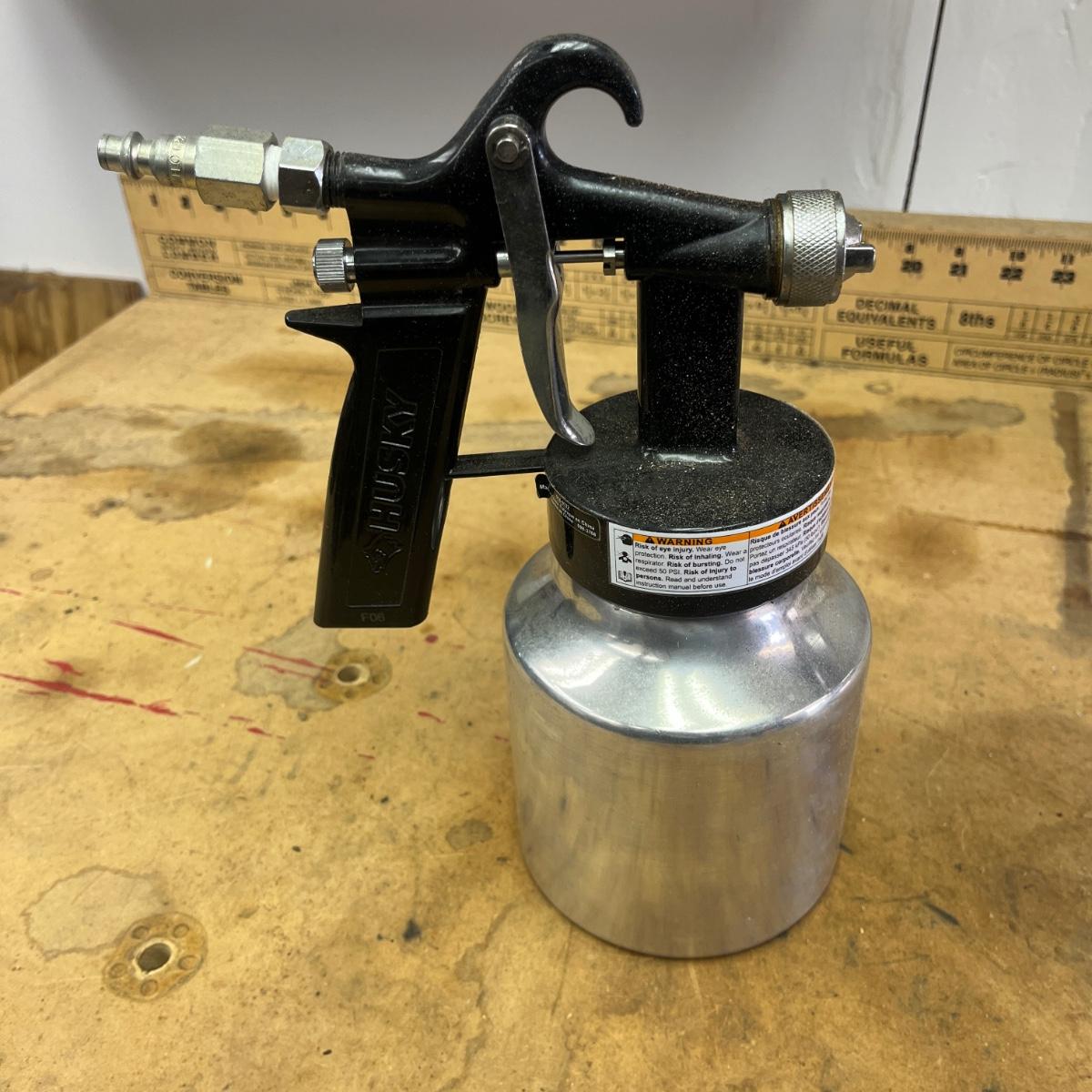 Lot contains five Husky air tools that includes 1/2” impact, 3/8” drive ratchet, paint sprayer and a NIB die grinder and air hammer. Also includes a filter and a few fittings.