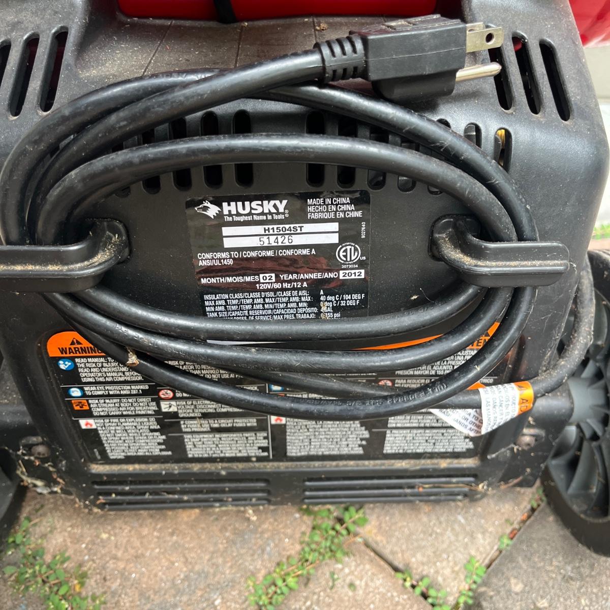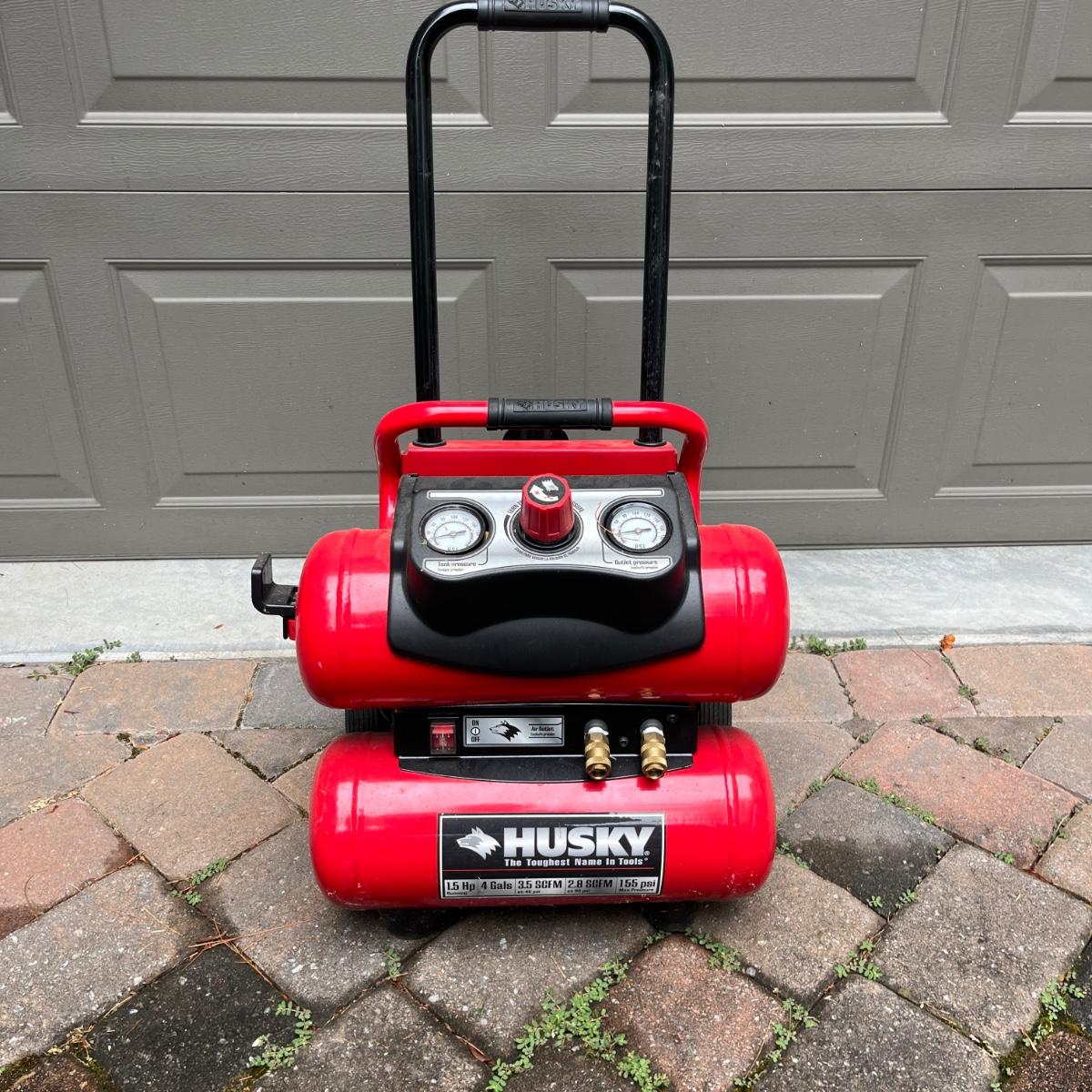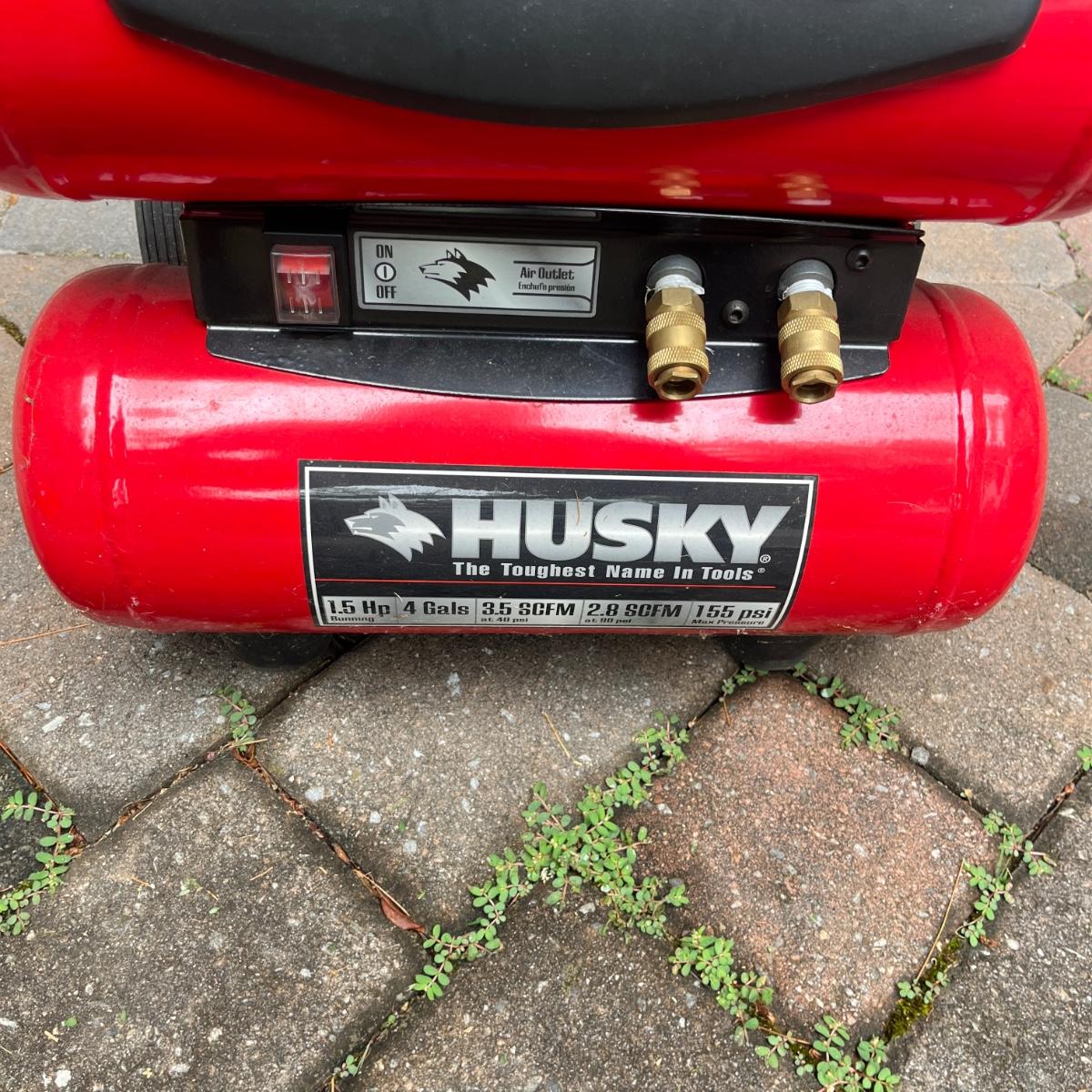 Lot includes a Husky four gallon compressor on wheels with 1.5 HP motor. Compressor powered on when plugged in. Compressor measures 18” x 15” x 29”H