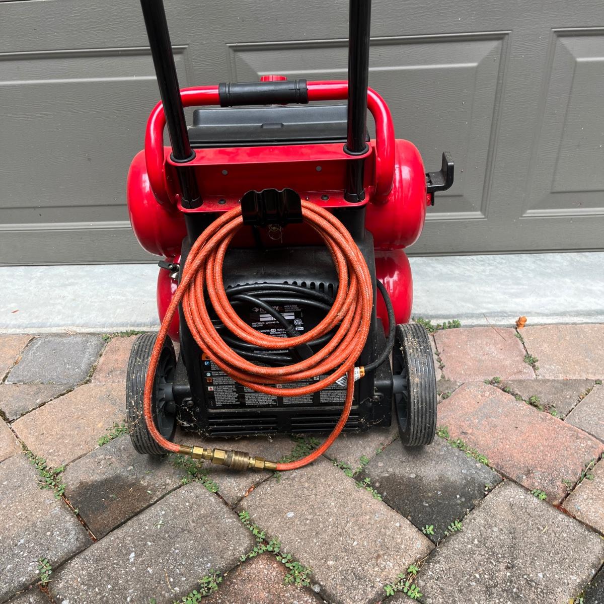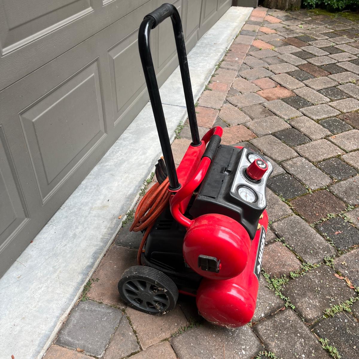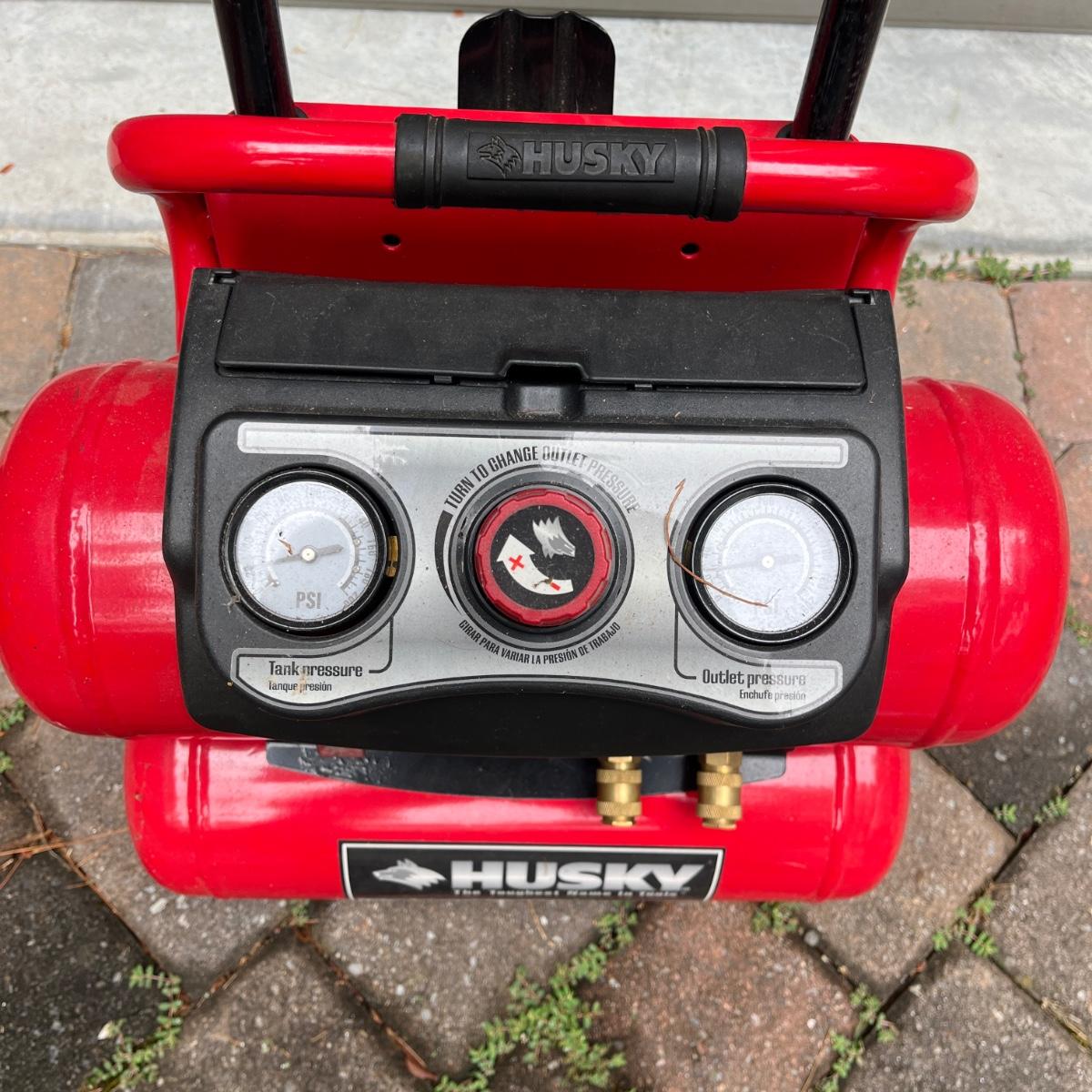 Lot includes a Husky four gallon compressor on wheels with 1.5 HP motor. Compressor powered on when plugged in. Compressor measures 18” x 15” x 29”H