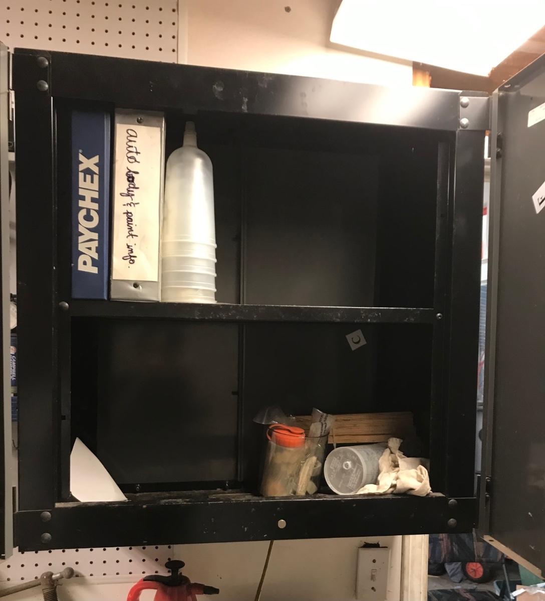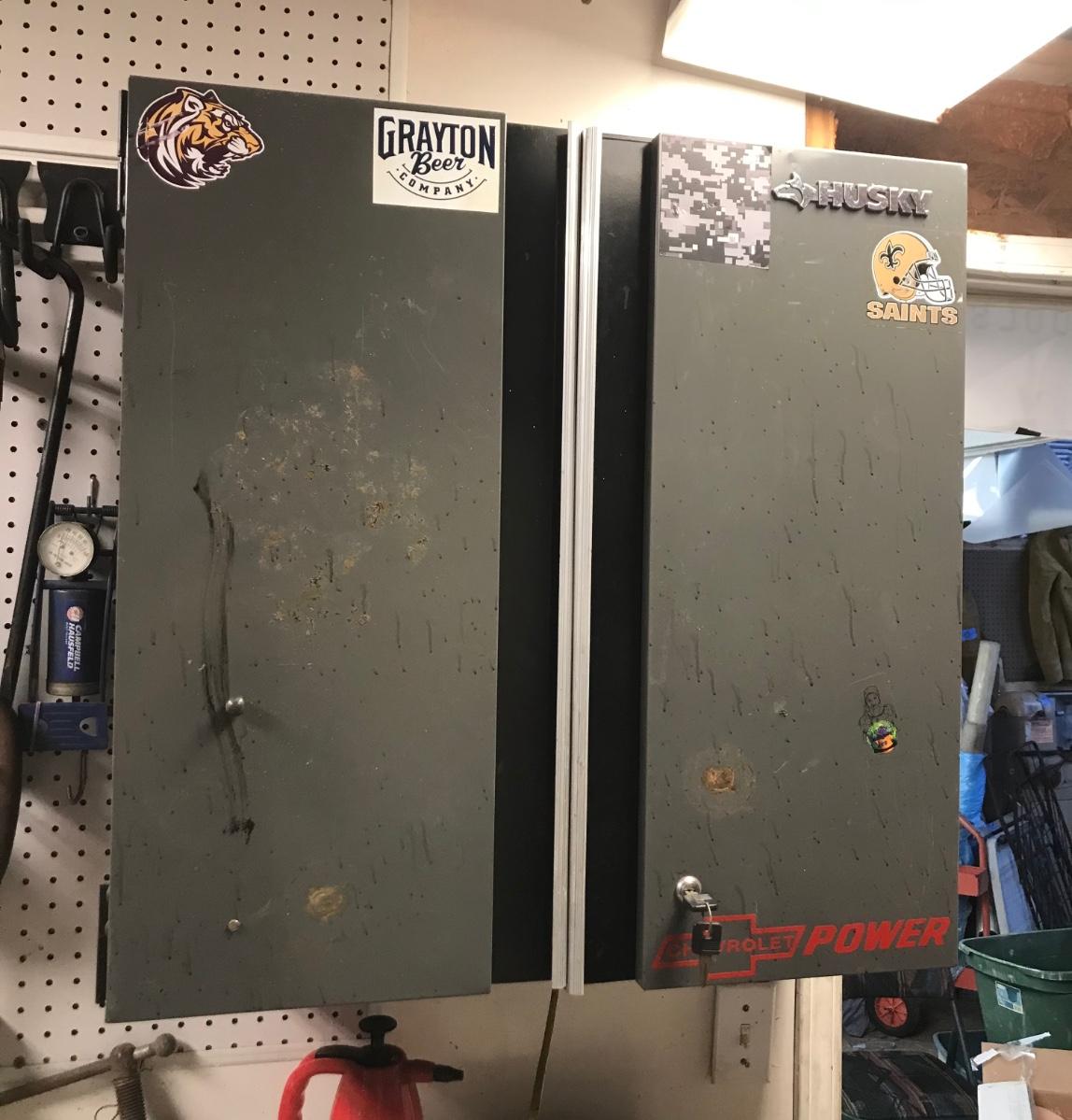 Husky metal garage wall cabinet “C”: 28” x 29”. Has some rust. MUST REMOVE FROM THE WALL