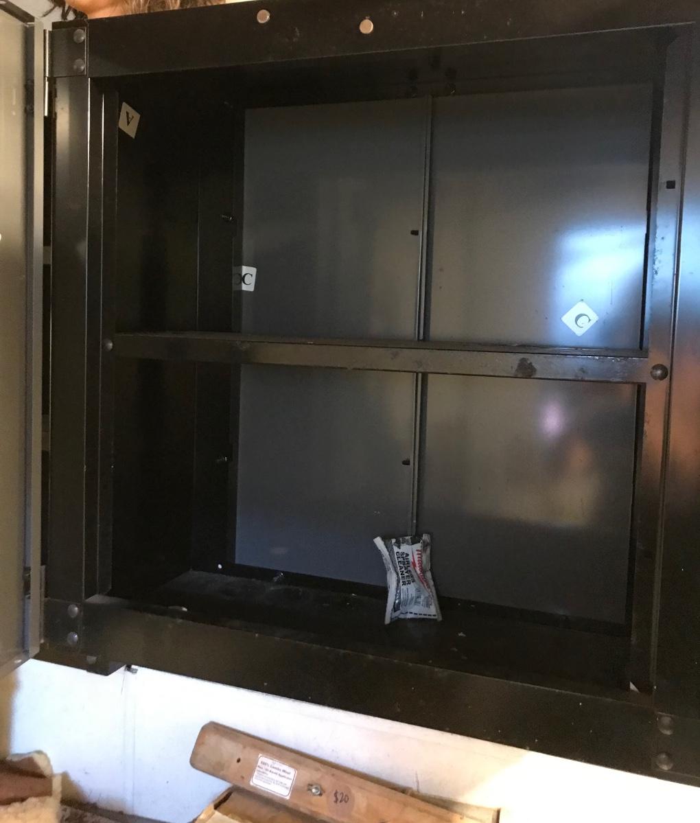 Husky metal garage wall cabinet “B”: 28” x 28”. MUST REMOVE FROM THE WALL