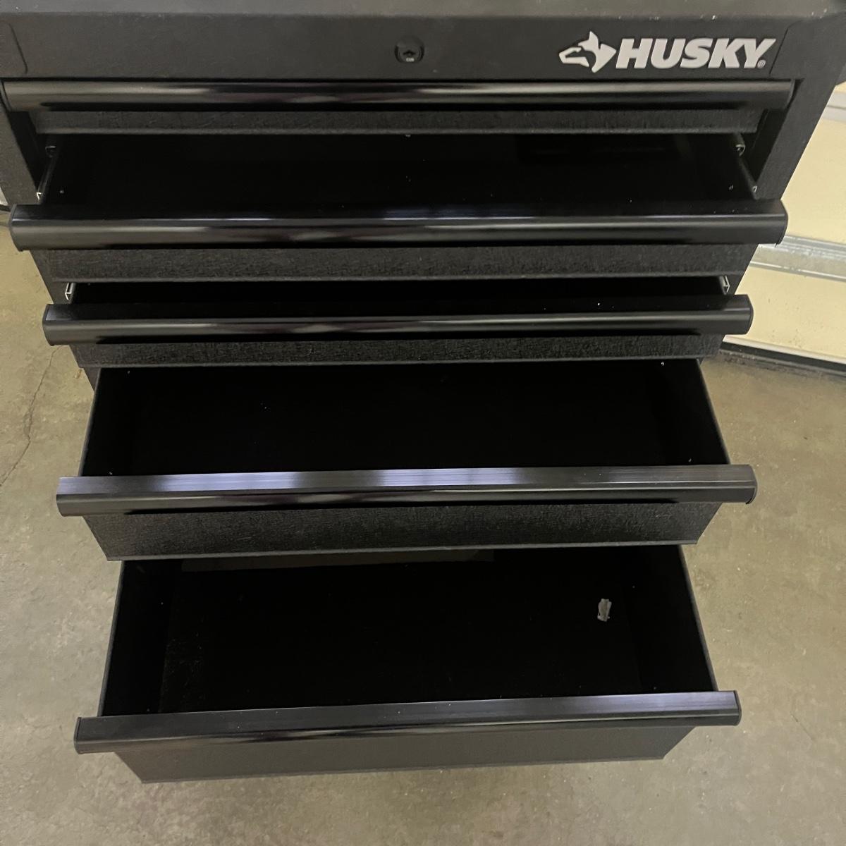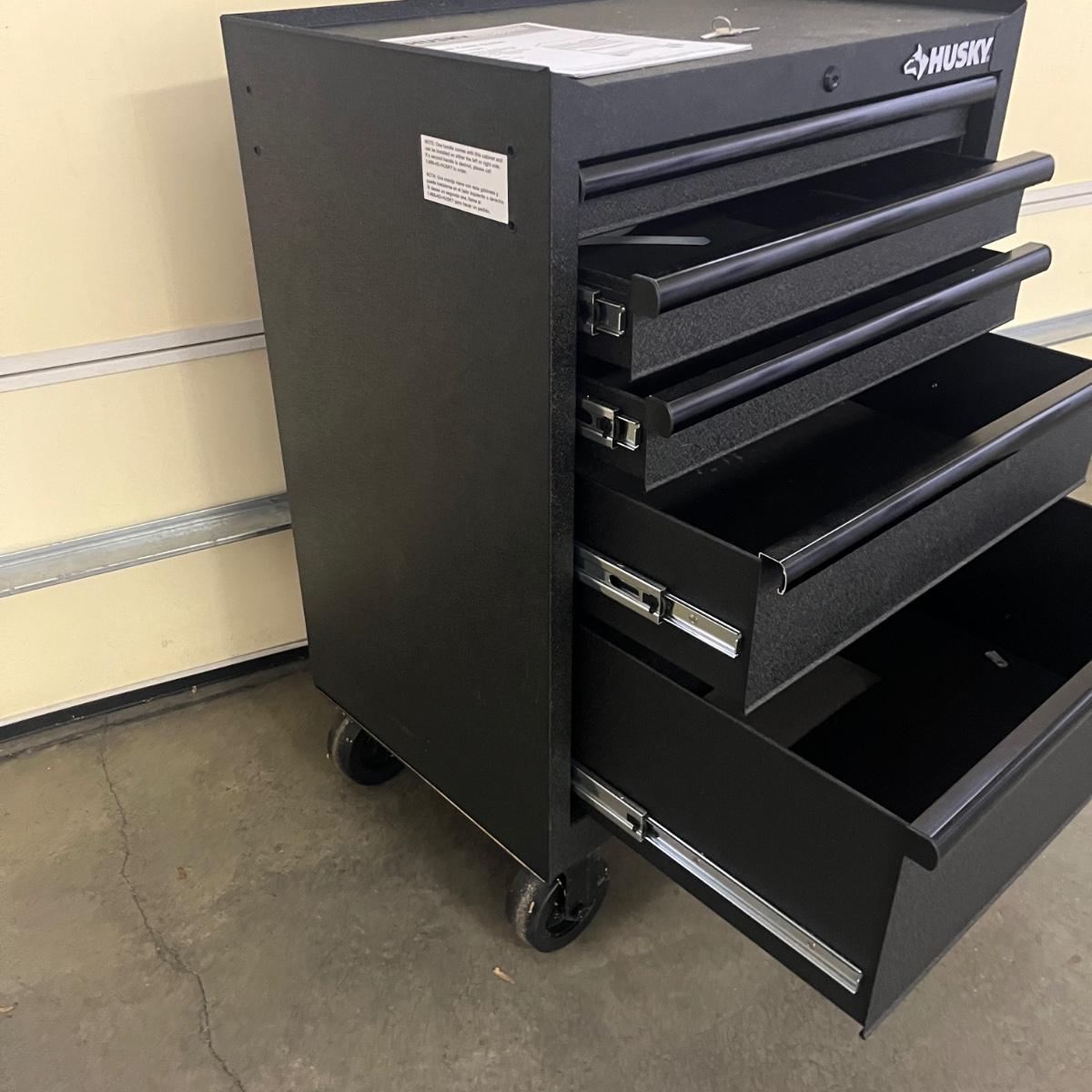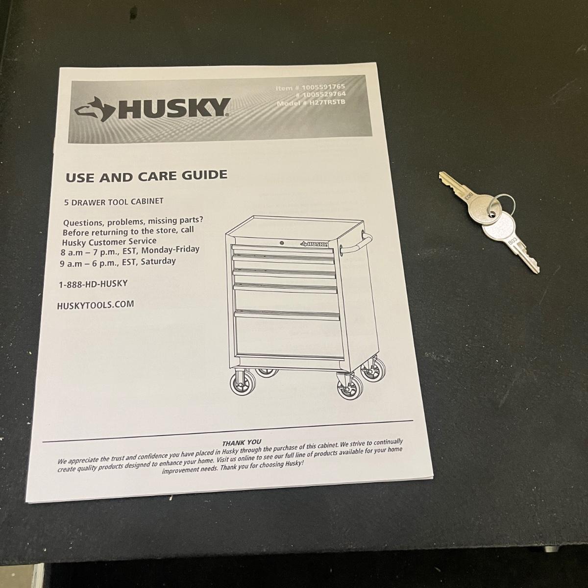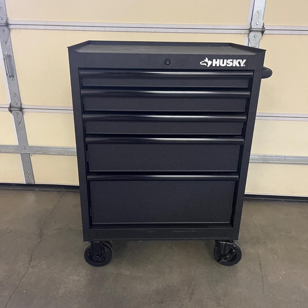 This metal Husky rolling toolbox has five locking drawers and includes two keys. Box measures 18” x 30” x 37”H.