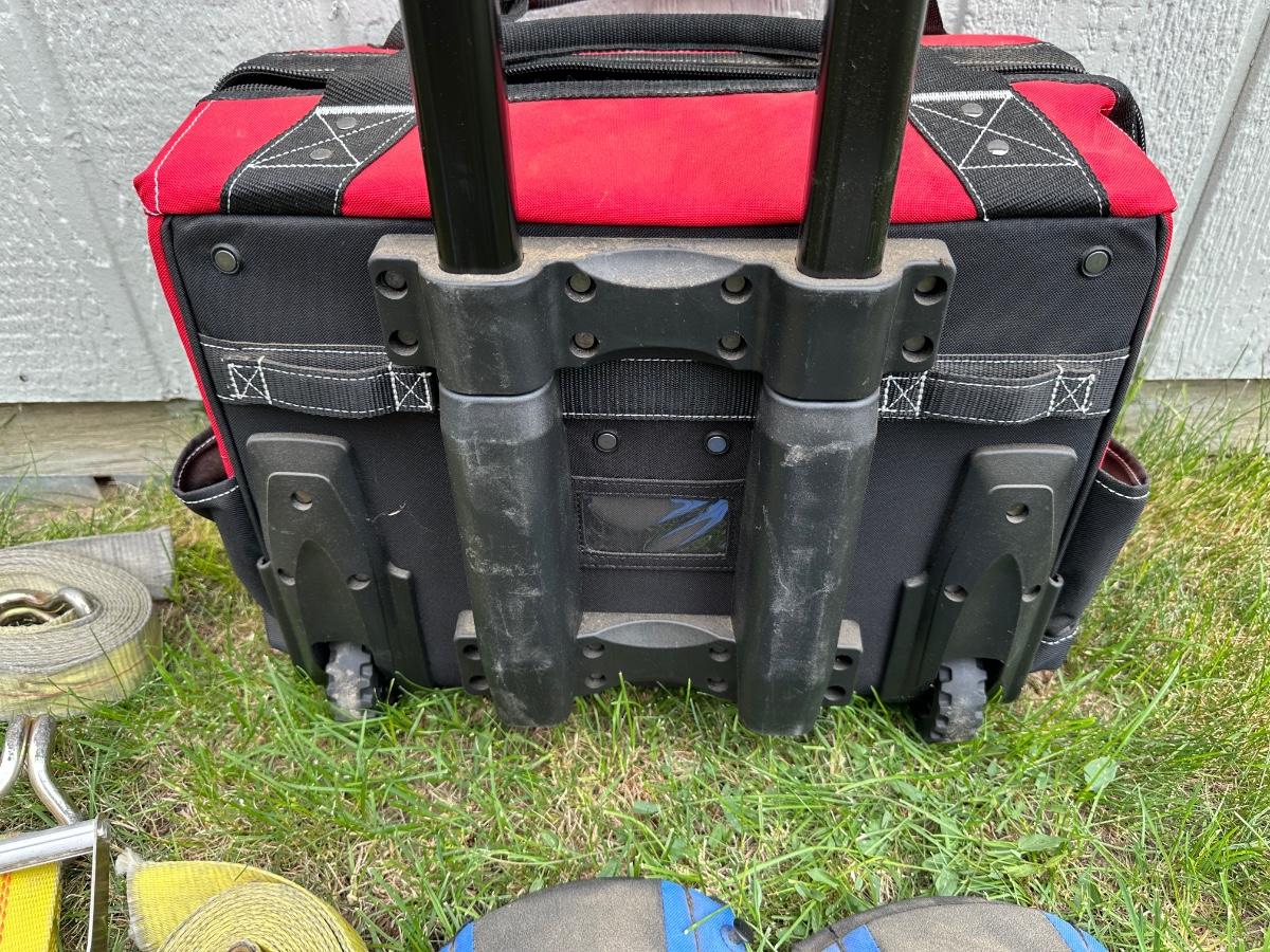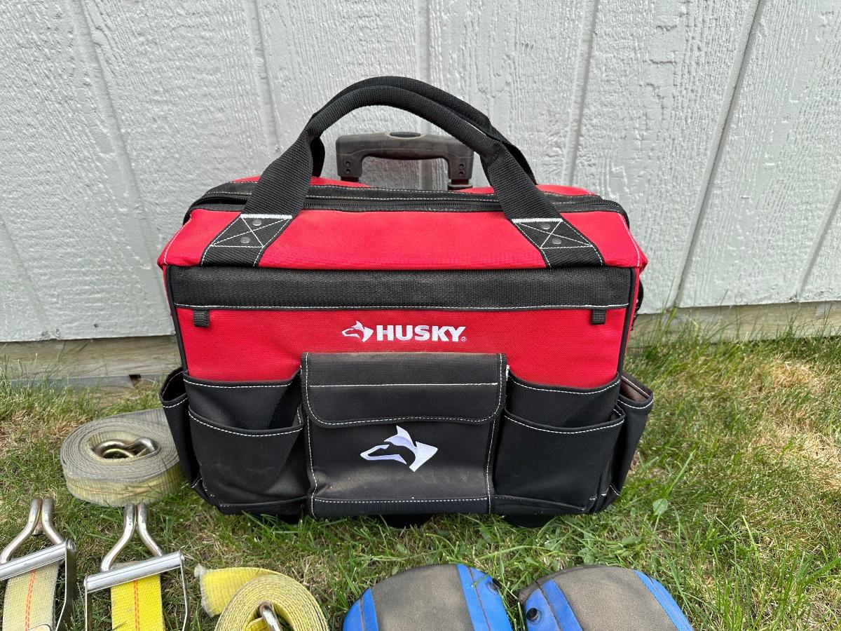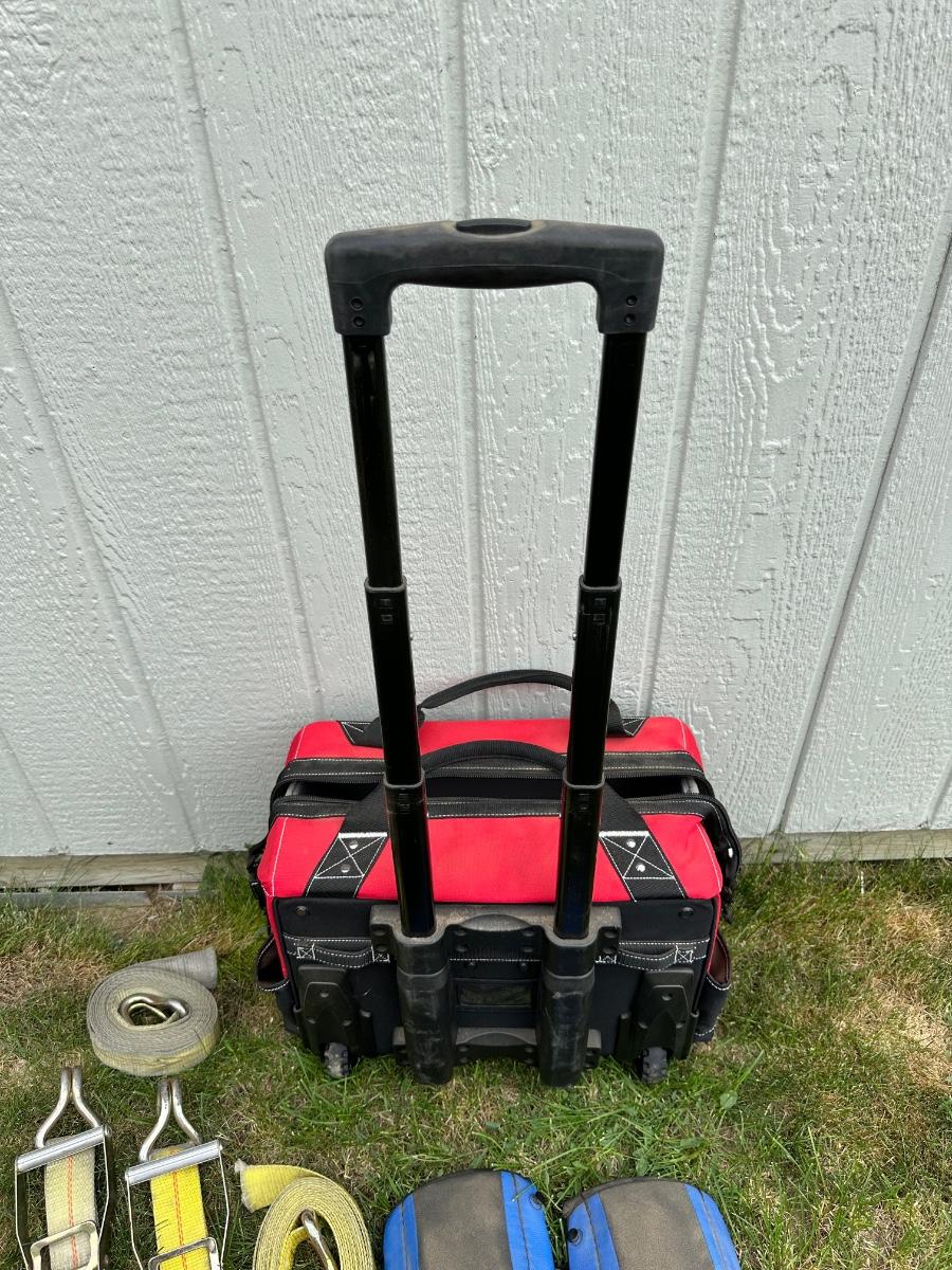 HUSKY TOOL BAG ON WHEELS W/HANDLE, RATCHET STRAPS AND KNEE PADS
