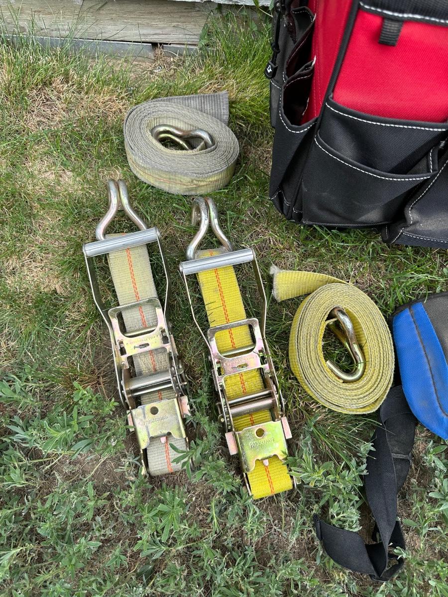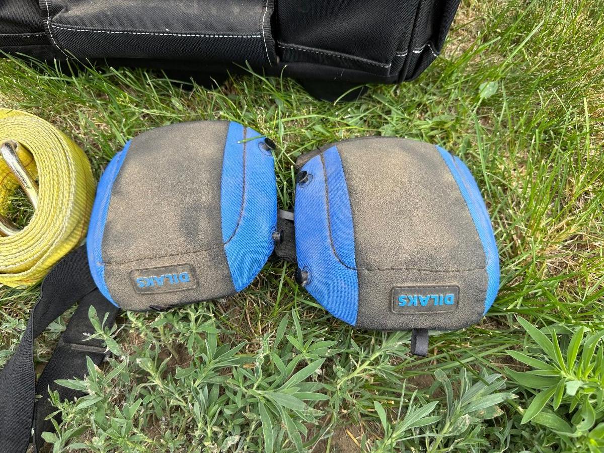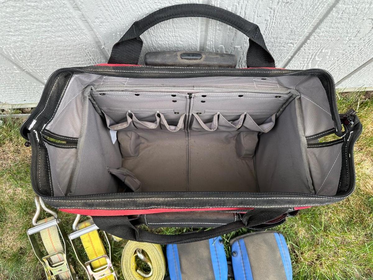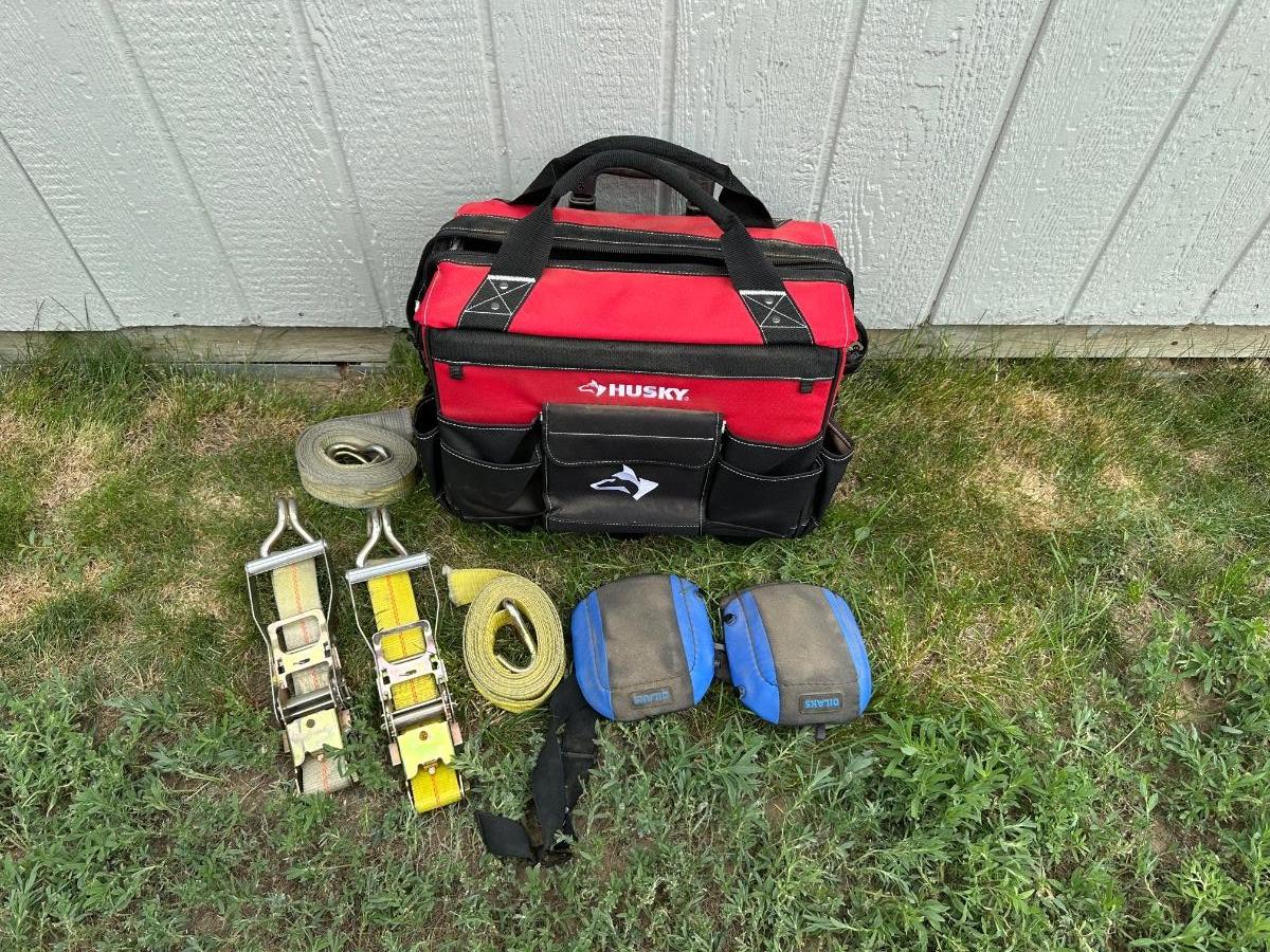 HUSKY TOOL BAG ON WHEELS W/HANDLE, RATCHET STRAPS AND KNEE PADS