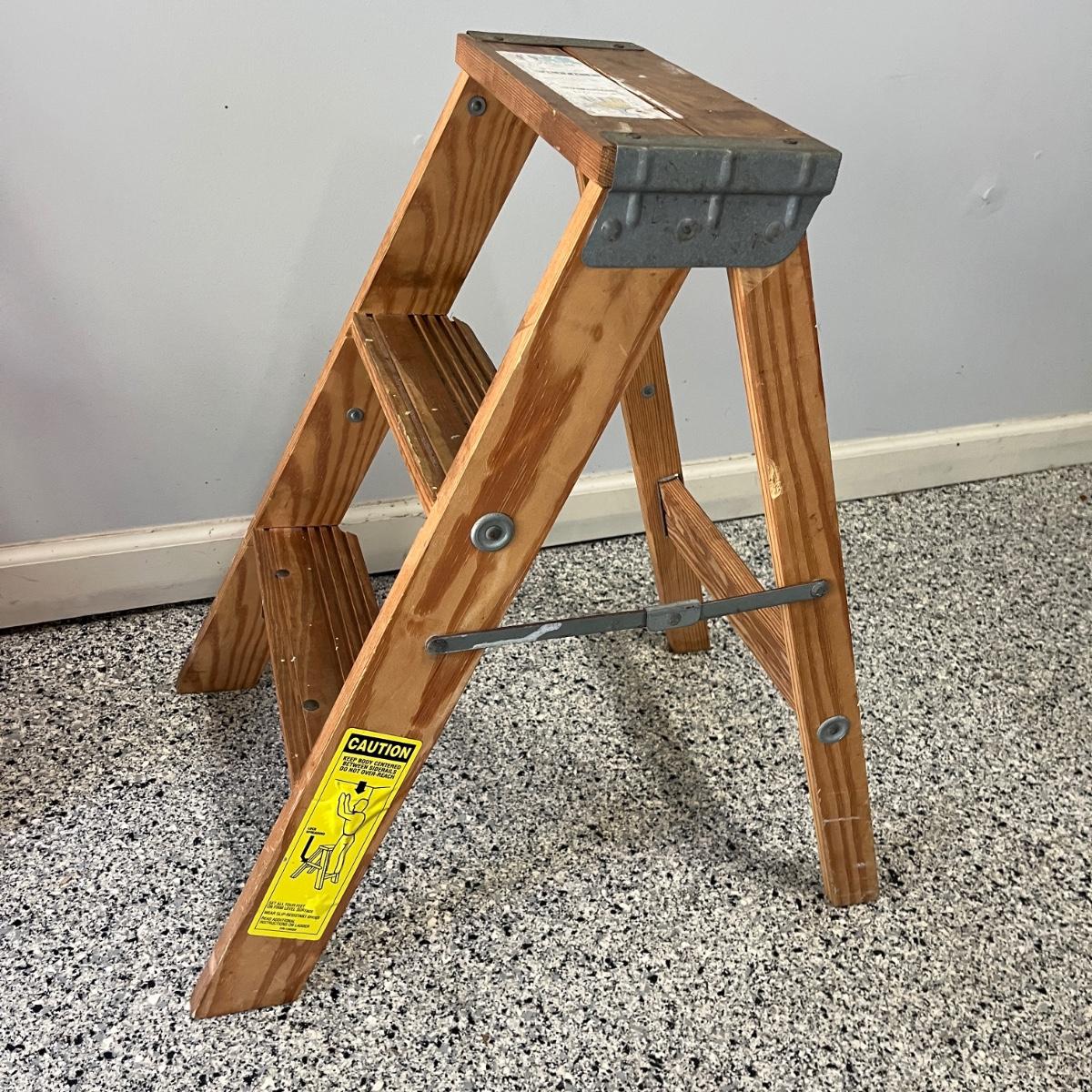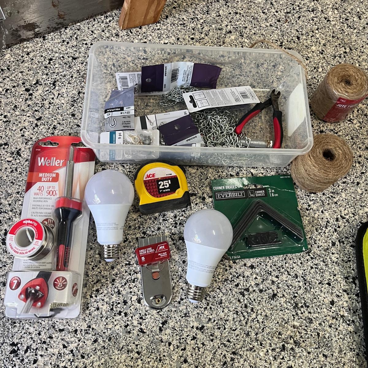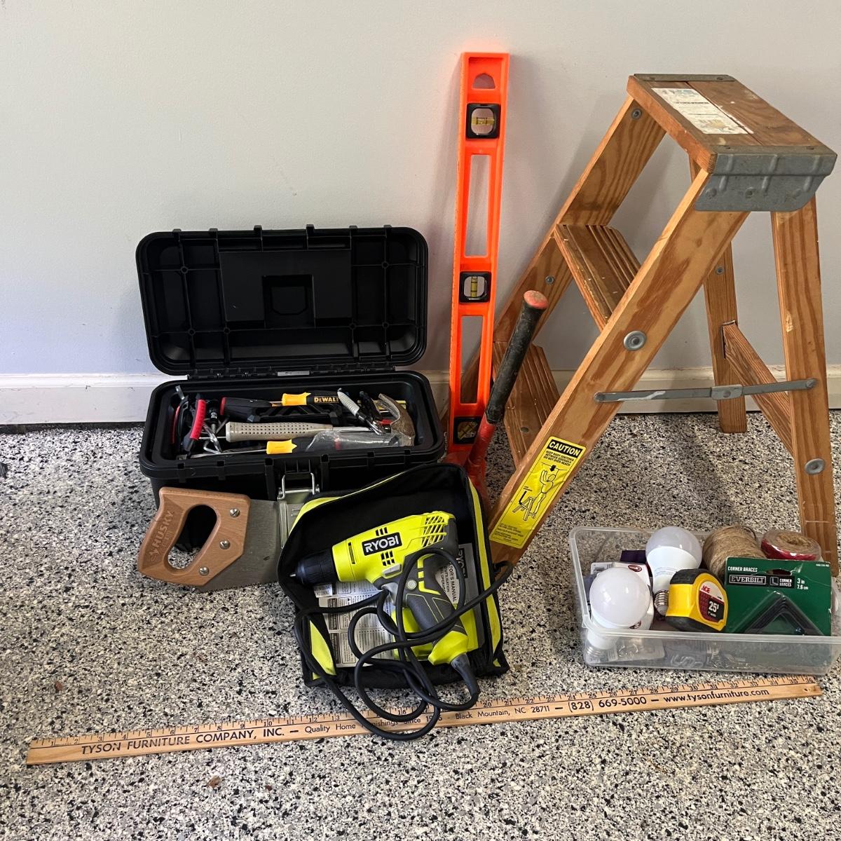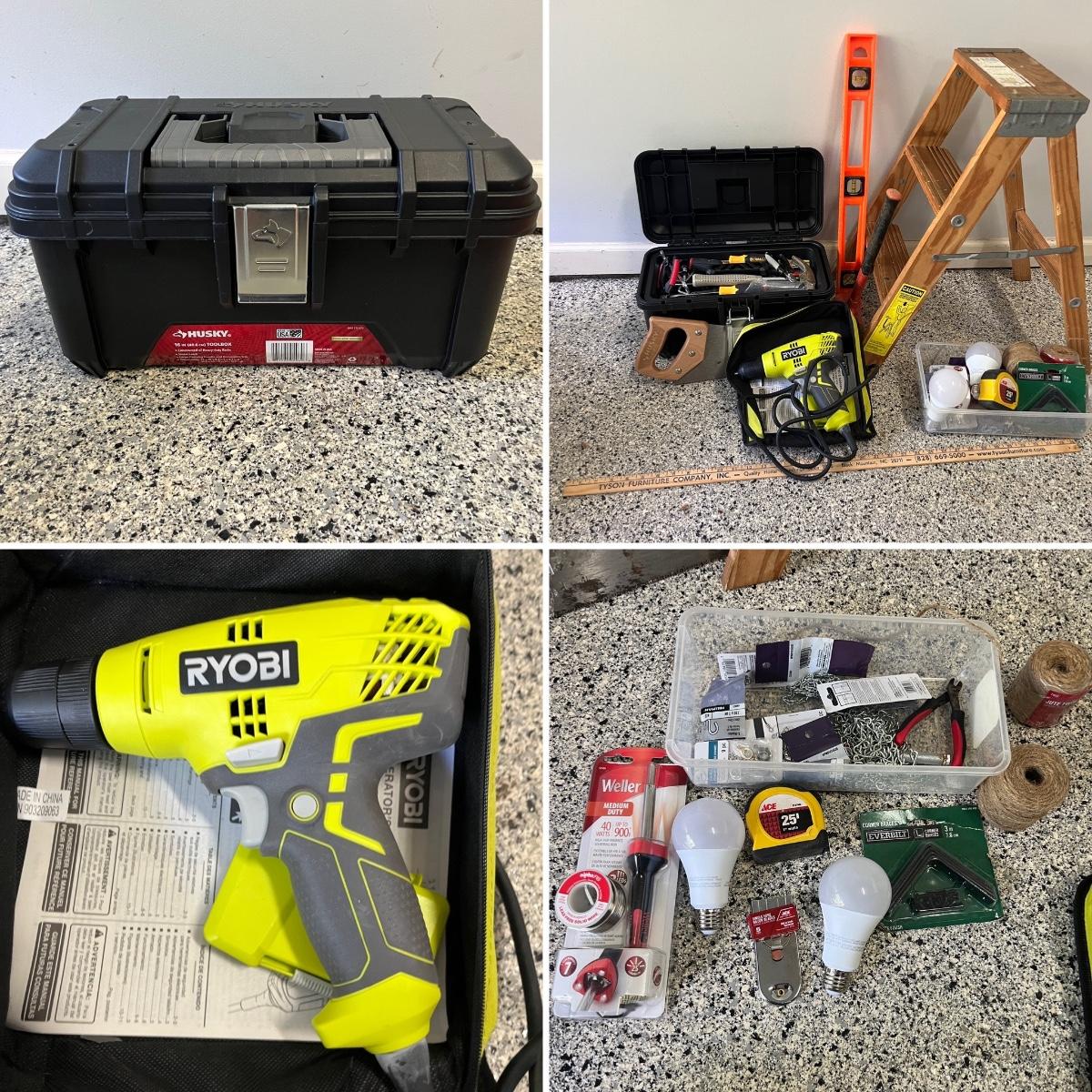 Lot contains a plastic Husky toolbox with contents that includes screwdrivers, pliers, hammers and assorted hardware. Also includes a Ryobi electric drill, wooden two step ladder, bulbs, twine NIB soldering iron and more. Toolbox measures 16” x 9” x 8.5”H. Drill powered on when trigger pulled.