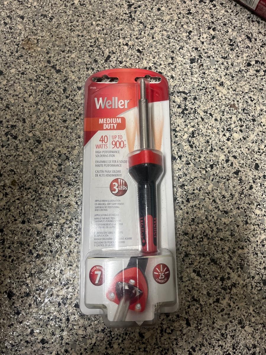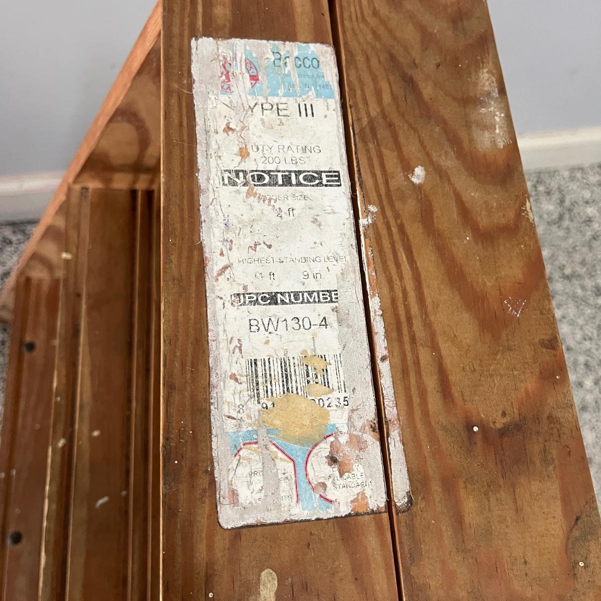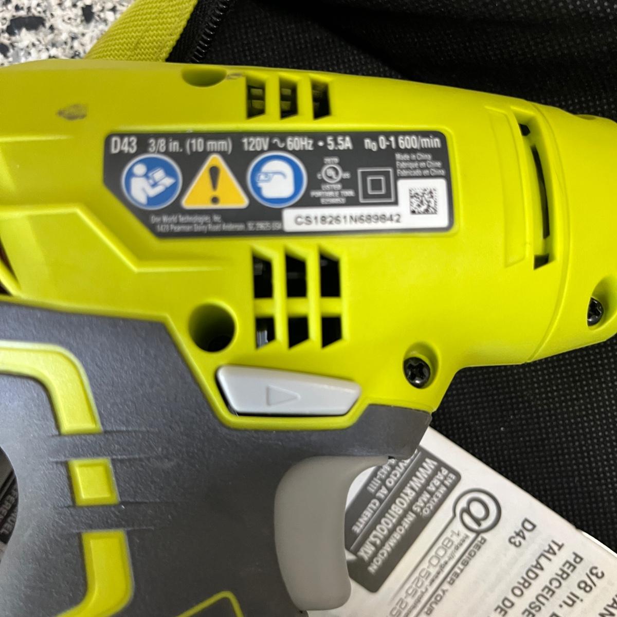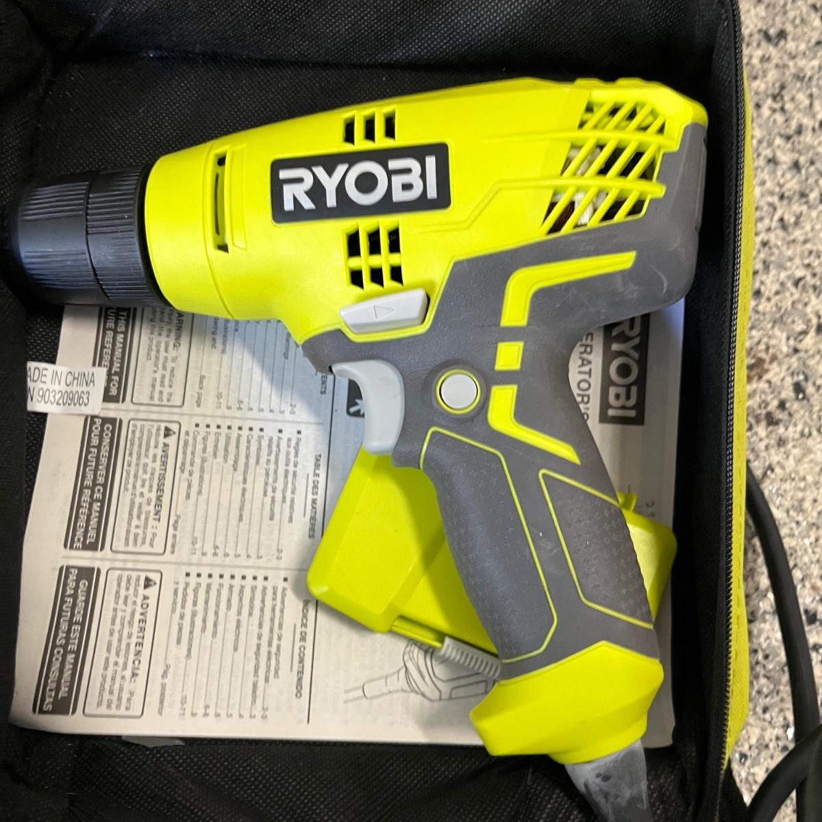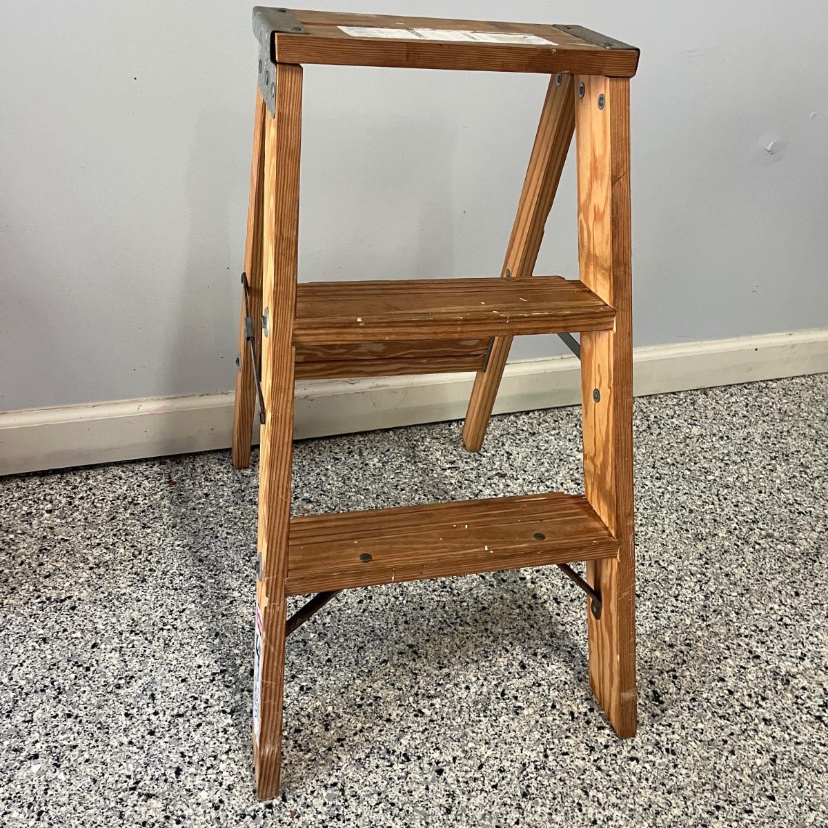 Lot contains a plastic Husky toolbox with contents that includes screwdrivers, pliers, hammers and assorted hardware. Also includes a Ryobi electric drill, wooden two step ladder, bulbs, twine NIB soldering iron and more. Toolbox measures 16” x 9” x 8.5”H. Drill powered on when trigger pulled.