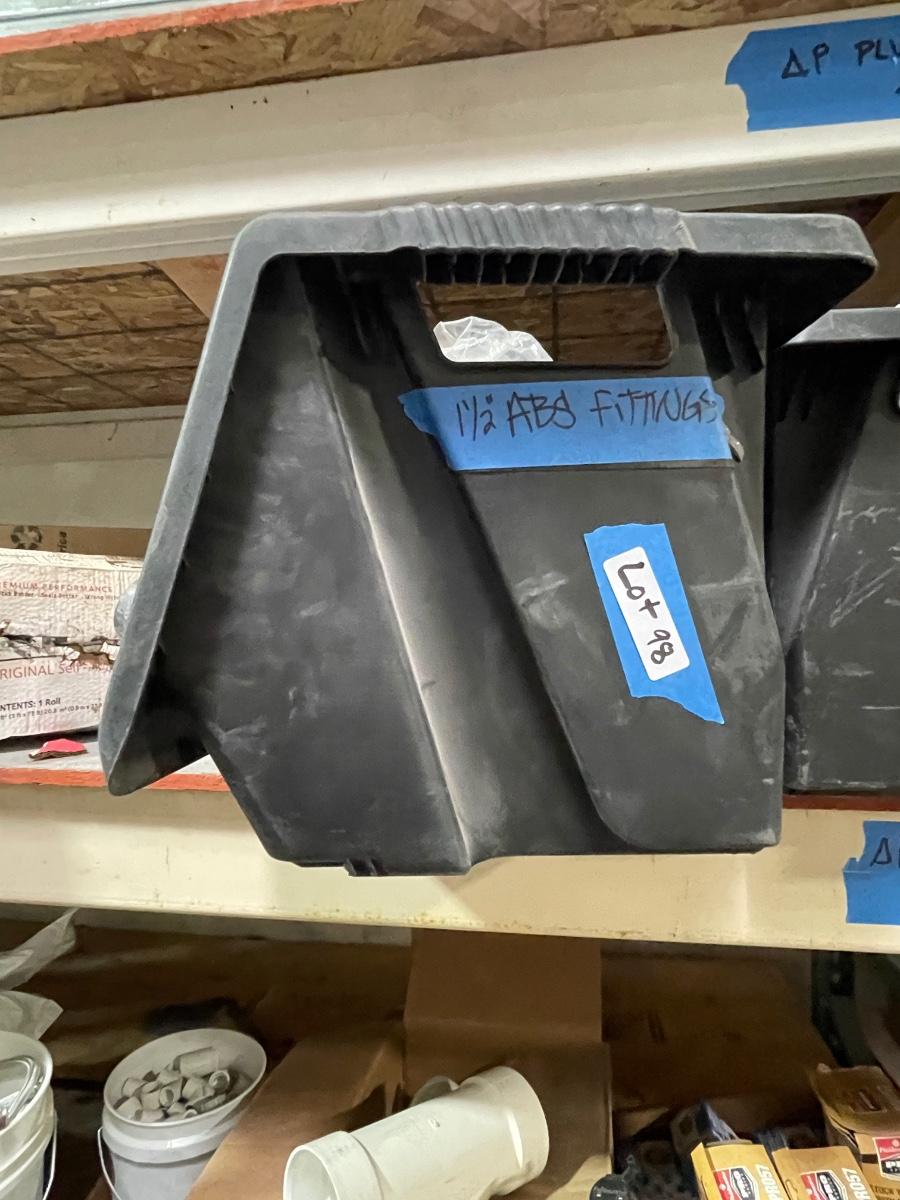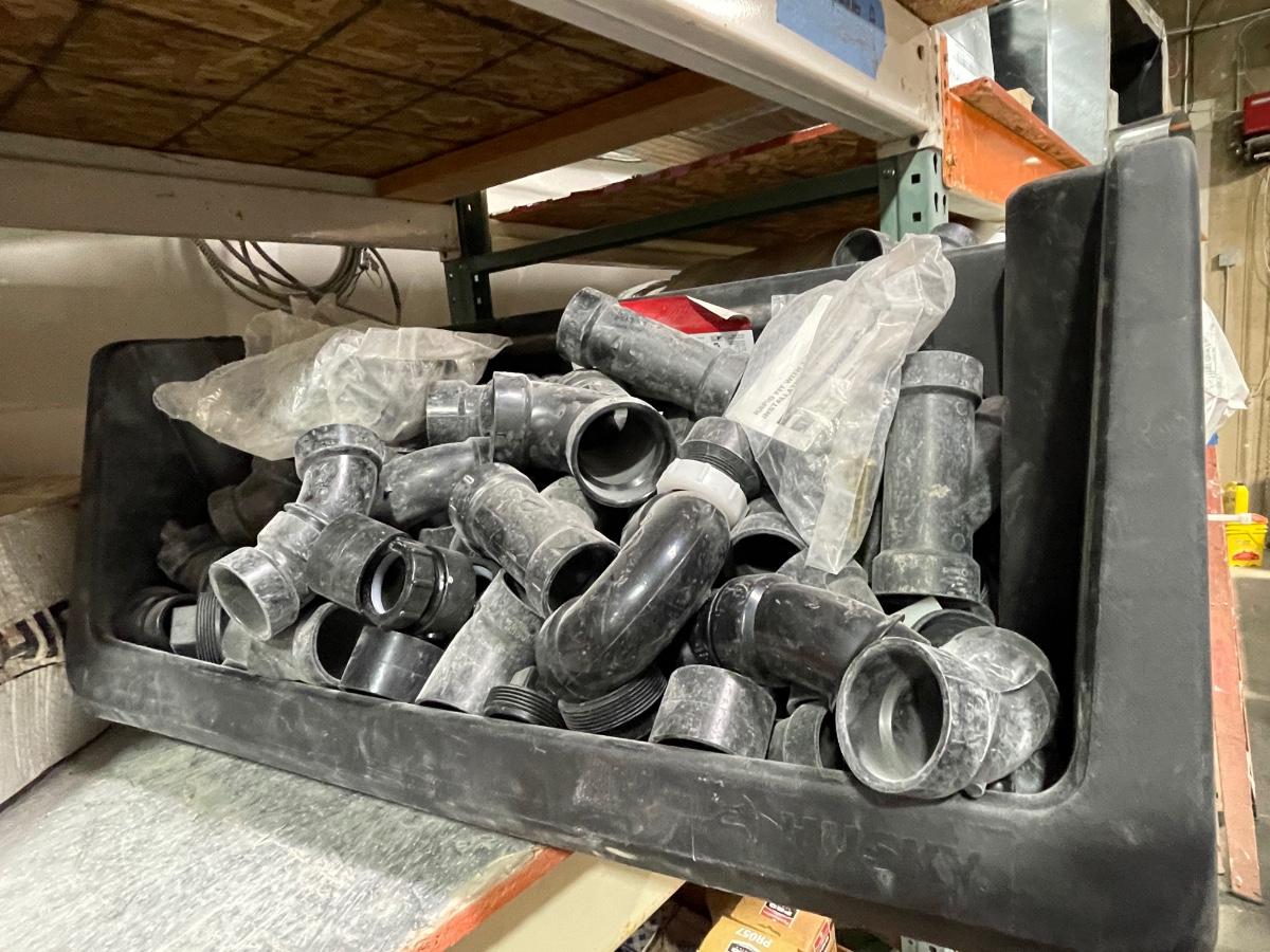 see photos - 1-1/2" ABS Fittings in nice black Husky storage bin/tub - The Bin itself is a nice piece for easy open storage/access