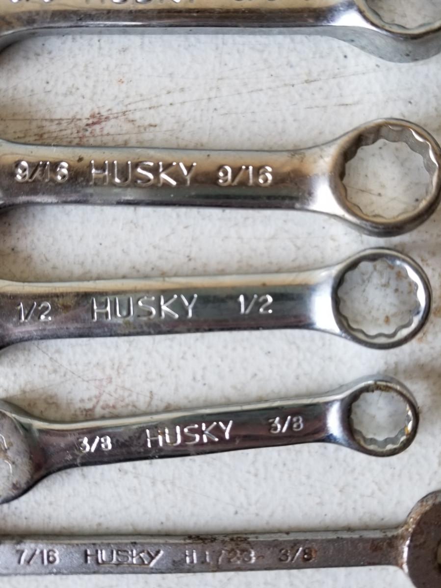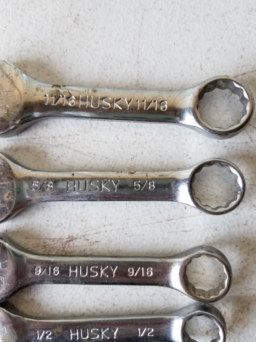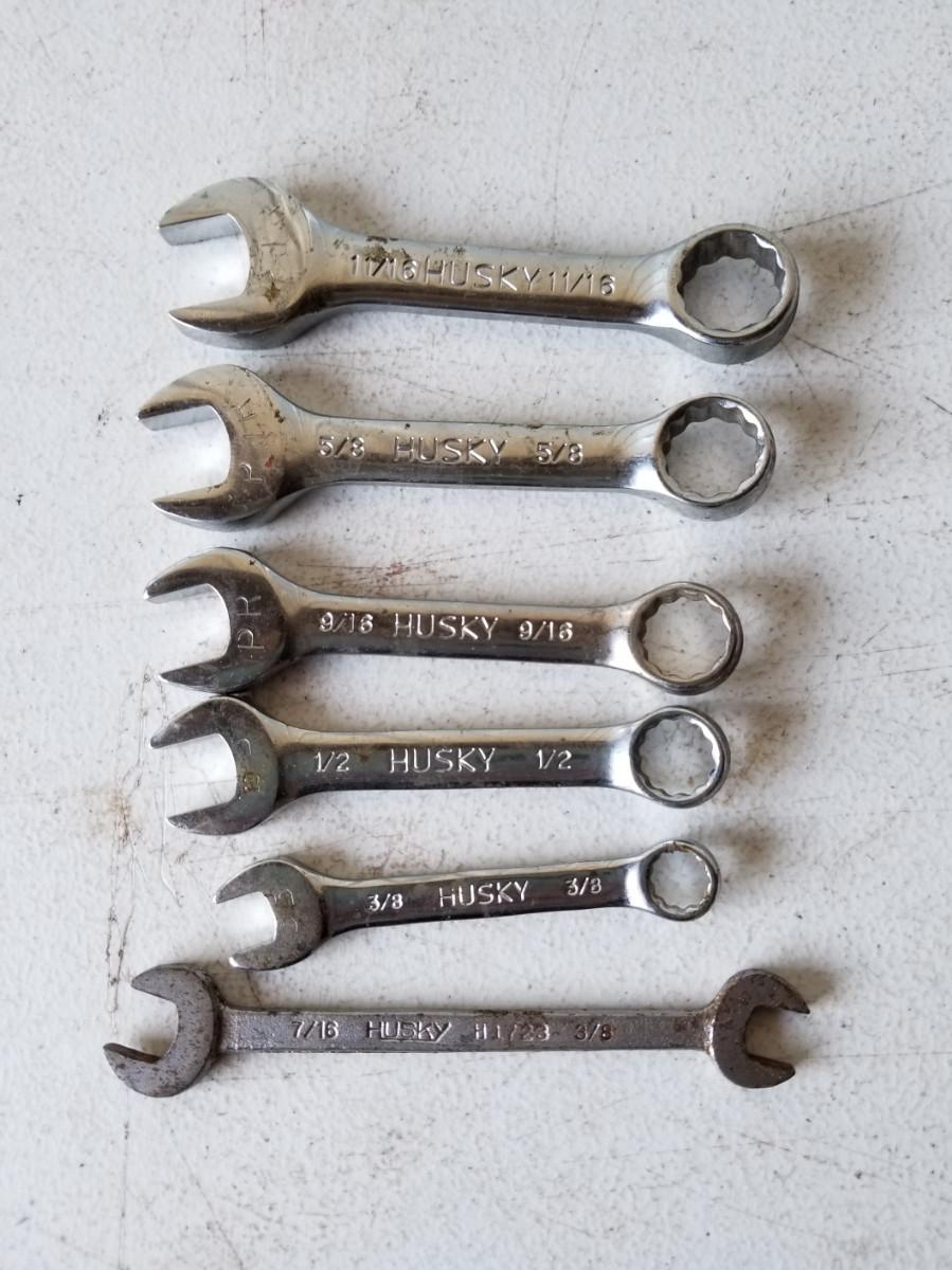 Lot includes 5 combination wrenches and one double headed open end wrench. Combination wrenches are in sizes 3/8", 1/2", 9/16", 5/8", and 11/16". Double open end wrench in sizes 3/8" and 7/16".