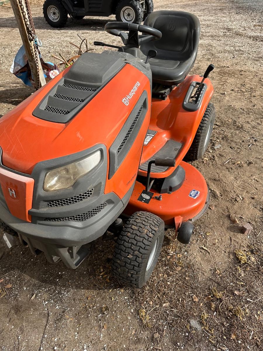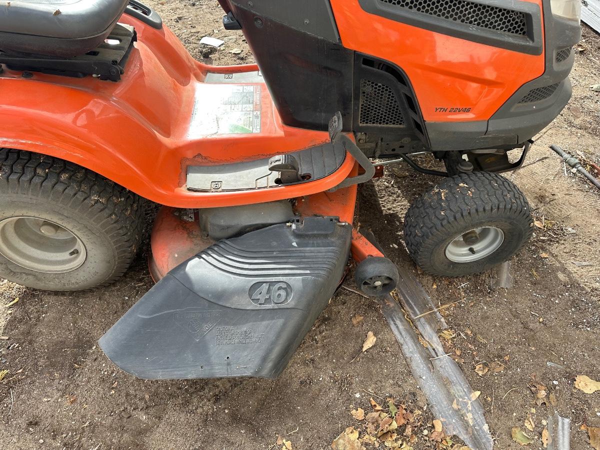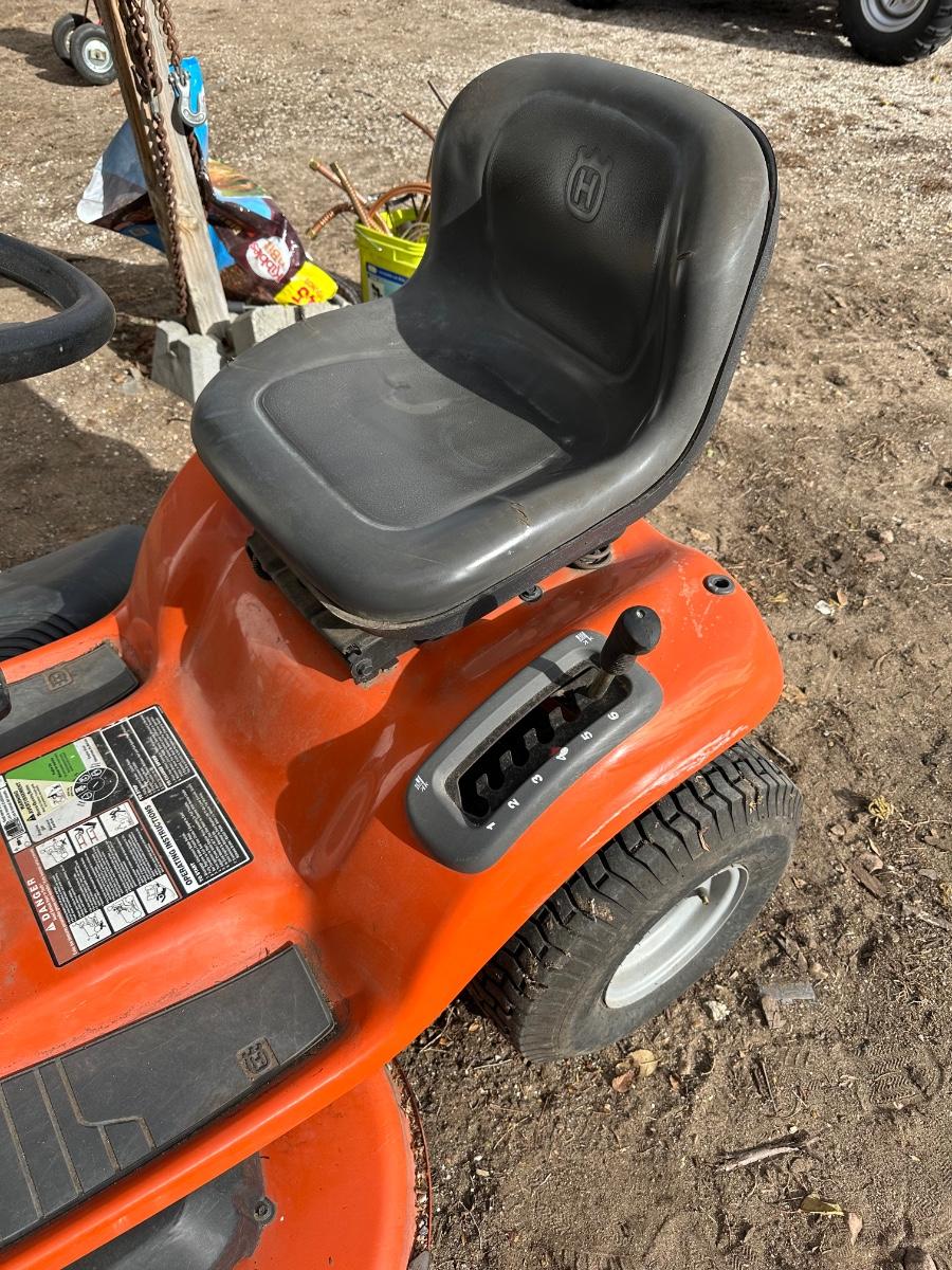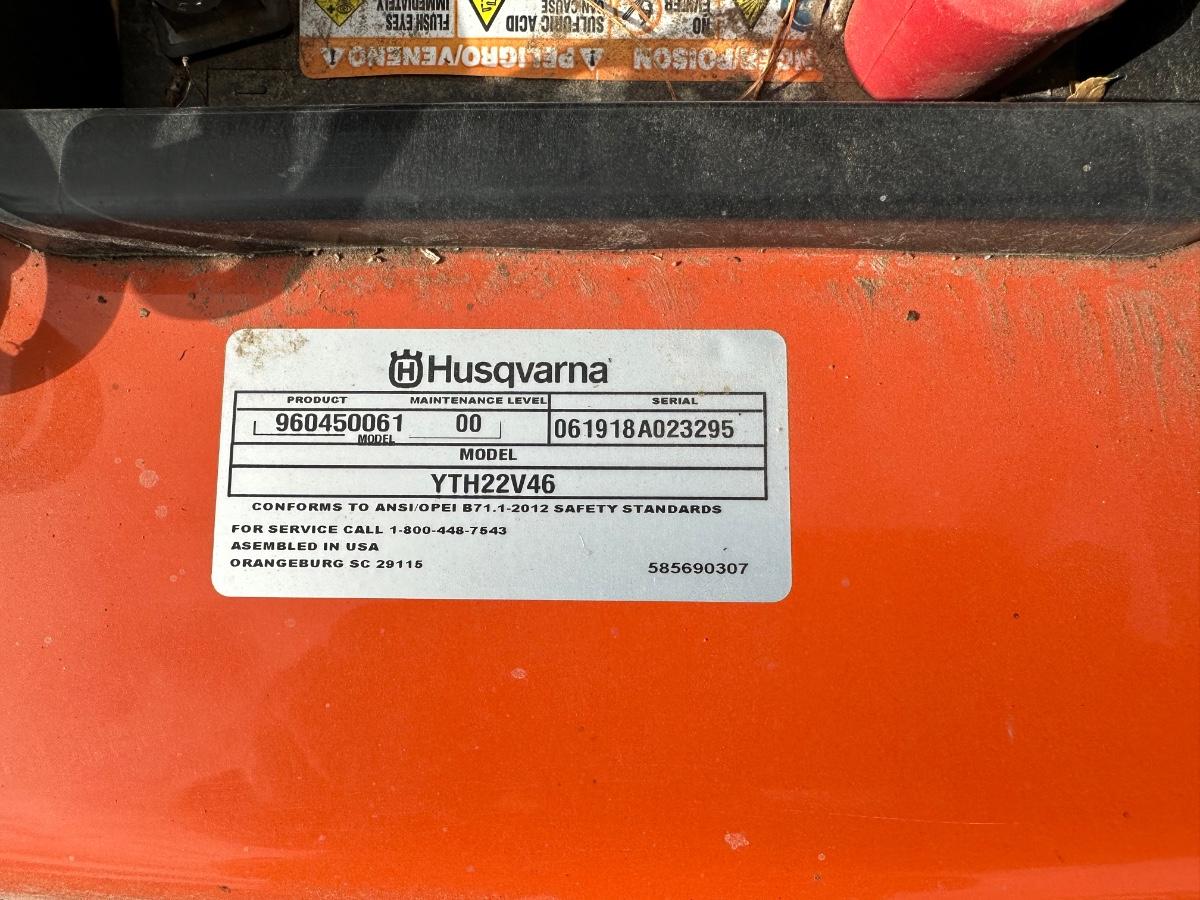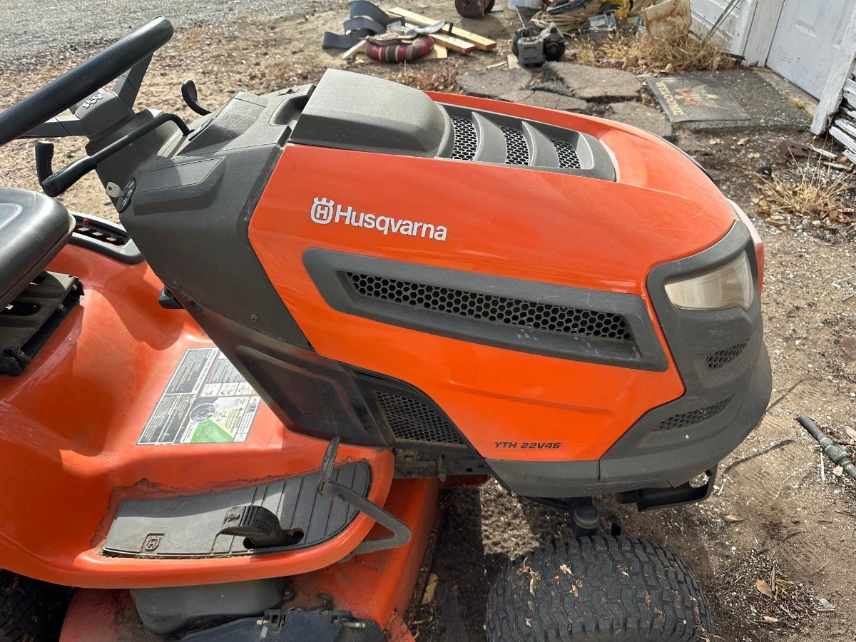 Husqvarna YTH22V46 riding lawnmower. It is in good condition with a few small cracks on the seat (see picture). This lawnmower has air induction mowing technology for excellent cutting performance. Has cruise control, pedal-operated hydrostatic transmission, fender-mounted cutting height adjustment, adjustable sliding seat when seated, dual draglinks, deck wash port, ergonomic steering wheel, safety switch under the seat, reverse operating system for safety, manual blade engagement, easy-access fuel cap, high back seat, reinforced cutting deck, headlights, powder coated cutting deck, cup holder, cast iron front axle for superior steering, anti scalp wheels and much more. See pictures for specifications on this lawnmower.